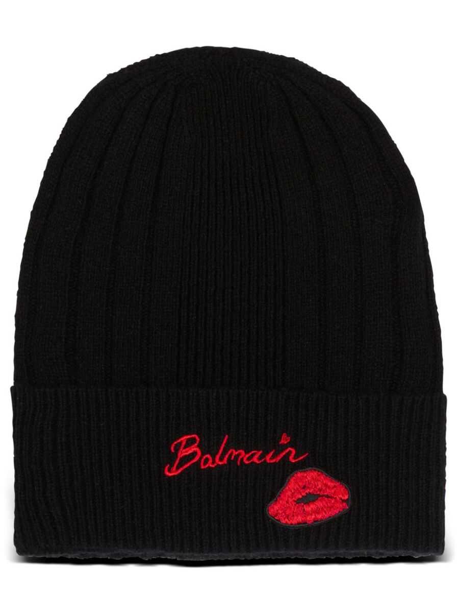 - Balmain - Kiss beanie - Made of cashmere and wool - Red front embroidery - Black - Ribbed design - Men