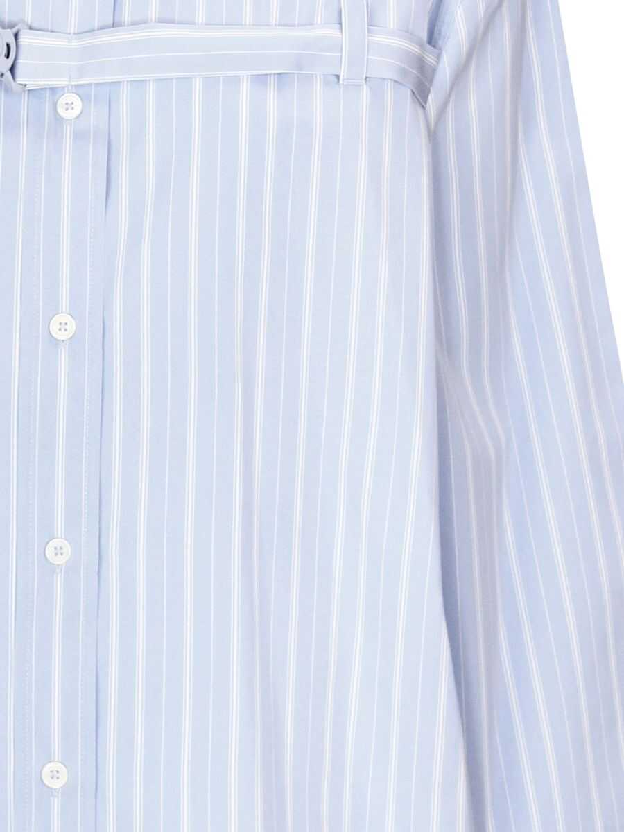 Light blue/white cotton poplin texture vertical stripe print buckled strap detailing cut-out detailing classic collar front button fastening long sleeves buttoned cuffs harness detail at front open back curved hem