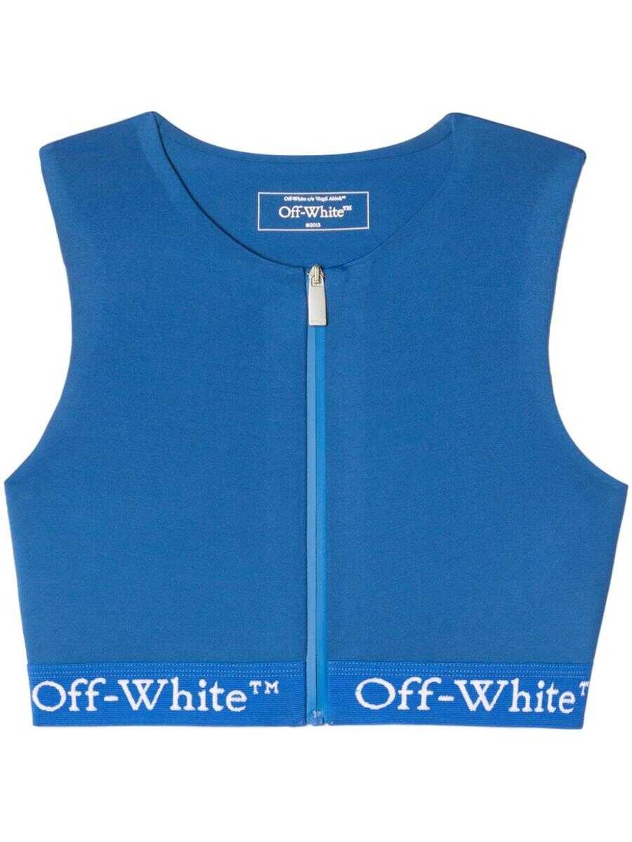 cobalt blue recycled nylon blend soft scuba jersey logo underband crew neck front zip fastening sleeveless elasticated underband cropped straight hem
