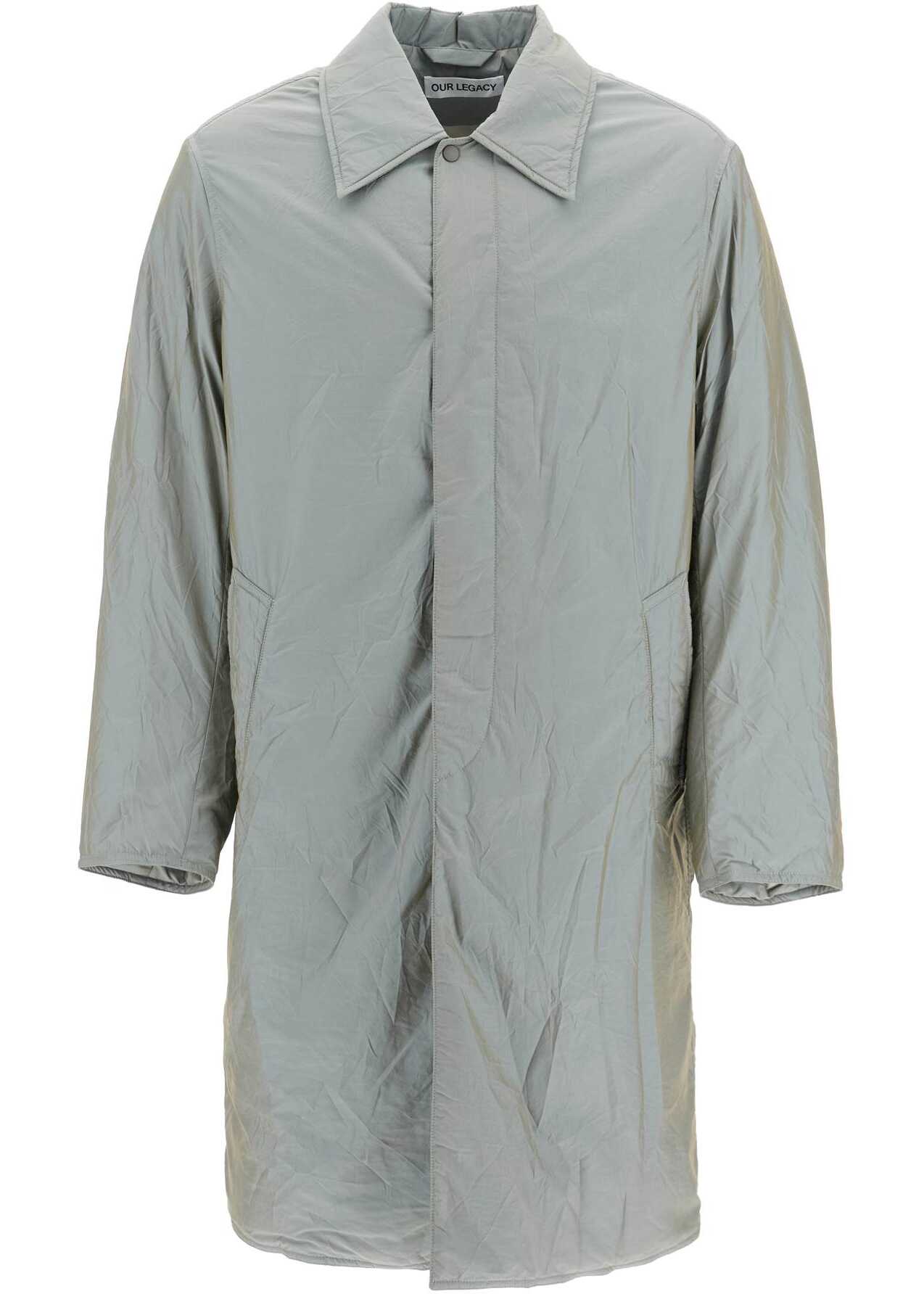 The long Blithe coat by Our Legacy is made of technical fabric with a shimmering finish and crinkled effect. The design features a straight, regular cut with classic car coat details such as the pointed collar and hidden button closure. Slightly padded and lined with iridescent fabric. The model is 182 cm tall and wears size IT 48.