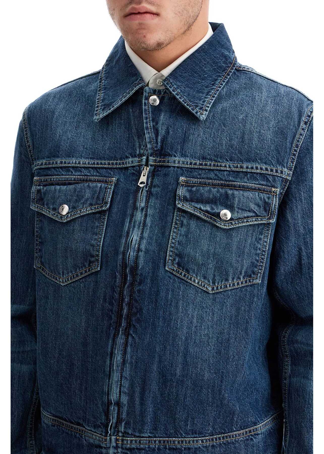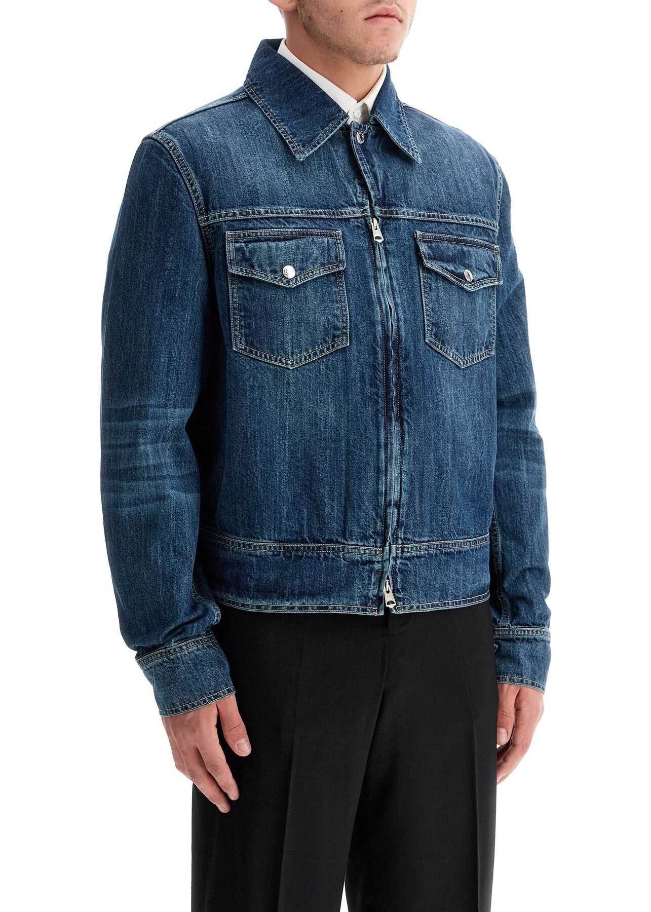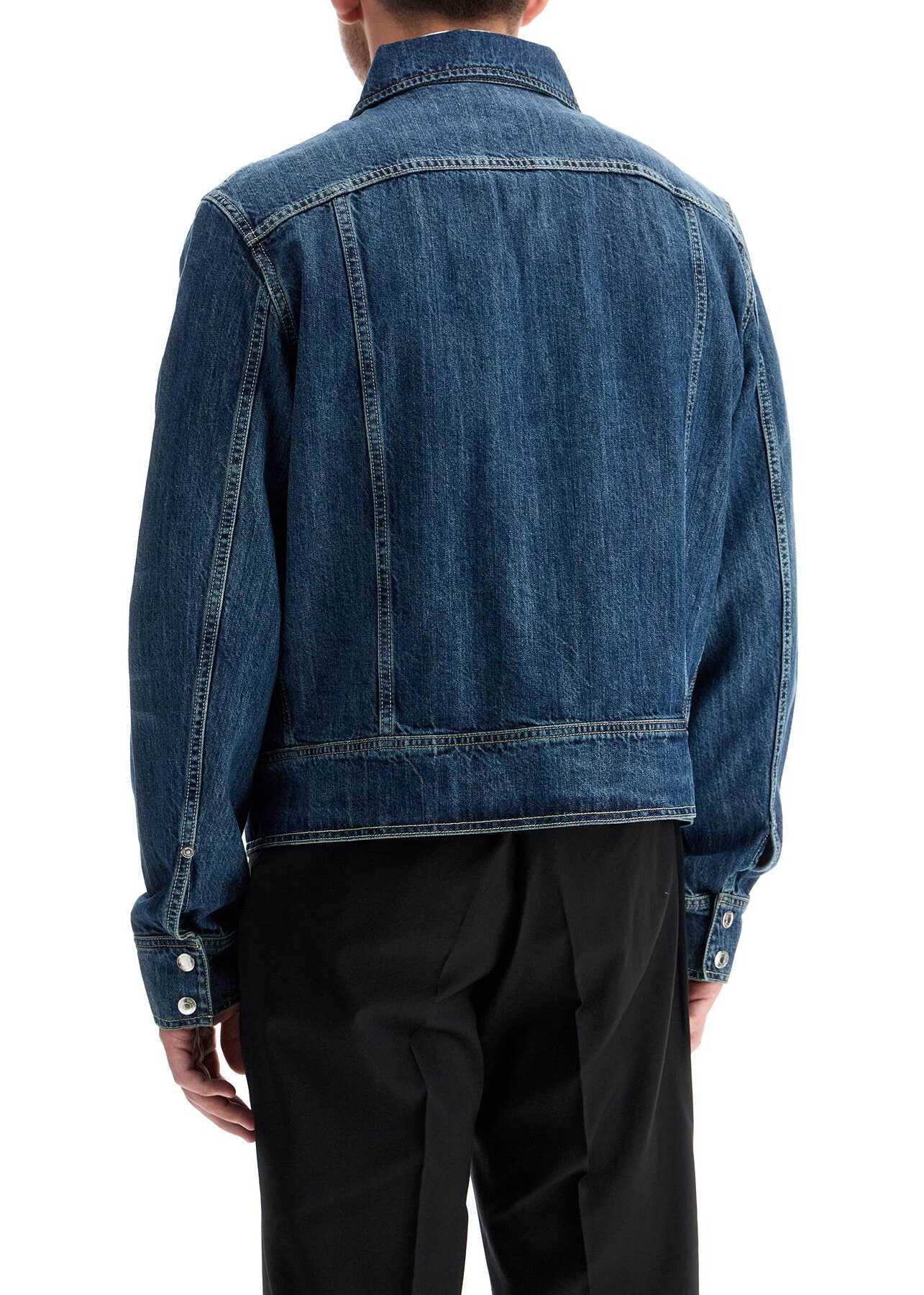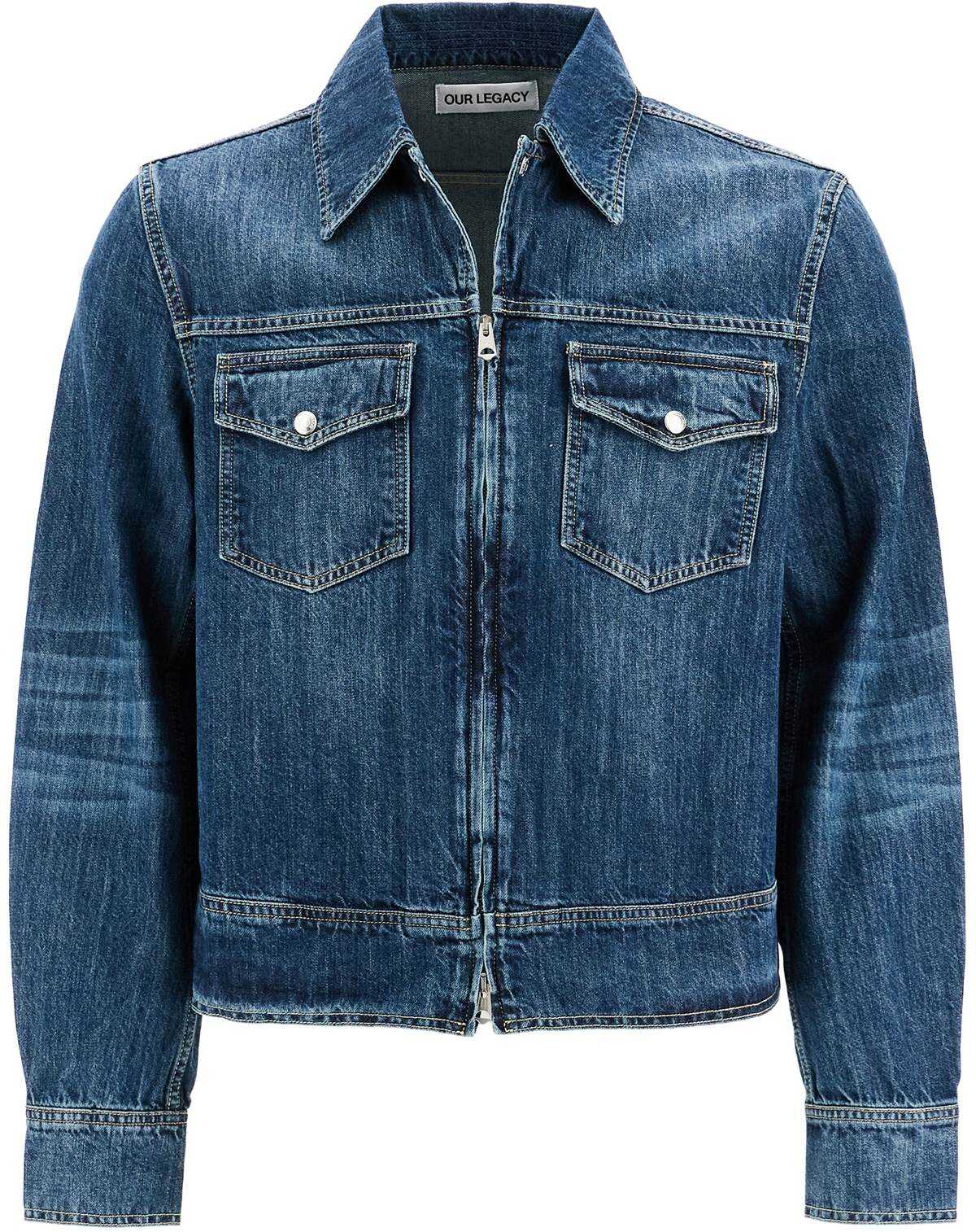 Our Legacy Trucker Jacket is made from pure cotton denim with a vintage effect and features a short, regular fit. It has a pointed collar, double zip closure, chest pockets with buttoned flaps, and is finished with a PVC logo patch on the back. The model is 182 cm tall and wears size IT 48.