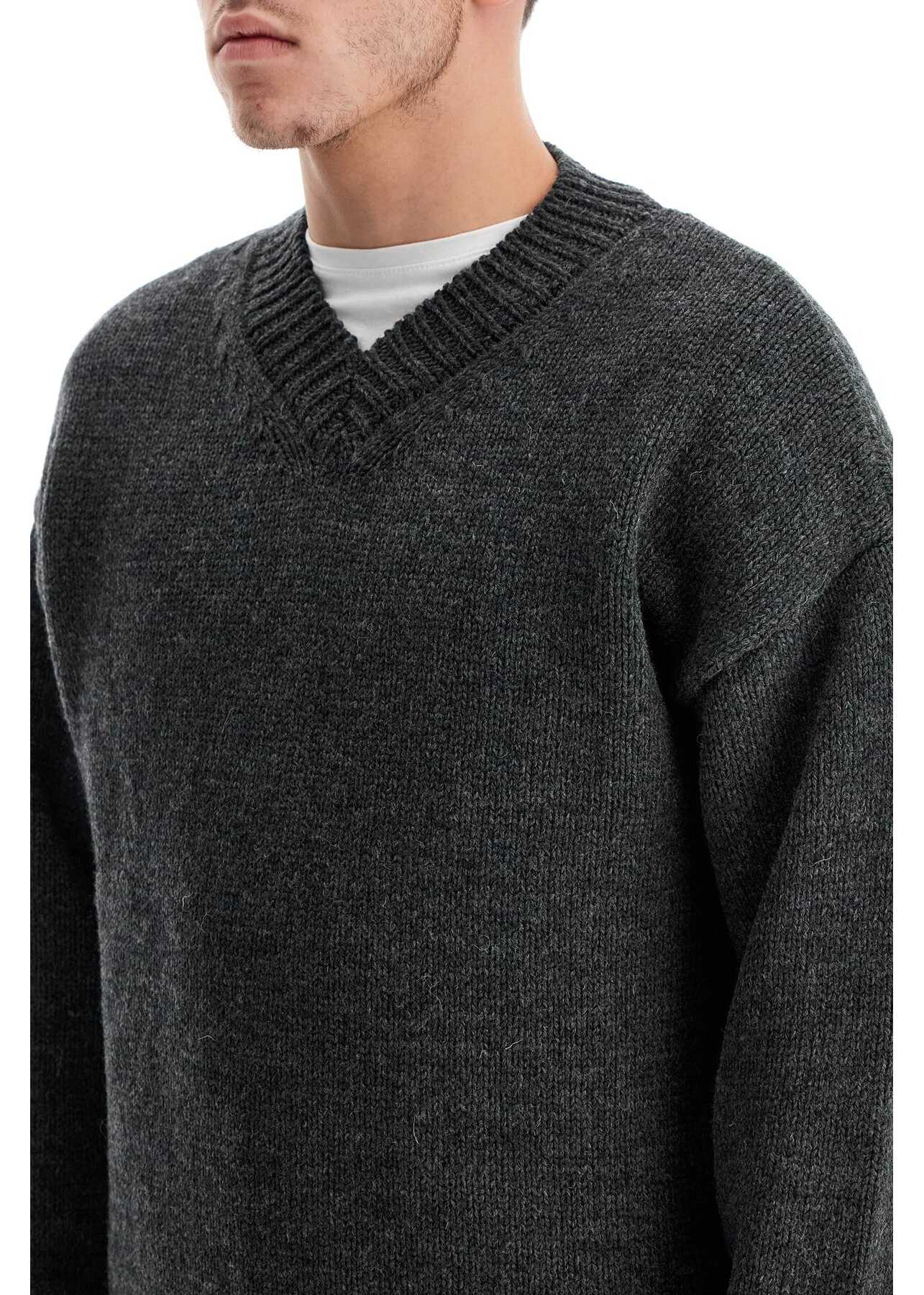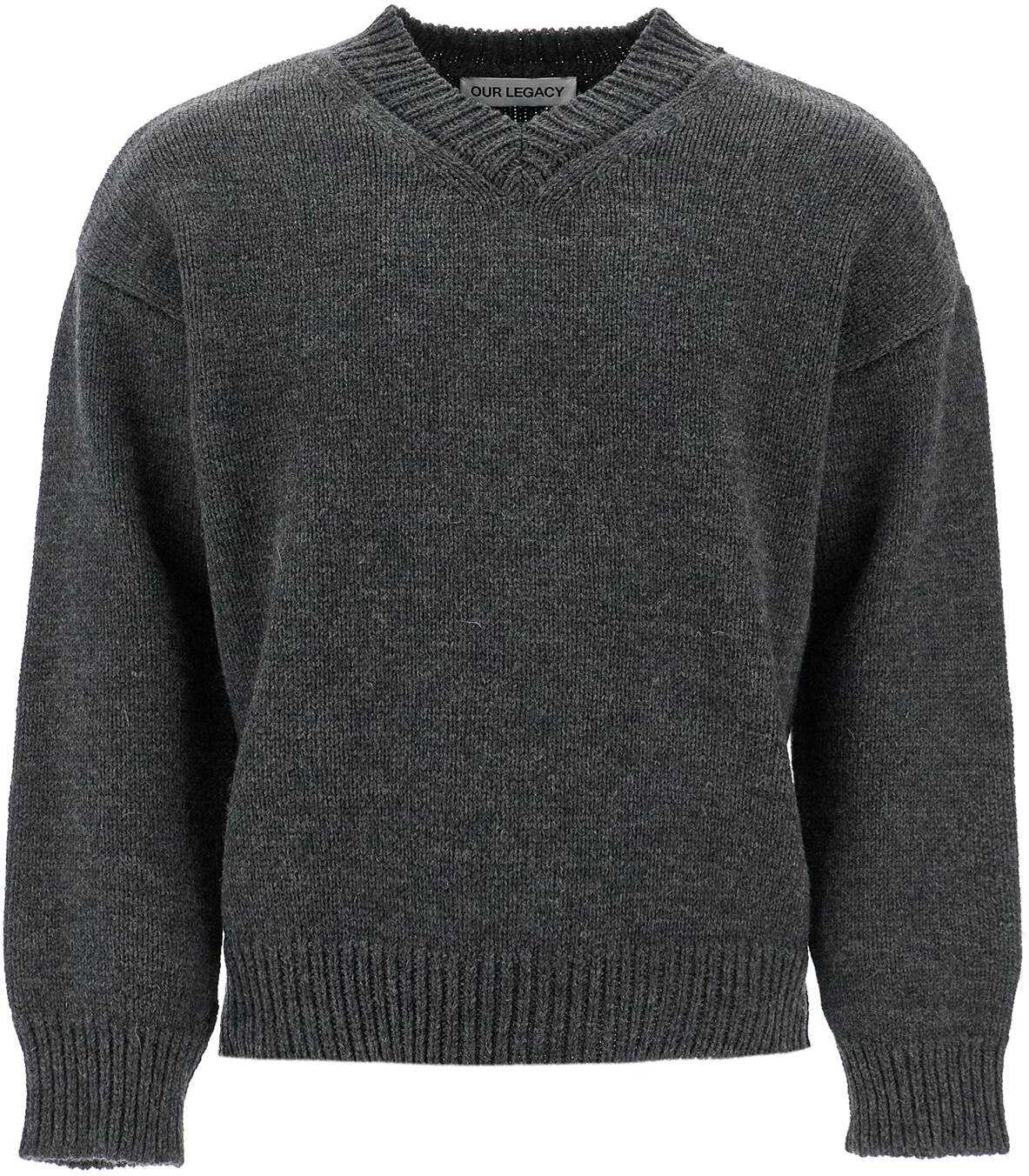 This Our Legacy pure wool pullover is characterized by an oversized boxy cut with a V-neck and ribbed edges. The model is 182 cm tall and wears size IT 48.