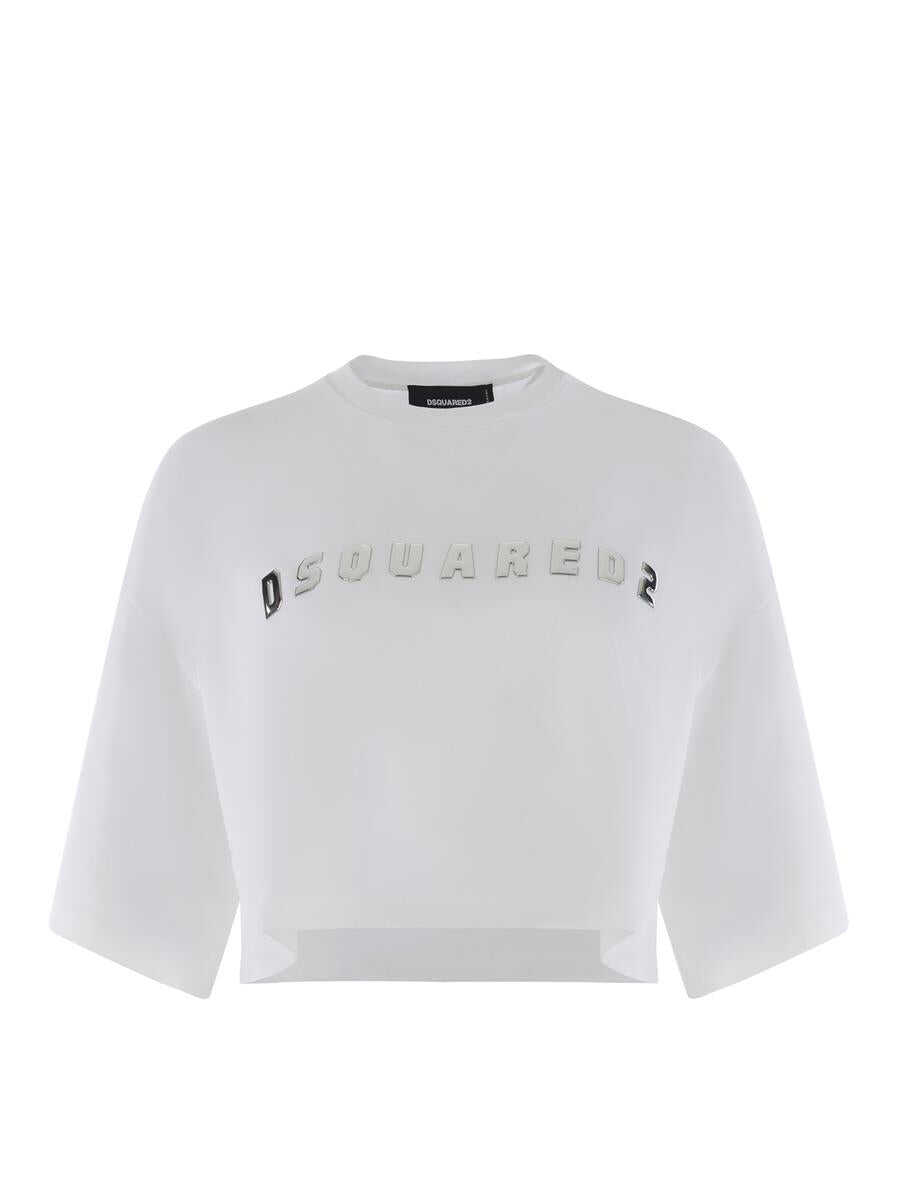Crop t-shirt Dsquared2 made of cotton jersey in White. Ribbed crewneck. Short sleeves. Dropped armholes. Contrasting "Dsquared2" lettering logo in Silver. Over fit.