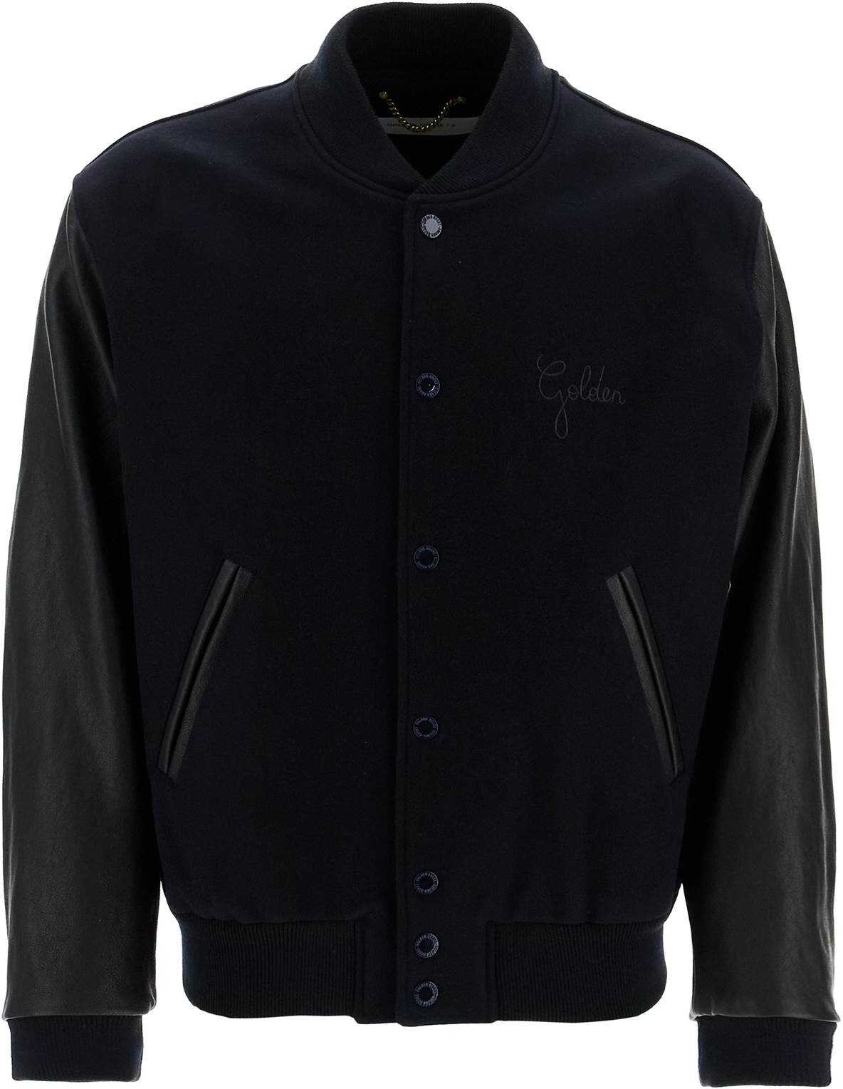Golden Goose bomber jacket crafted in virgin wool blend cloth with sleeves and trims in contrasting leather. It features crew neck, cuffs and hem in ribbed knit, snap-button fastening and slanted welt pockets. Branded with tonal logo embroidery on the chest and metal stars on the upper back. Lined and provided with pockets on the inside. Regular fit. The model is 182 cm tall and wears size IT 48.