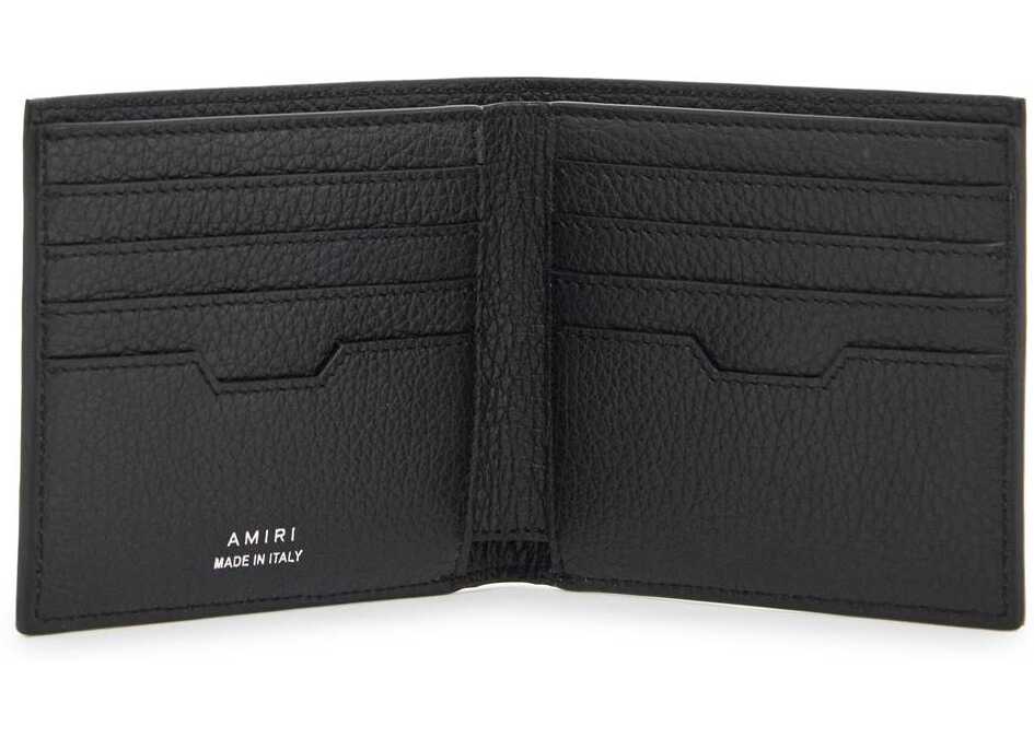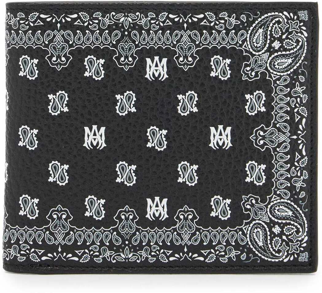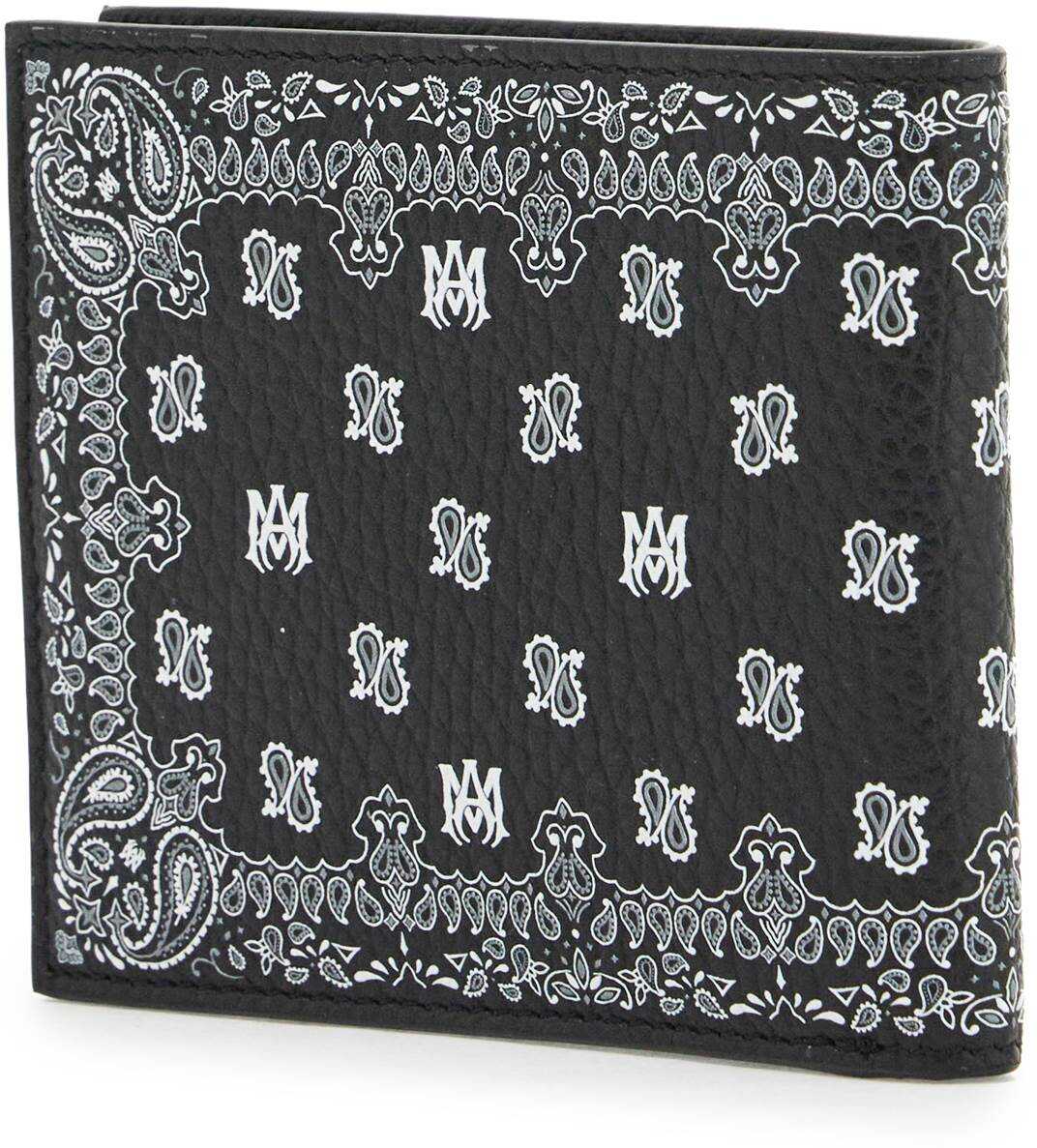 The Amiri bi-fold wallet is made of hammered leather with an all-over paisley pattern and micro monogram. It features a compartment for bills, eight credit card slots, and two slip pockets.