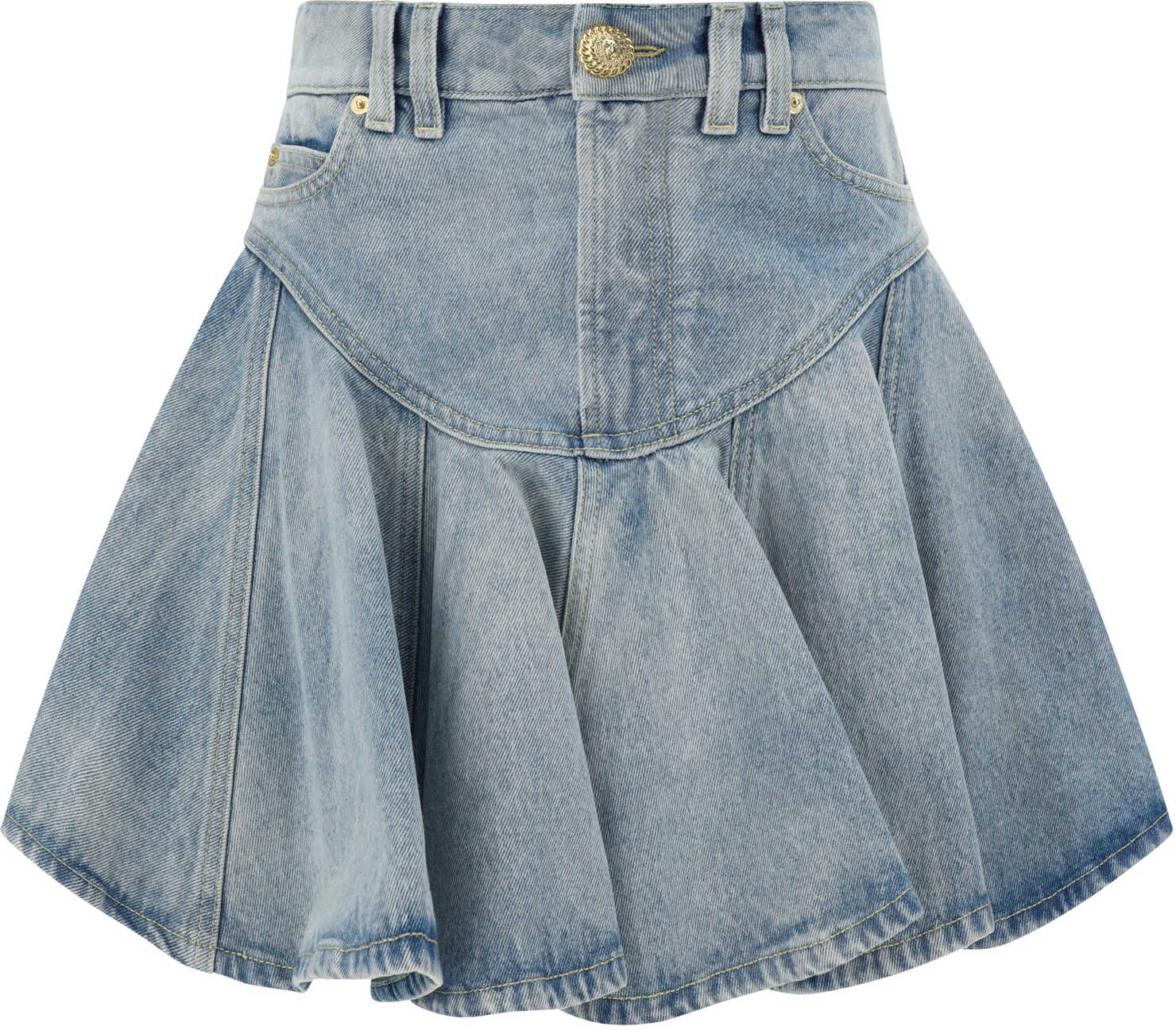 Denim Mini Skirt by Balmain, two side welt pockets, front zipper closure and iconic stud button, ruffle pattern, fitted fit.