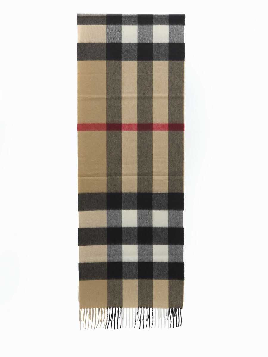 Cashmere scarf with all-over Mega Check motif. Fringed hems.