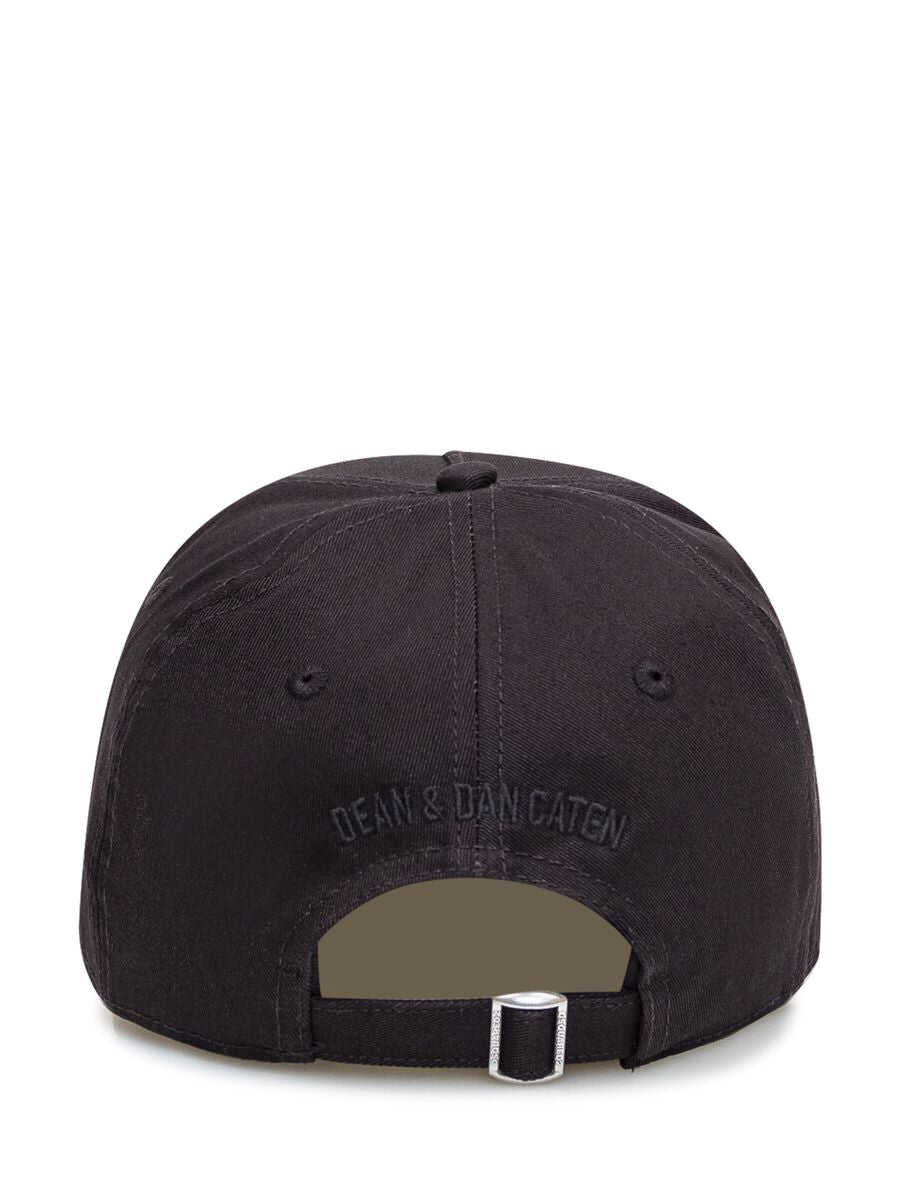 Black cotton hat with visor. Adjustable logo strap at back. Embossed Icon logo on front. Embroidery on the back. Worn effect.