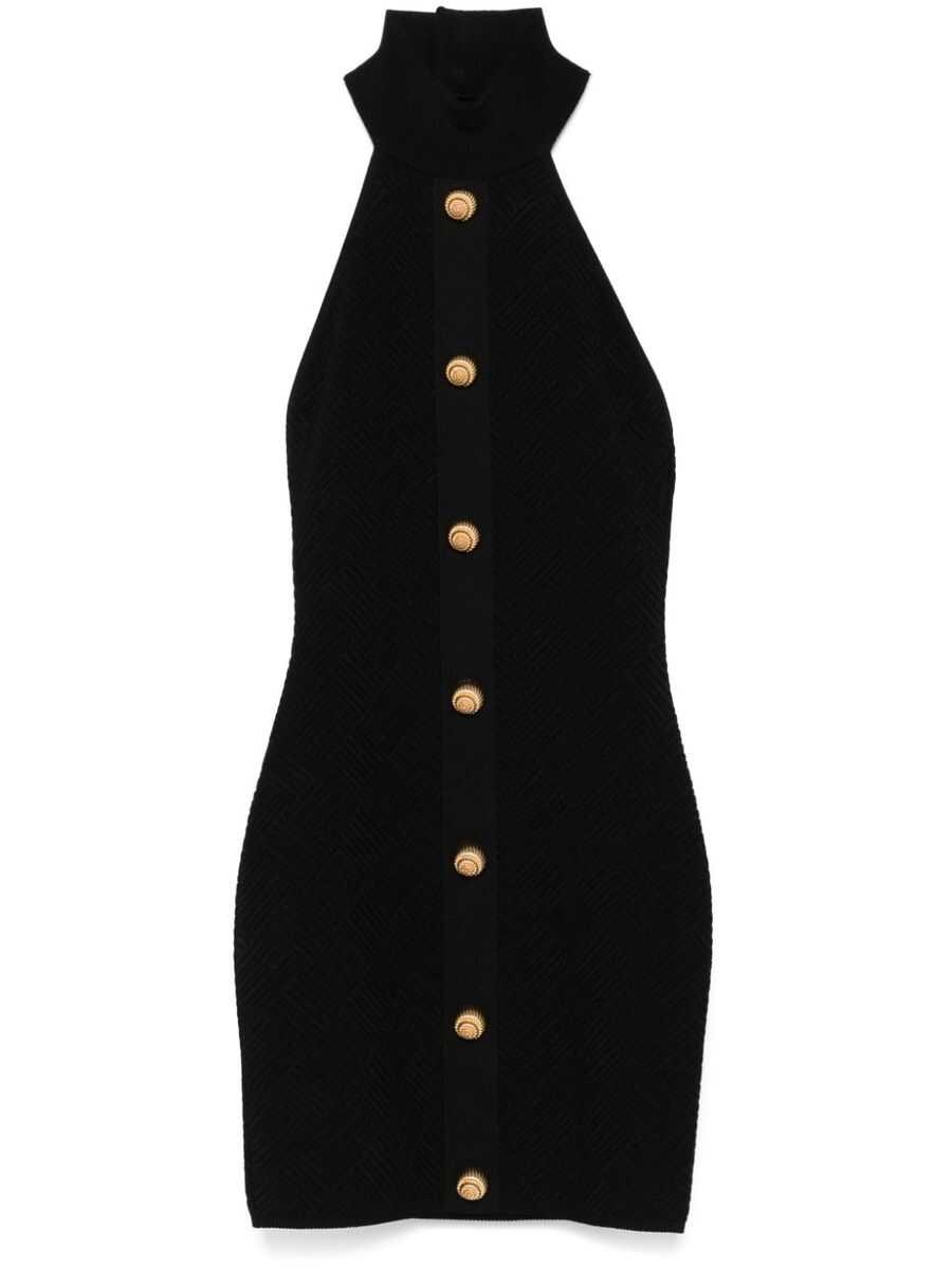 - Balmain - Short dress with buttons - Black - Knitted design - Halterneck - Back zip closure - Gold front buttons - Women's