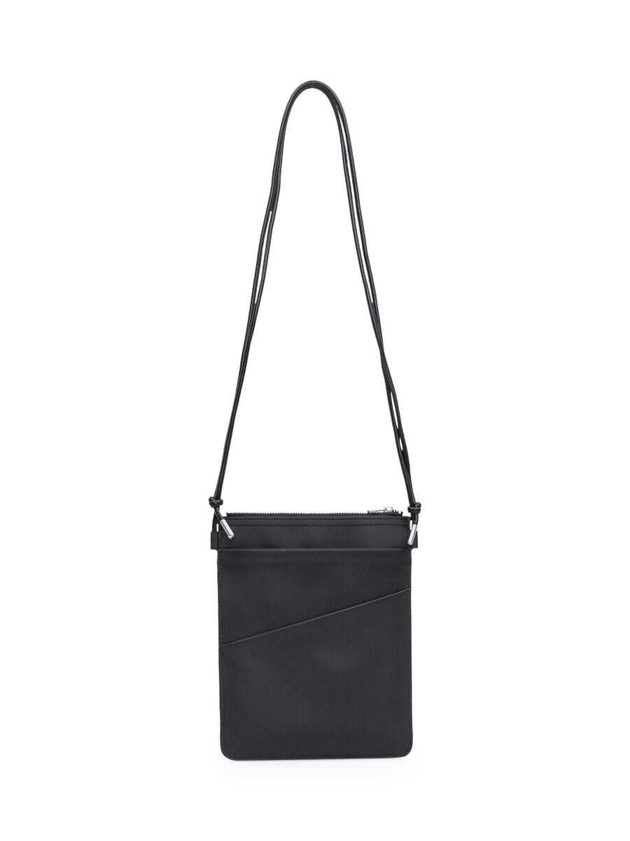 Black shoulder bag. Logo on front. Zipper closure. Exterior pockets. Width:17 Height:21 Depth:1