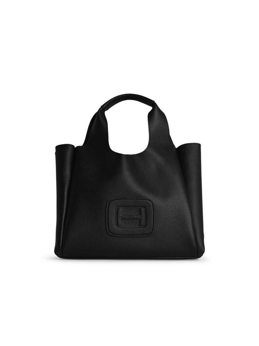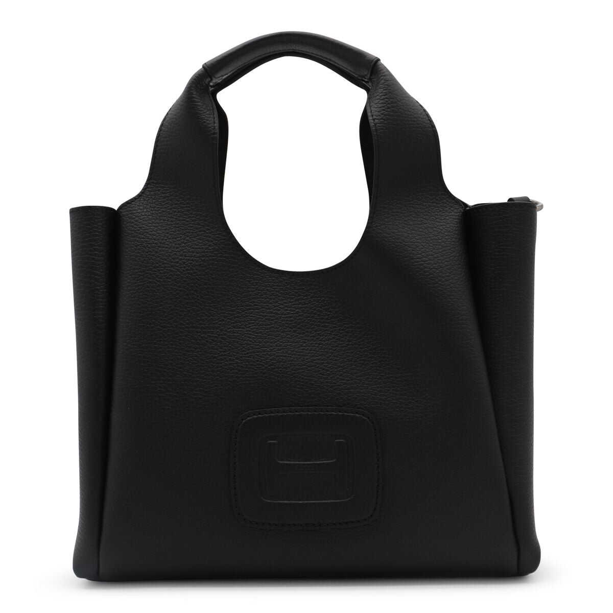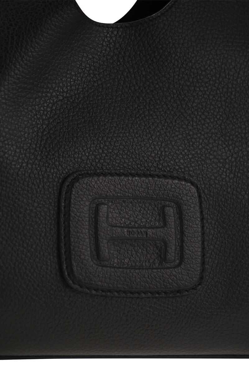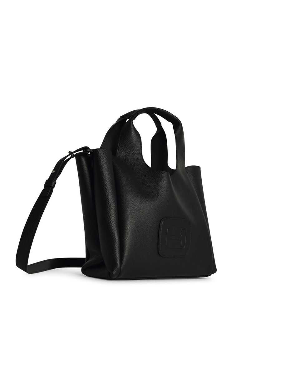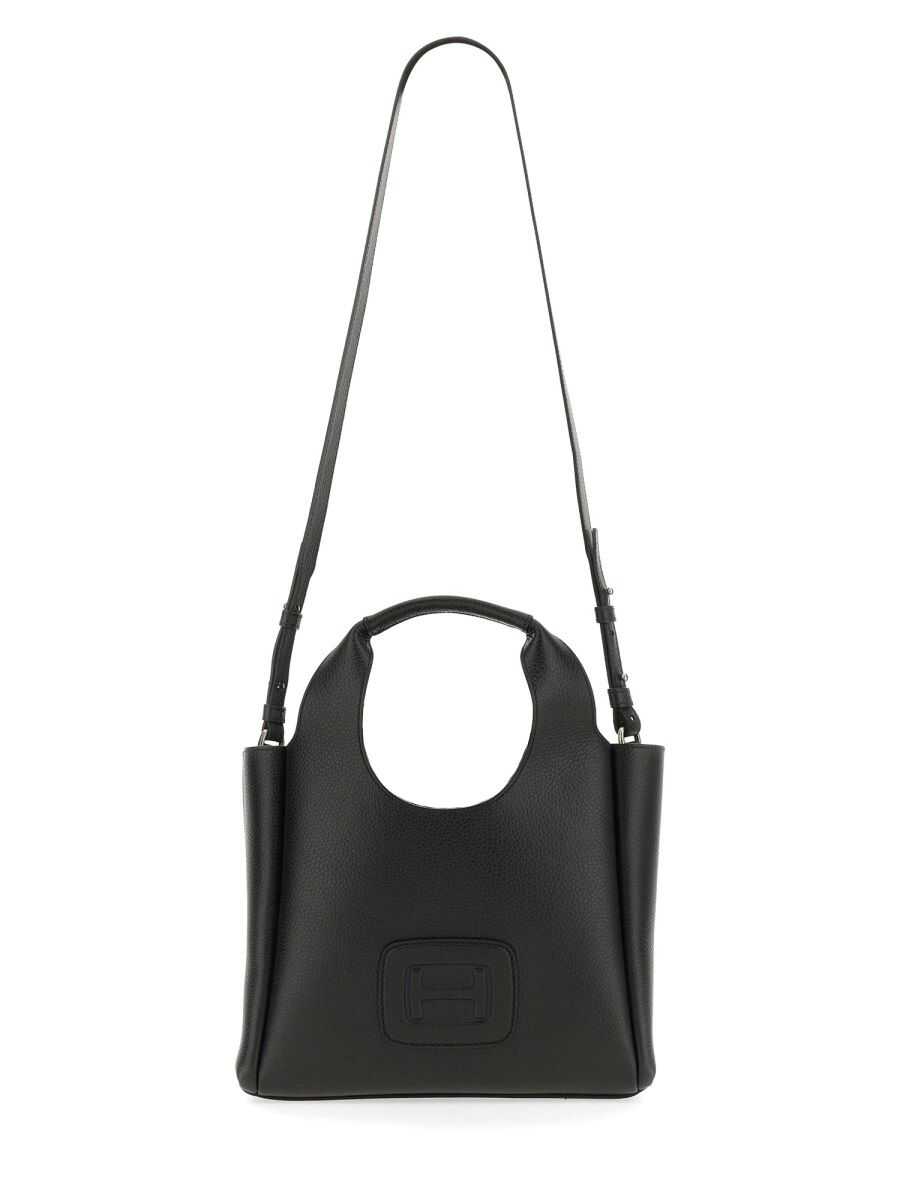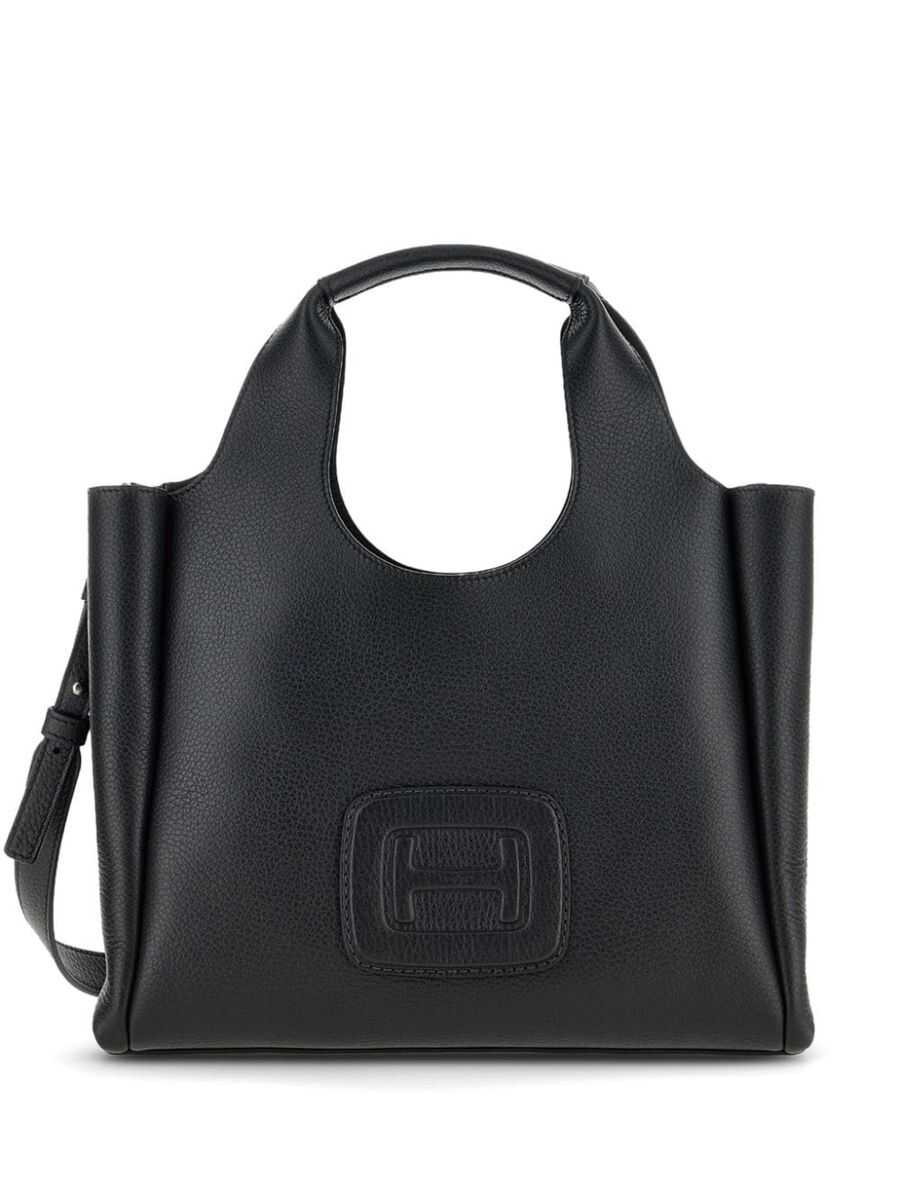 Black leather totes from Hogan featuring two hop handles, shoulder strap, frontal embossed and inside pocket.