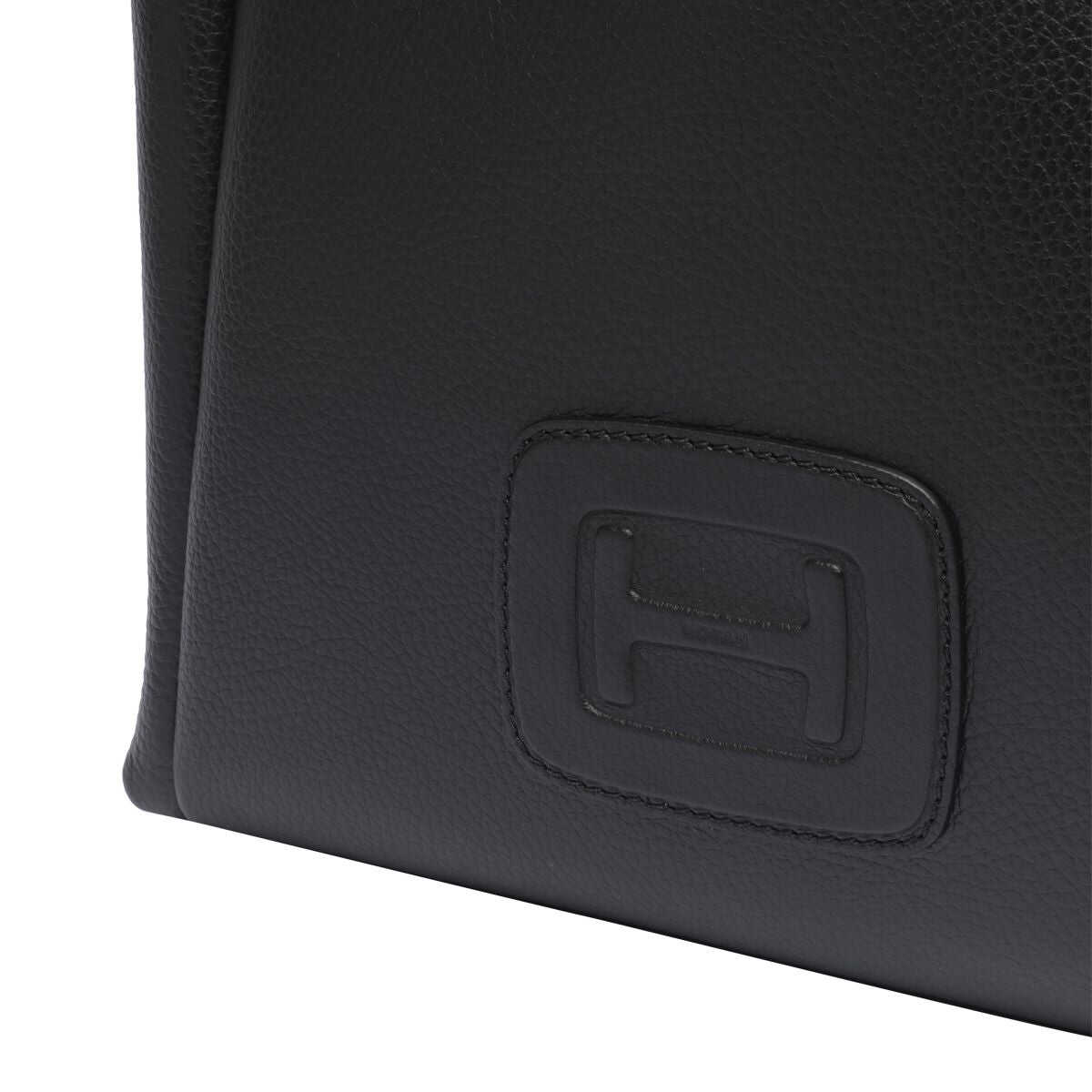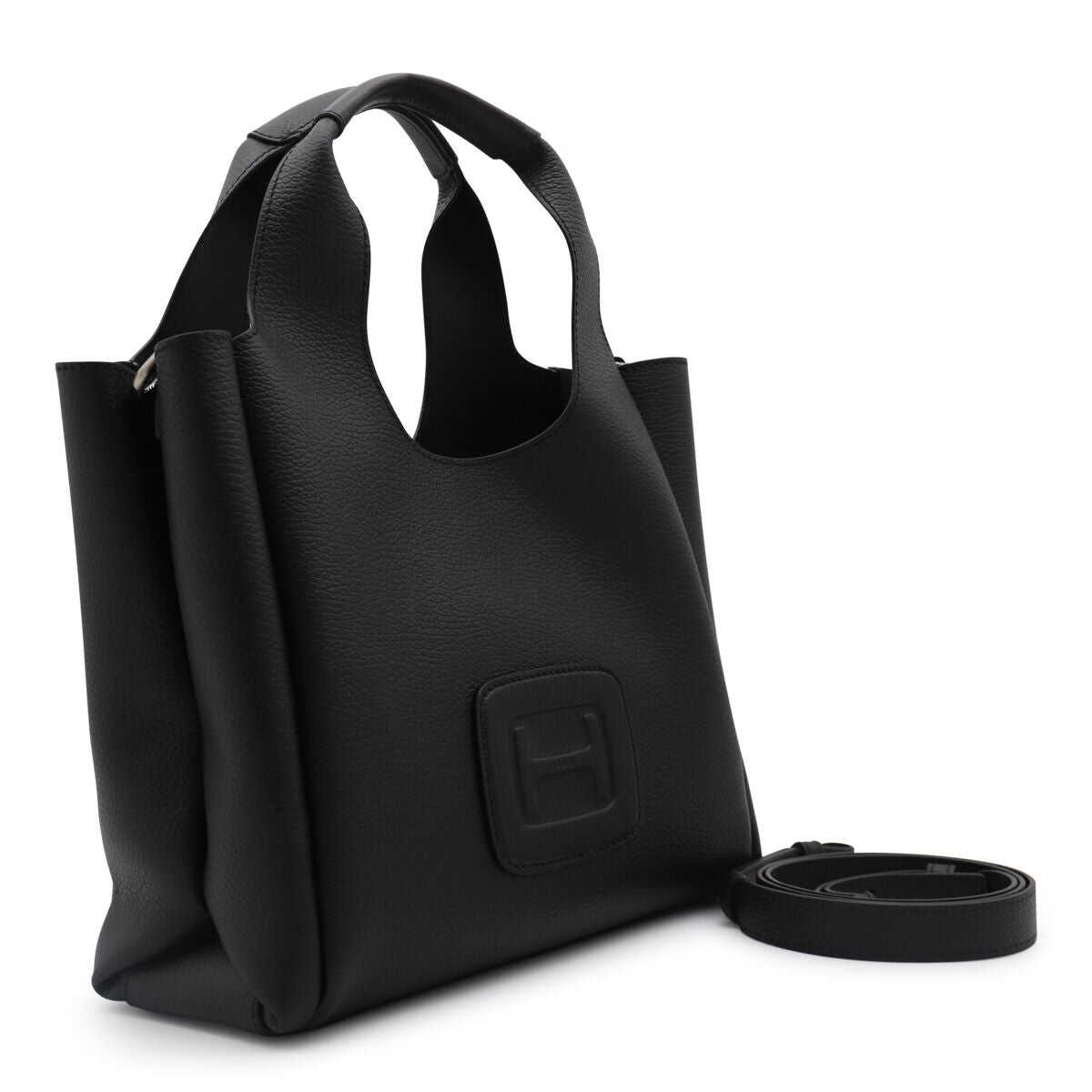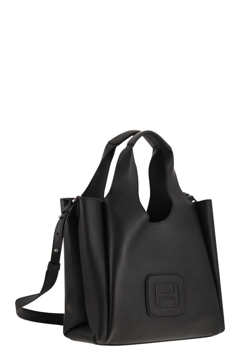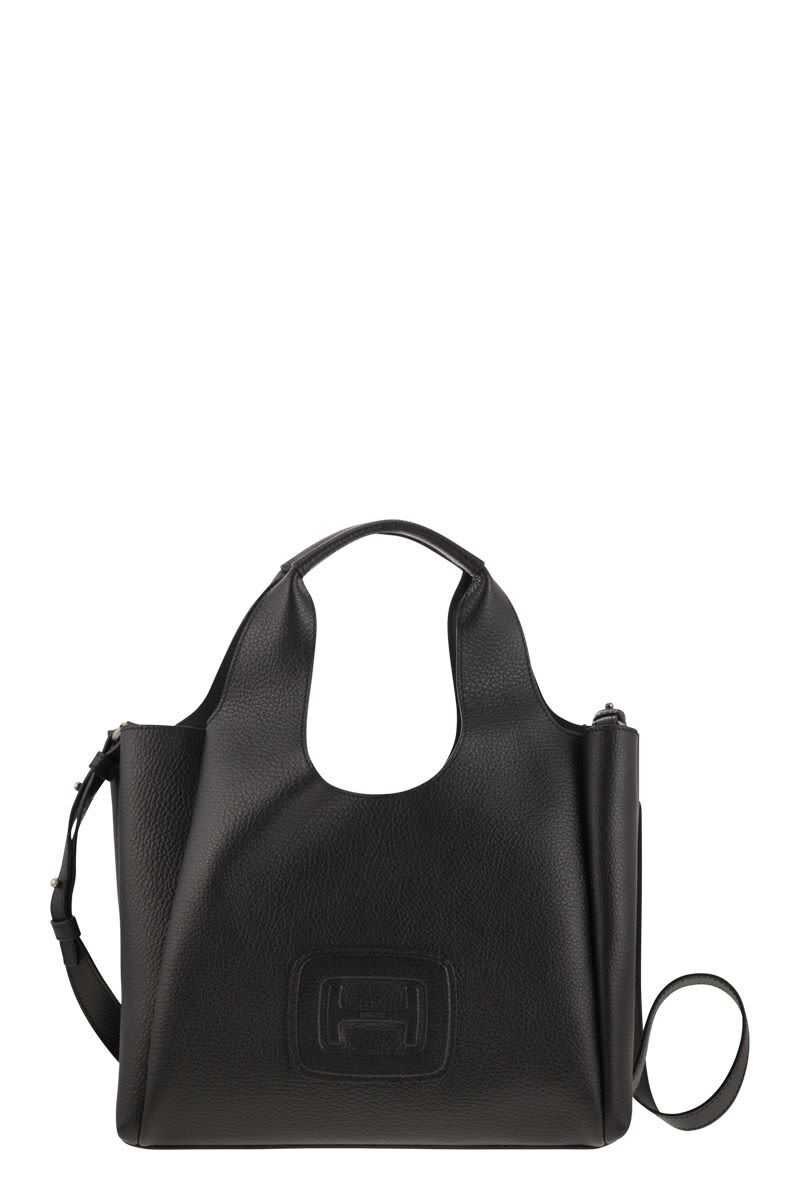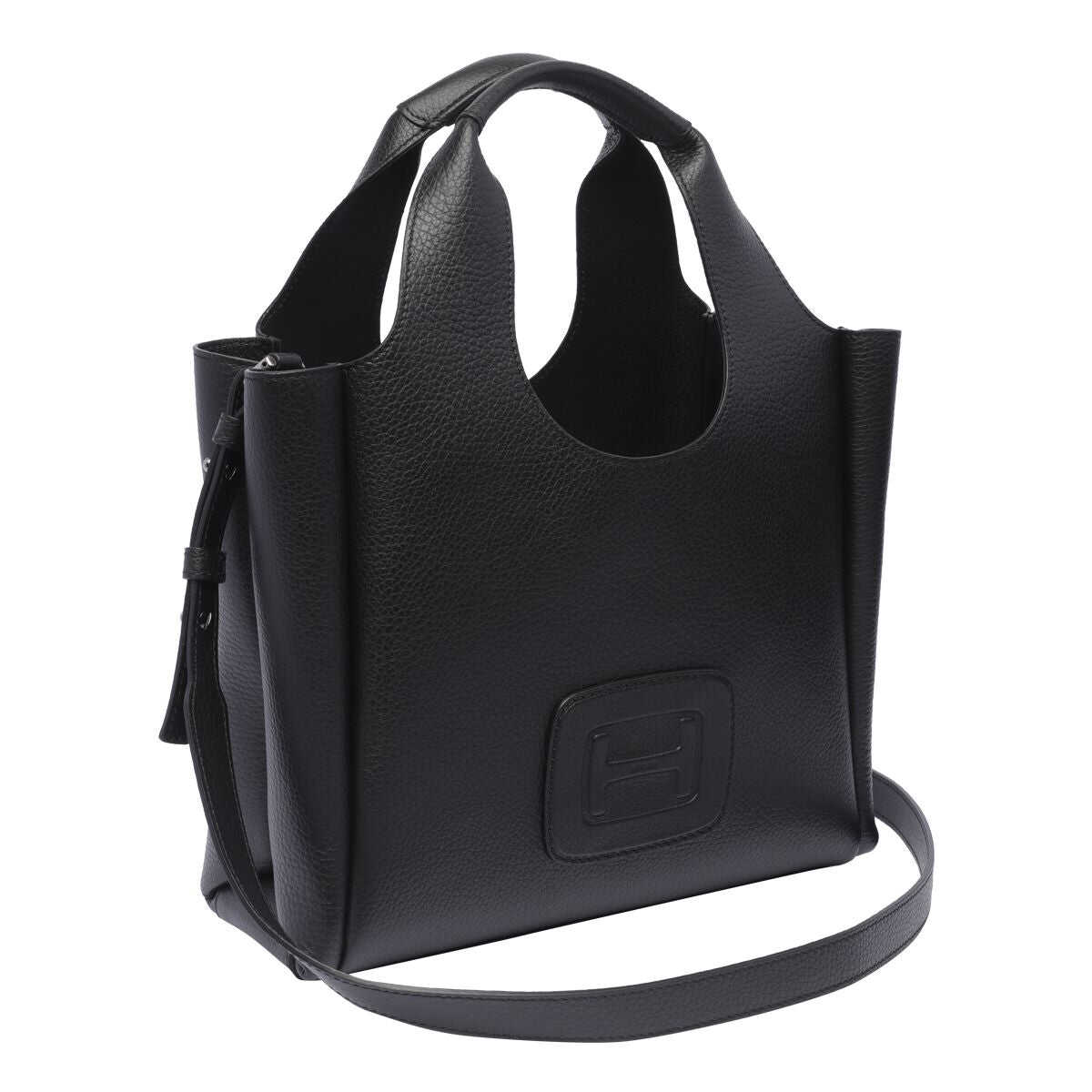 Black leather totes from Hogan featuring two hop handles, shoulder strap, frontal embossed and inside pocket.