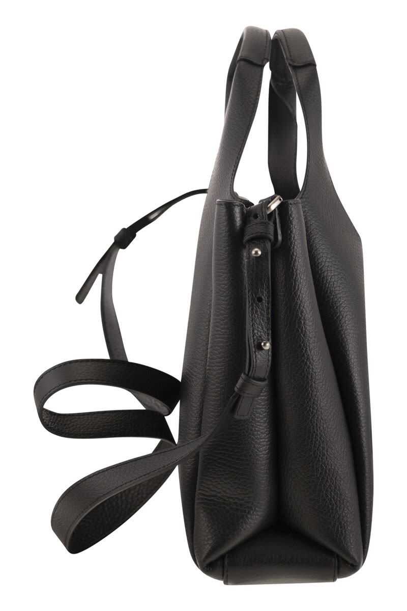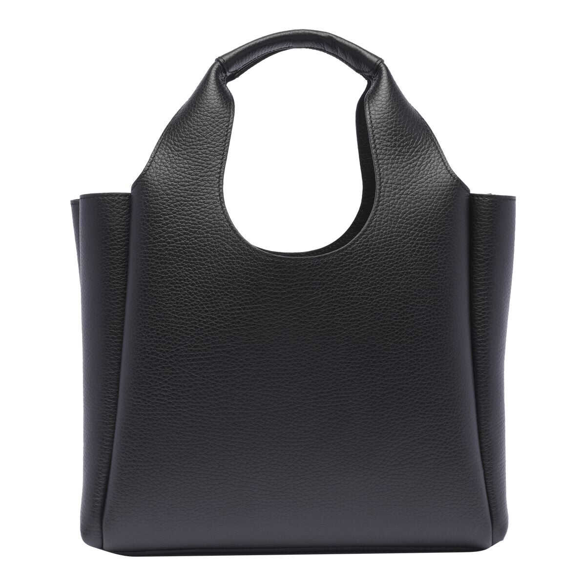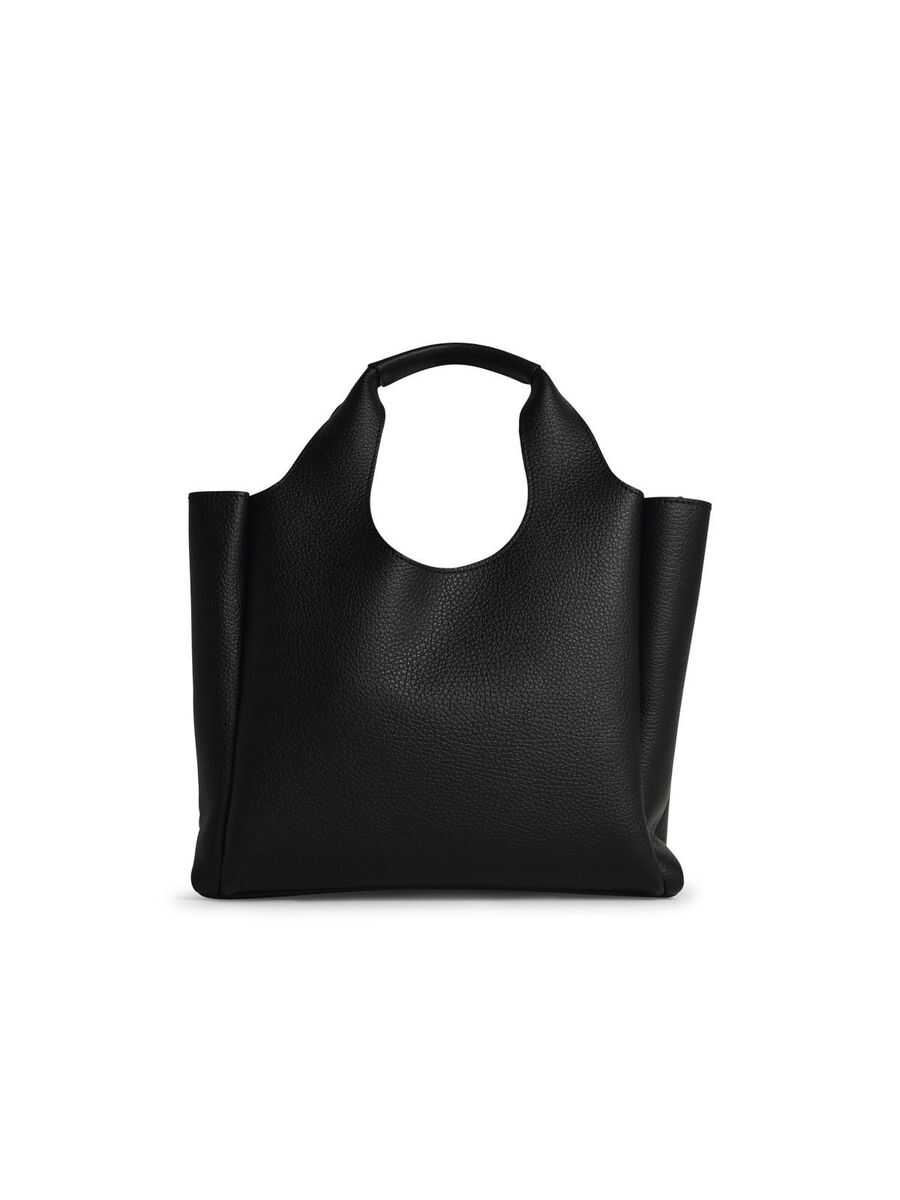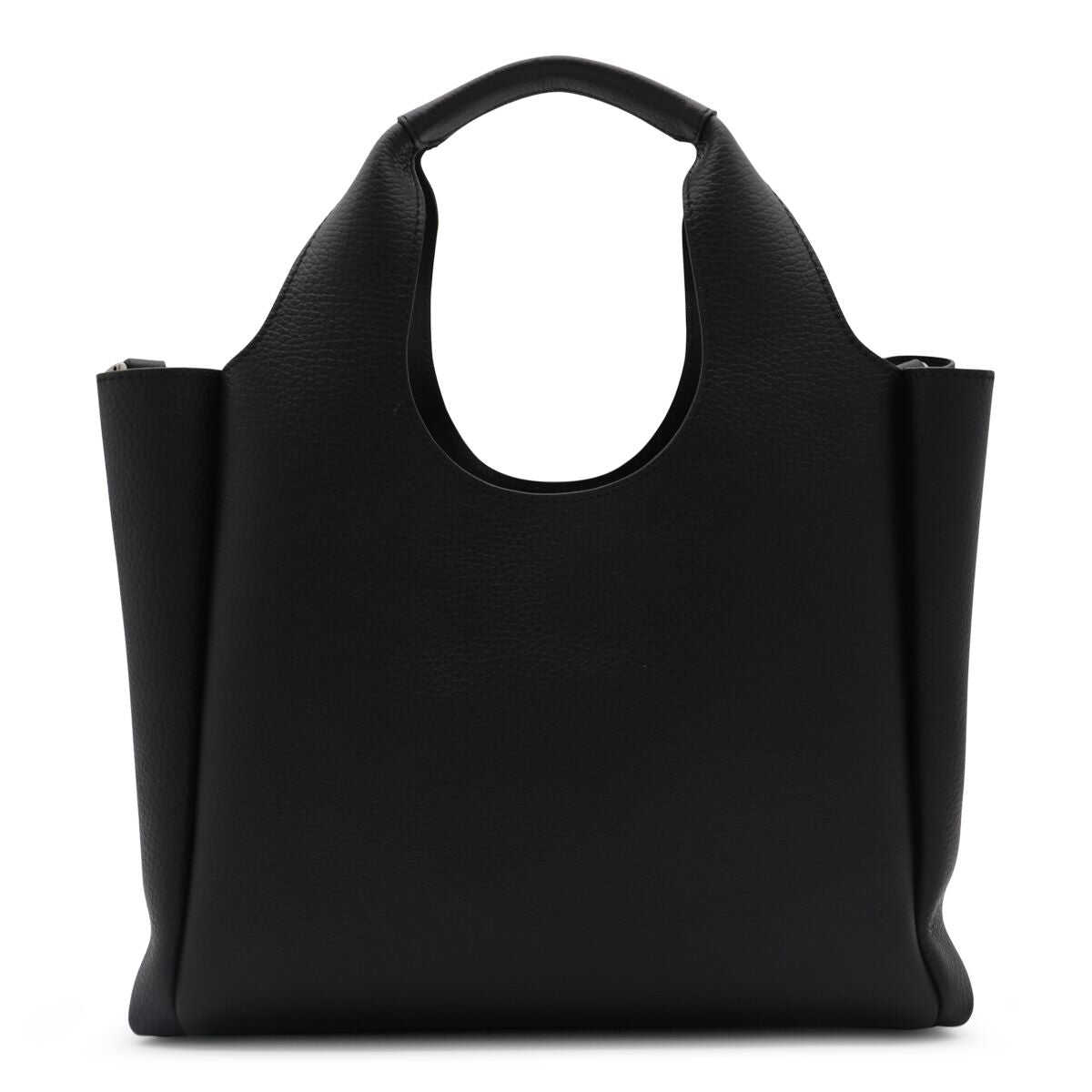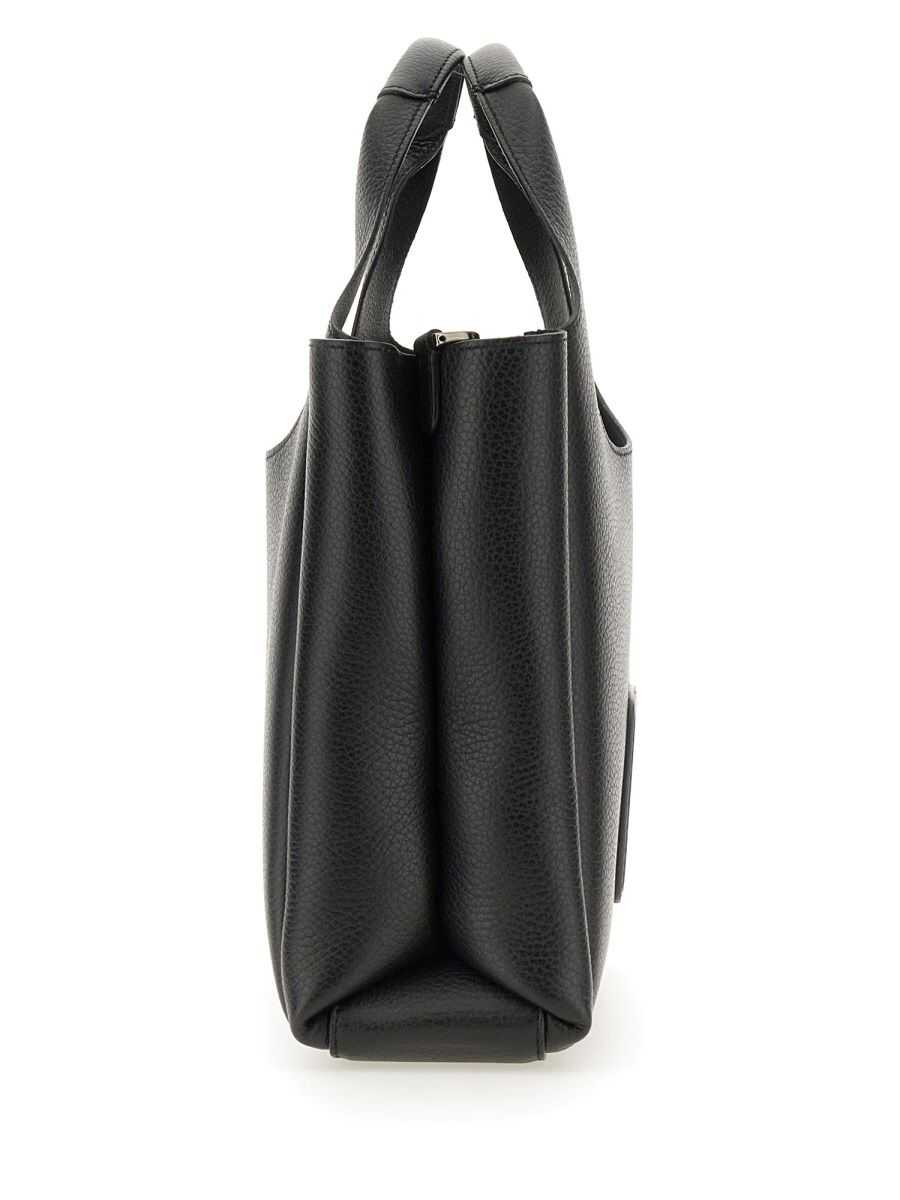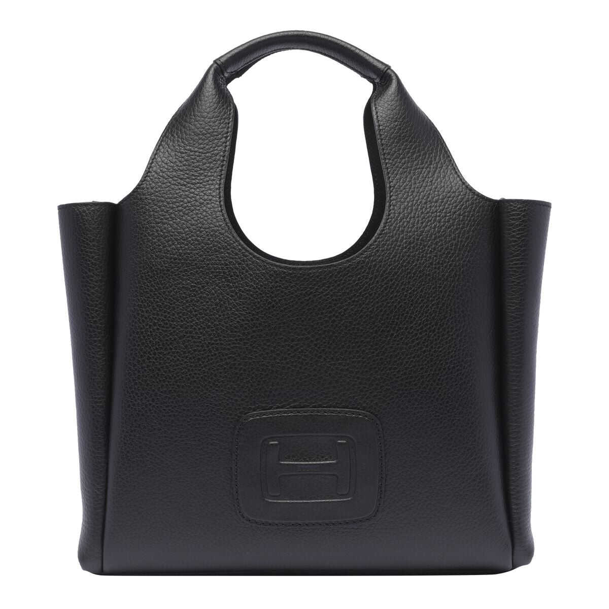 Black leather totes from Hogan featuring two hop handles, shoulder strap, frontal embossed and inside pocket.