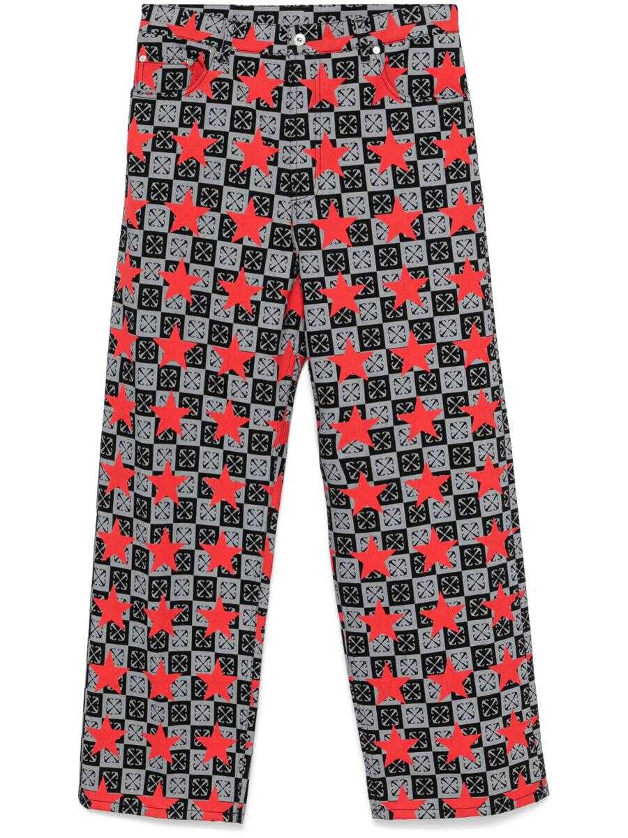 black/grey/red cotton denim coated finish button fly fastening belt loops mid-rise signature Arrows print all-over star print classic five pockets logo patch to the rear straight leg