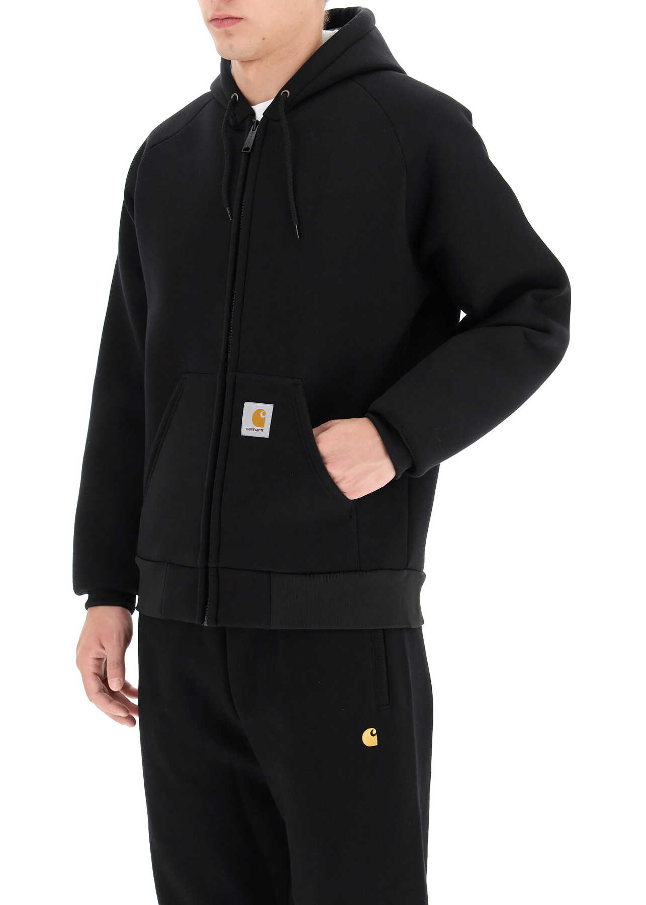 Carhartt blouson-sweatshirt with drawstring hood, made from heavy cotton and water-repellent polyester scuba fabric with contrasting interior. Zip closure, kangaroo pockets, logo patch. Ribbed stretch edges. The model is 187 cm tall and wears a size L.