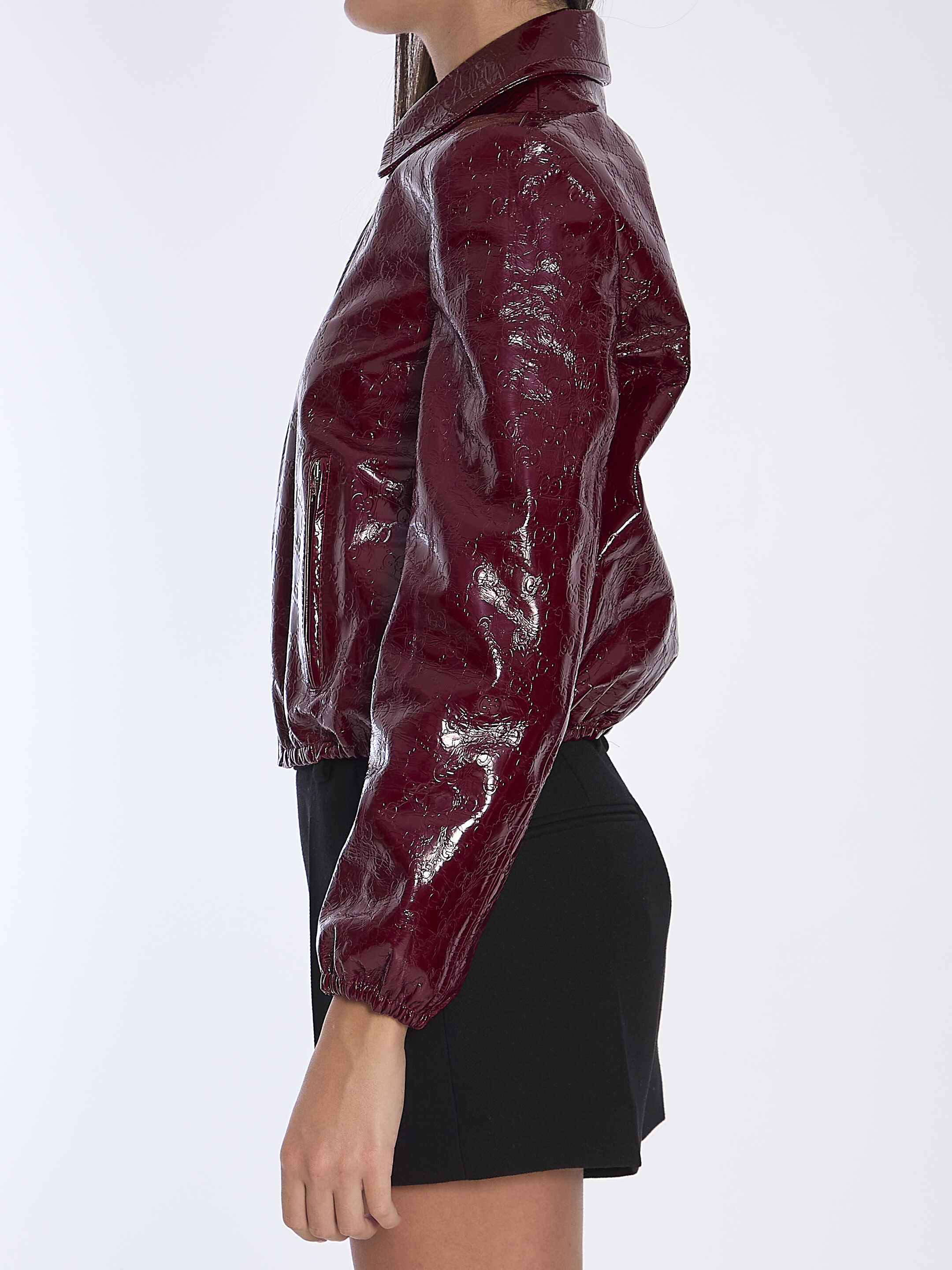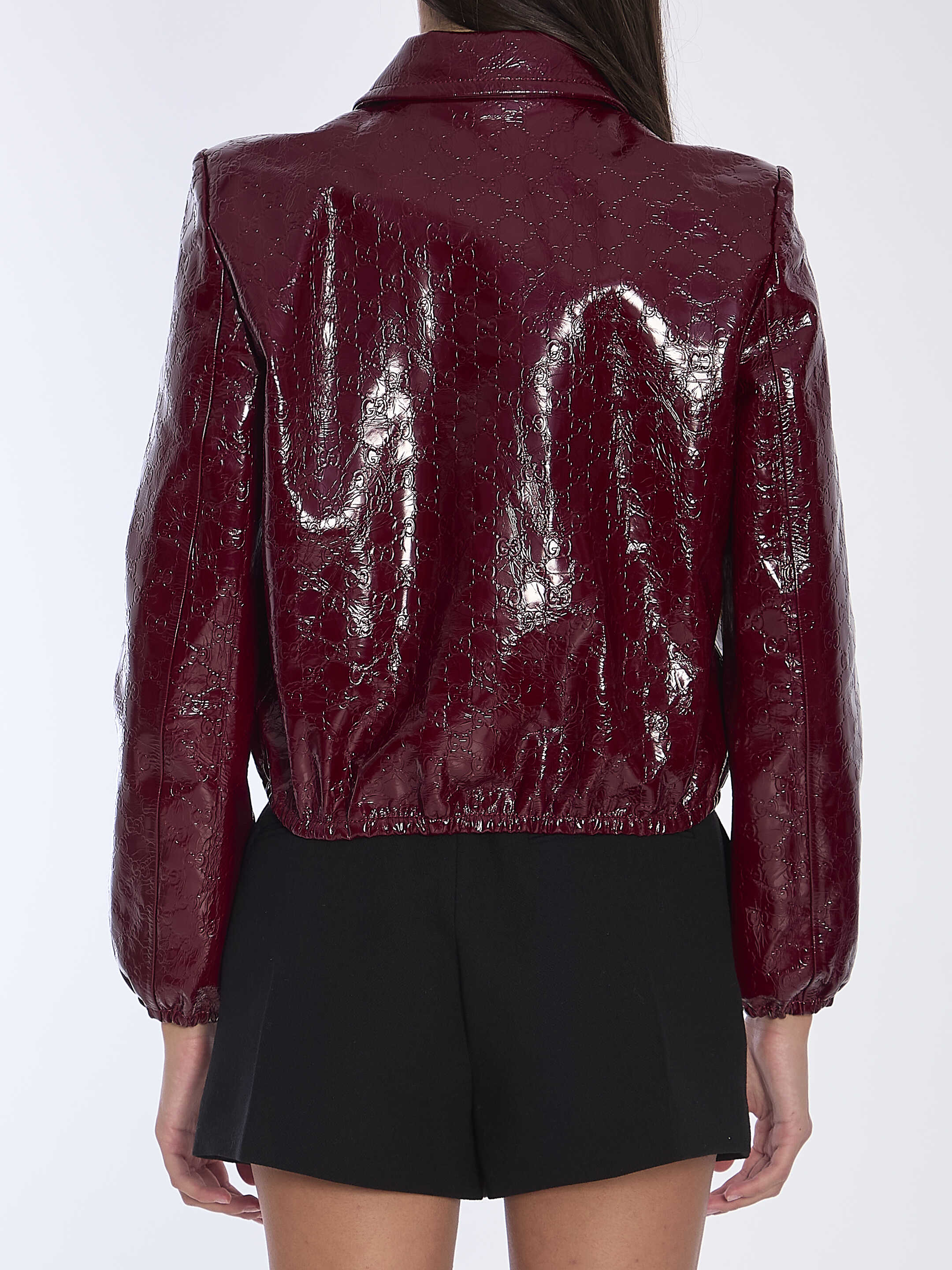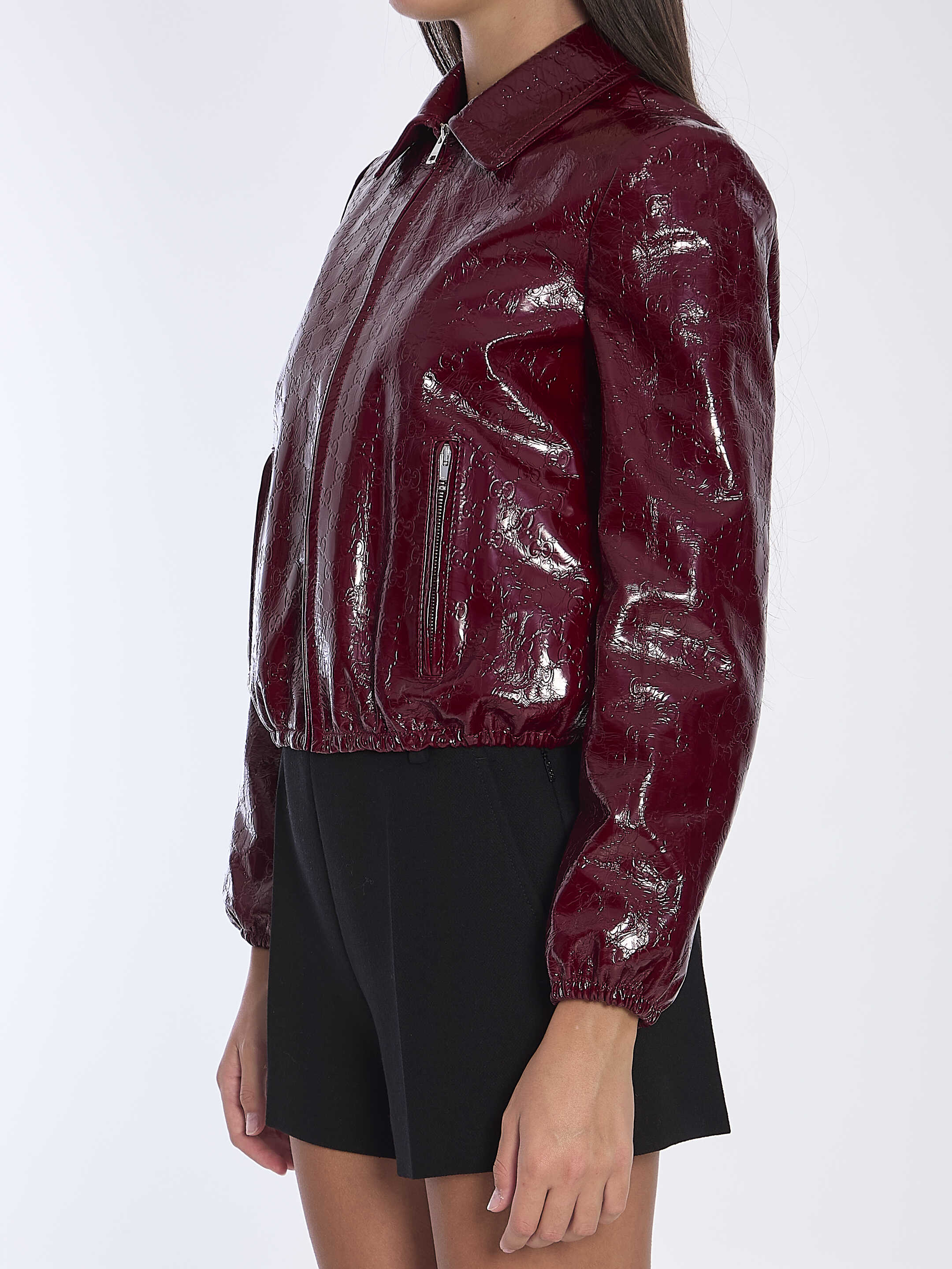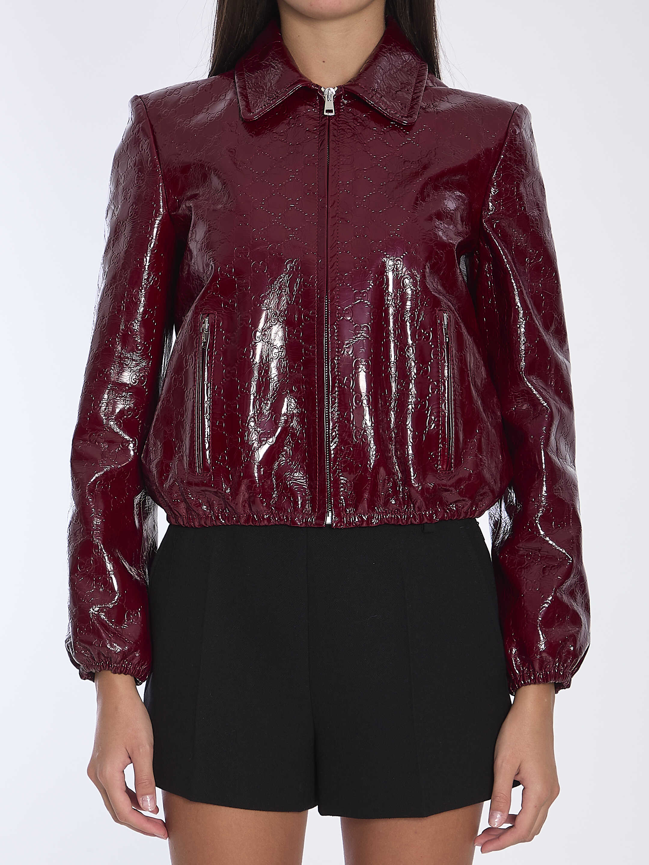 Cropped bomber jacket in Gucci Red Ancora shiny leather with all-over embossed GG. It features pointed collar, front zip closure, two side zip pockets, elasticated cuffs and elasticated hem. Ivory Horsebit jacquard lining. Regular fit.