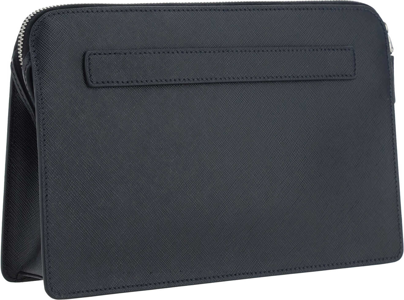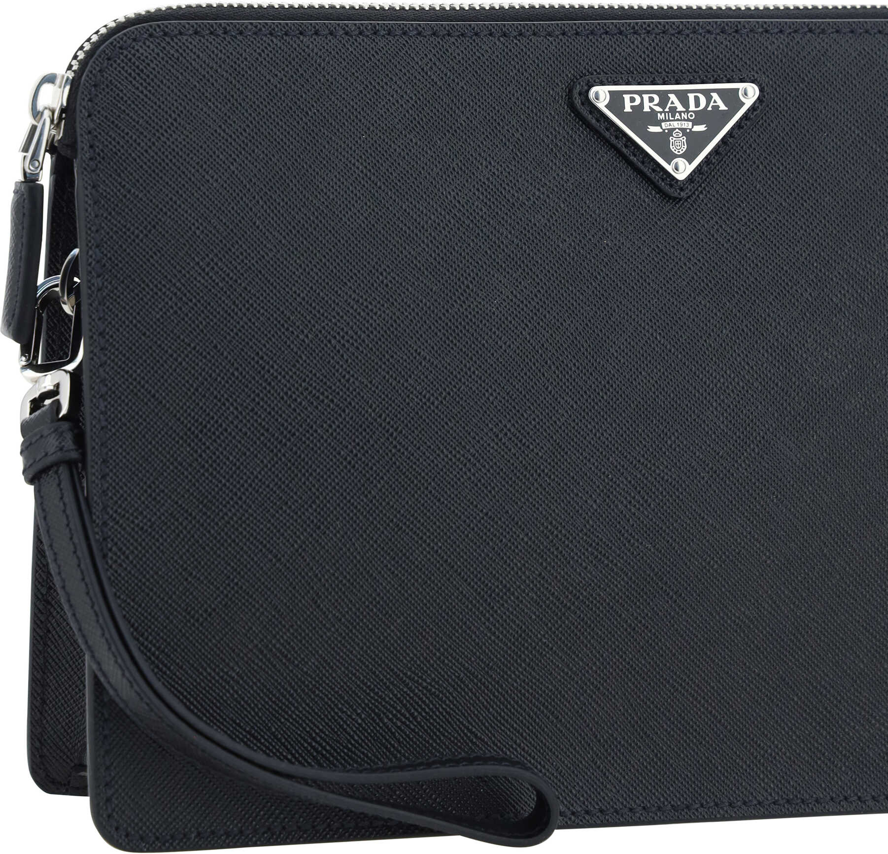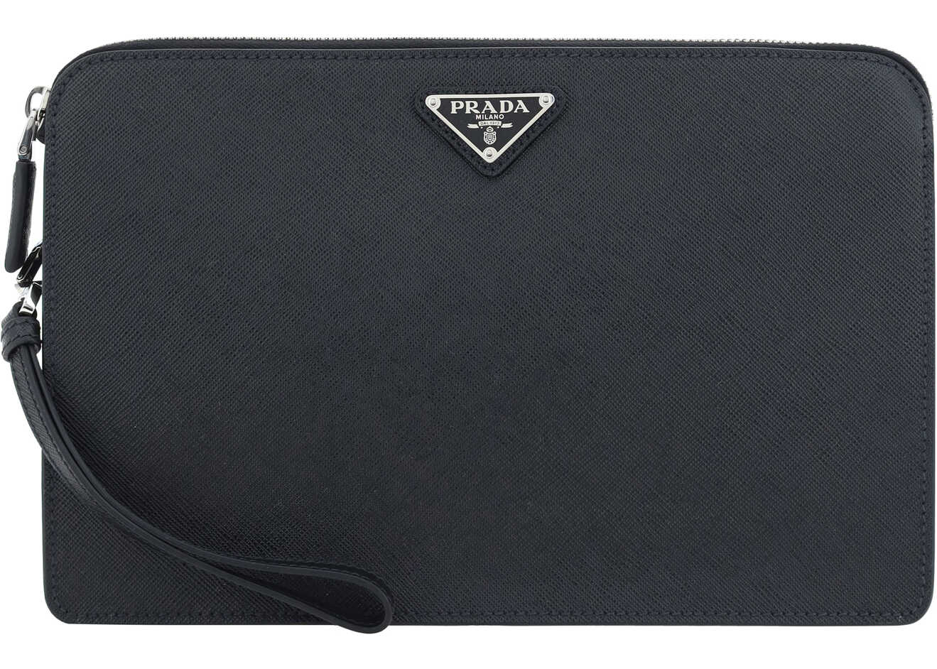 Calfskin Clutch Bag by Prada, top zipper closure, iconic enameled triangular plaque with brand signature applied to front, removable leather puller applied to side panel for carrying by hand, card slot inside.