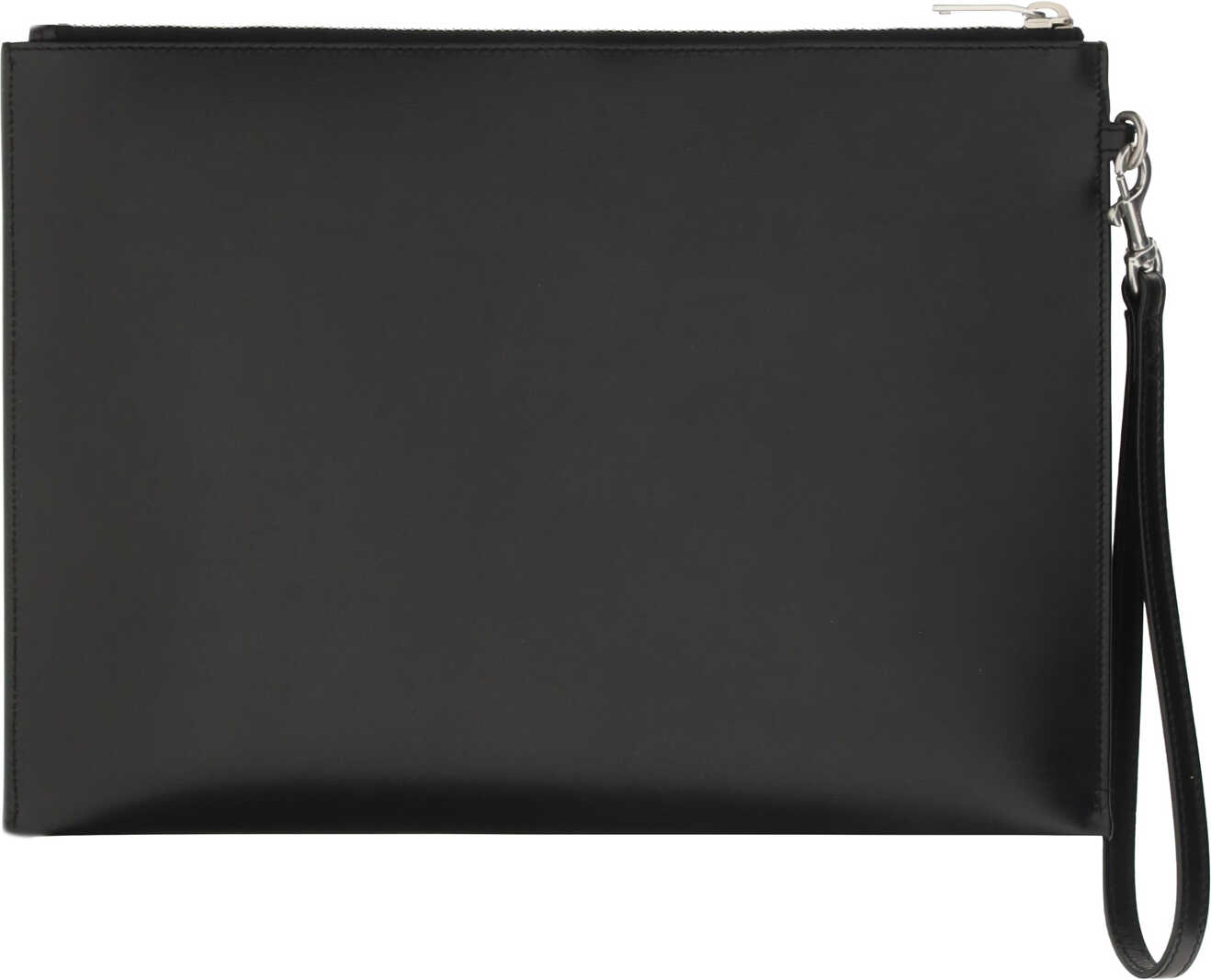 Calfskin iPad Holder by Saint Laurent, top zipper closure, interior card slot, iconic brand logo embossed on front, leather puller for carrying in hand.