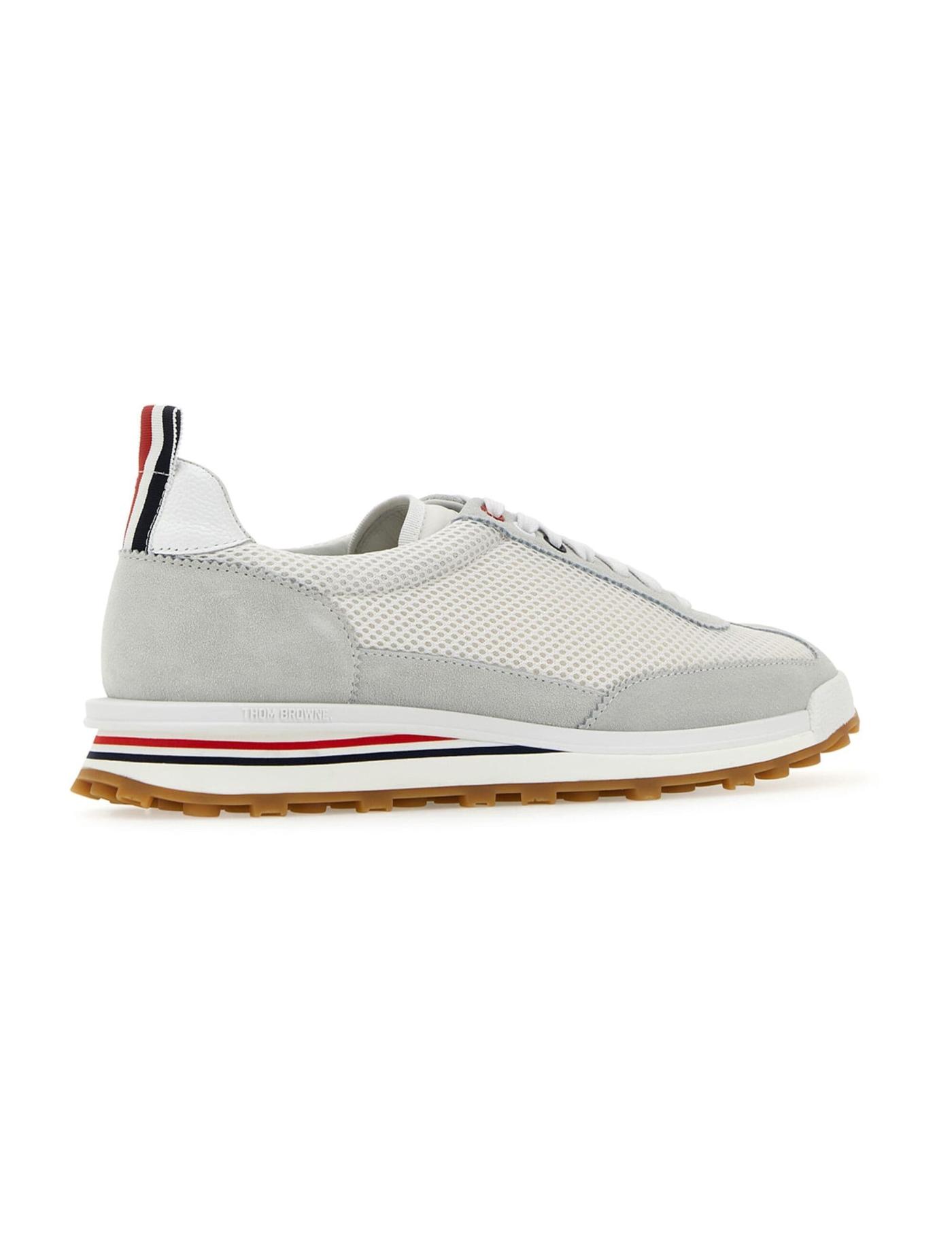 Thom Browne presents an effortlessly contemporary look with these low-top sneakers. A tonal white colourway is paired with mesh detailing to achieve a modern aesthetic, whilst the tri-colour trim detail achieves a subtly branded completion.