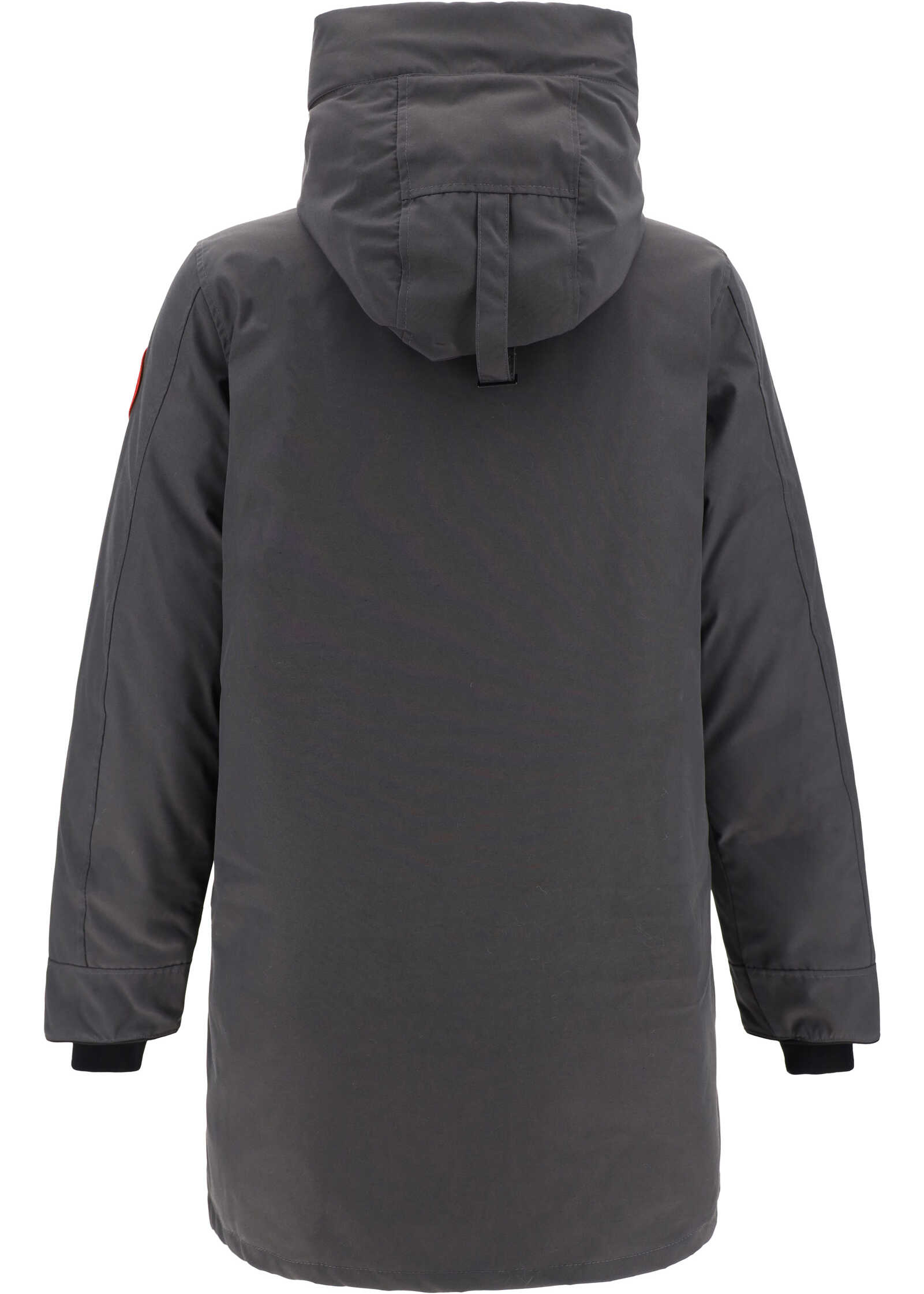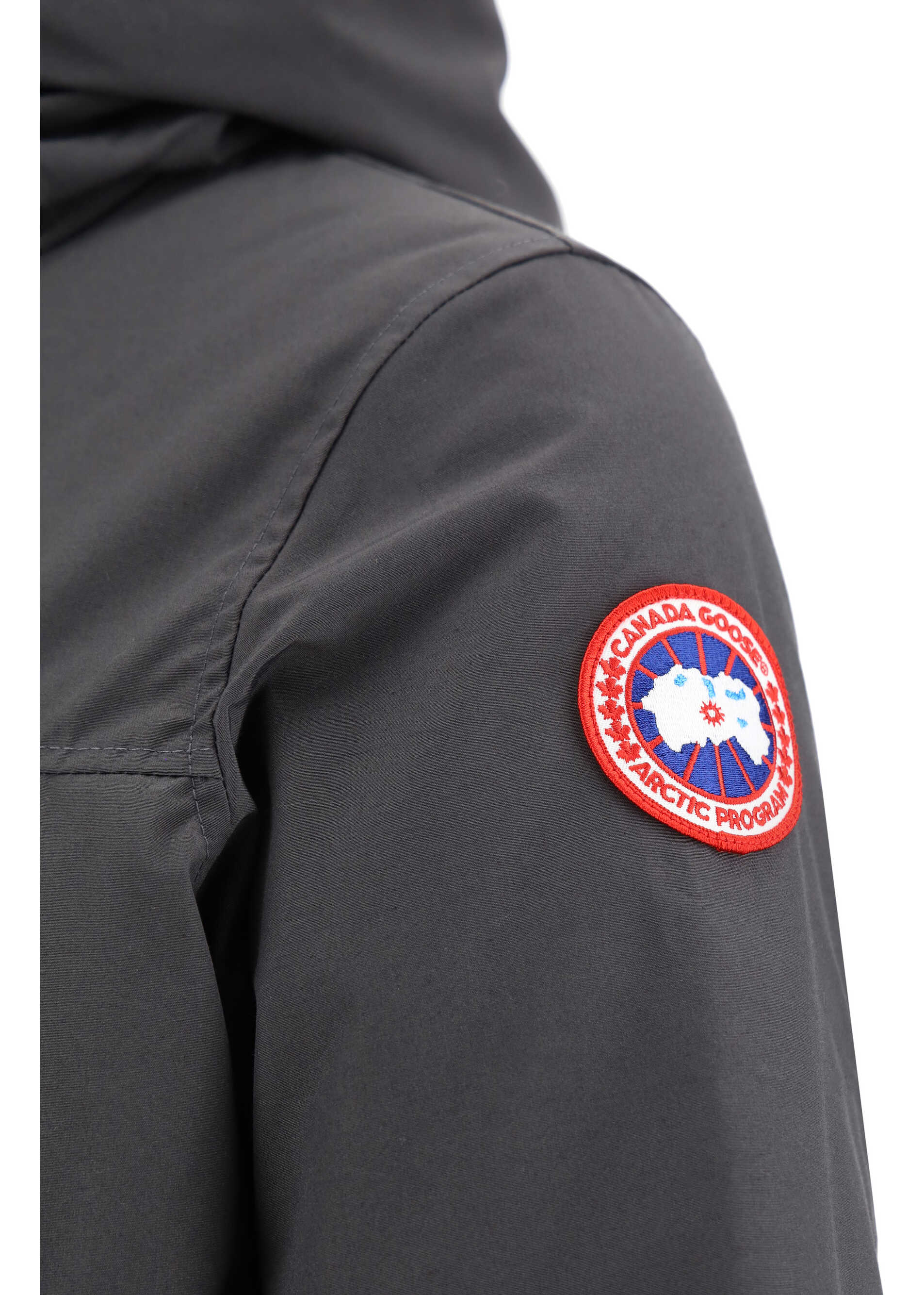 Langford Parka Jacket by Canada Goose, hooded high-neck model, front zipper closure with Velcro strap, elastic ribbed cuffs, midi model, two large patch pockets on front with flap for closure, patch with iconic brand logo applied on left arm.