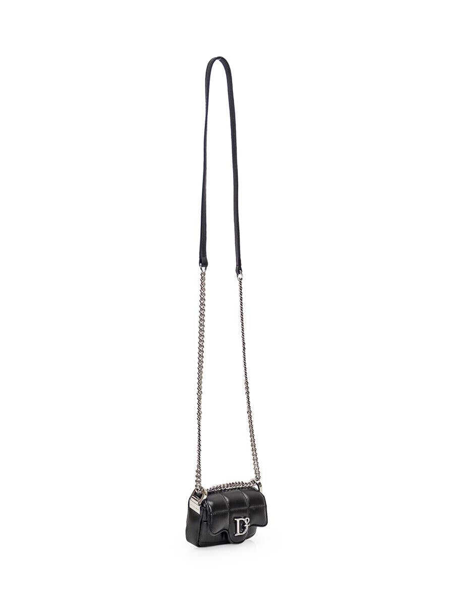 Black leather shoulder bag with all-over quilted pattern. Chain shoulder strap. Flap closure with button. Metal monogram on front. Width:10 Height:6 Depth:3