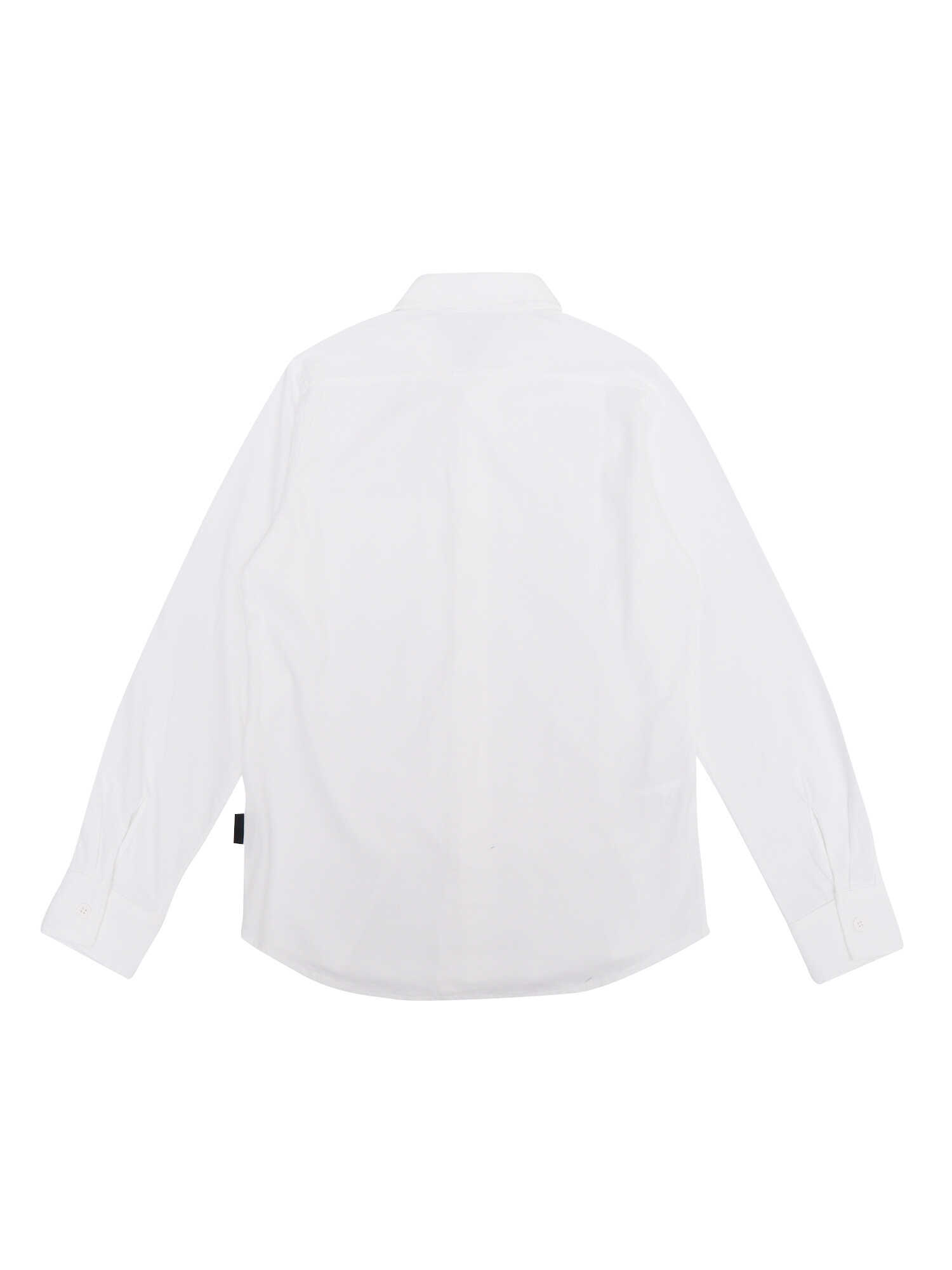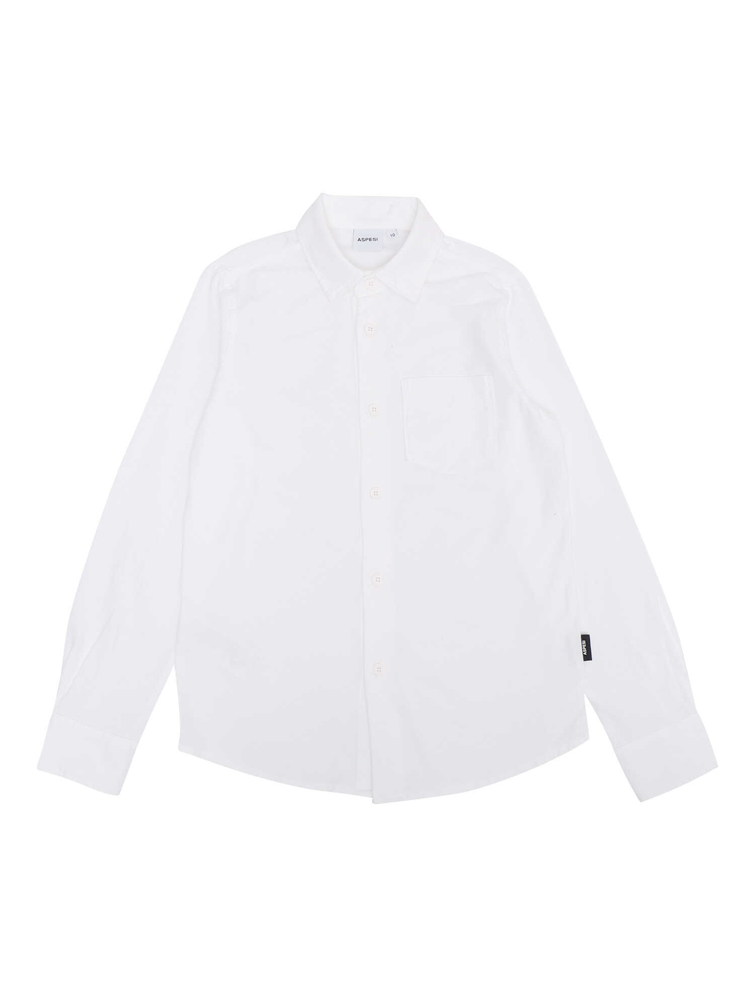 Basic cotton shirt for children with lapel collar, classic fastening with buttons, contrasting brand label on the right side.