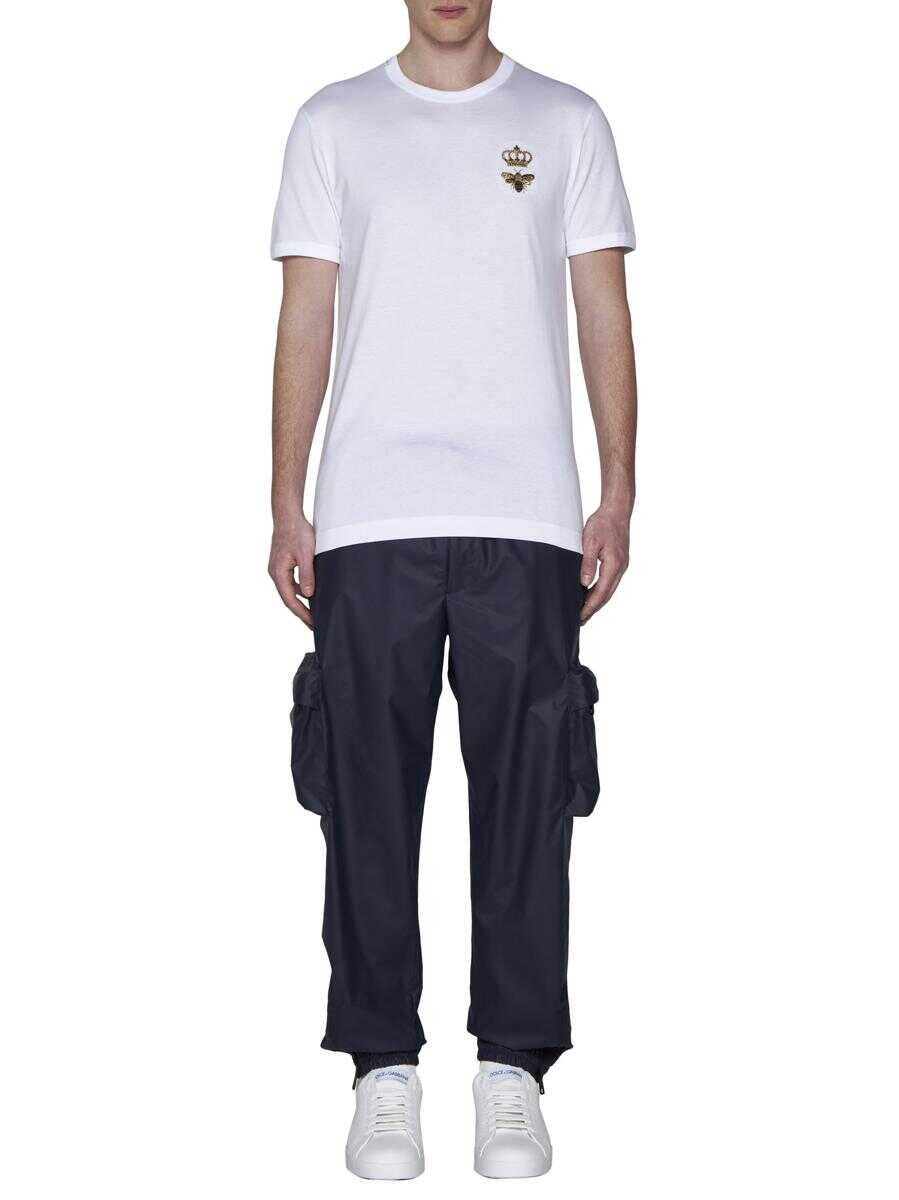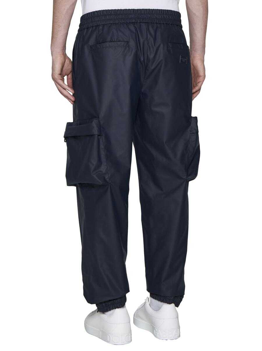 Dolce & Gabbana’s dark blue nylon cargo trousers featuring elasticated waist with adjustable drawstring, side pockets, large zip pockets along the leg, rear welt pockets + logo plaque and elasticated hems.