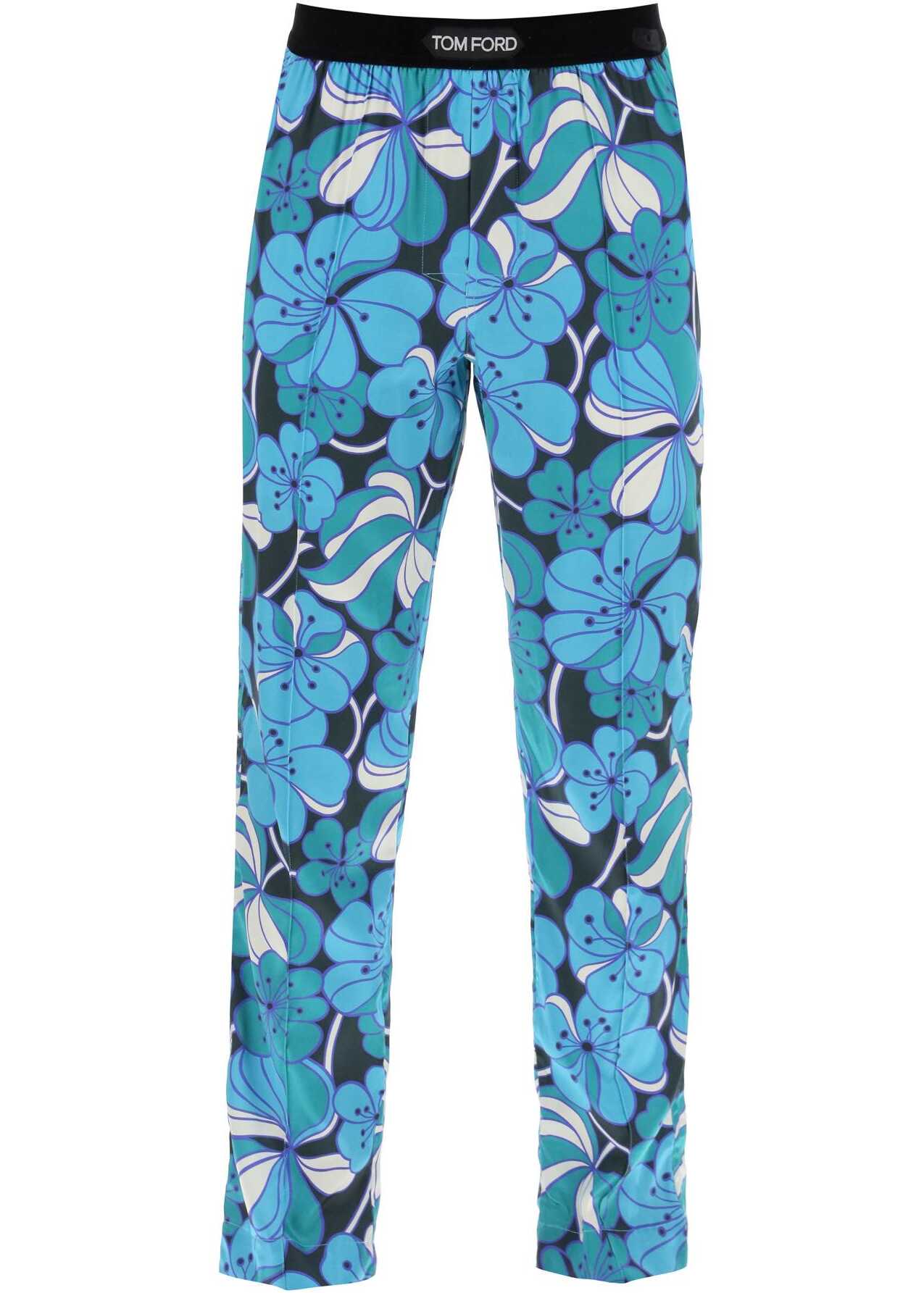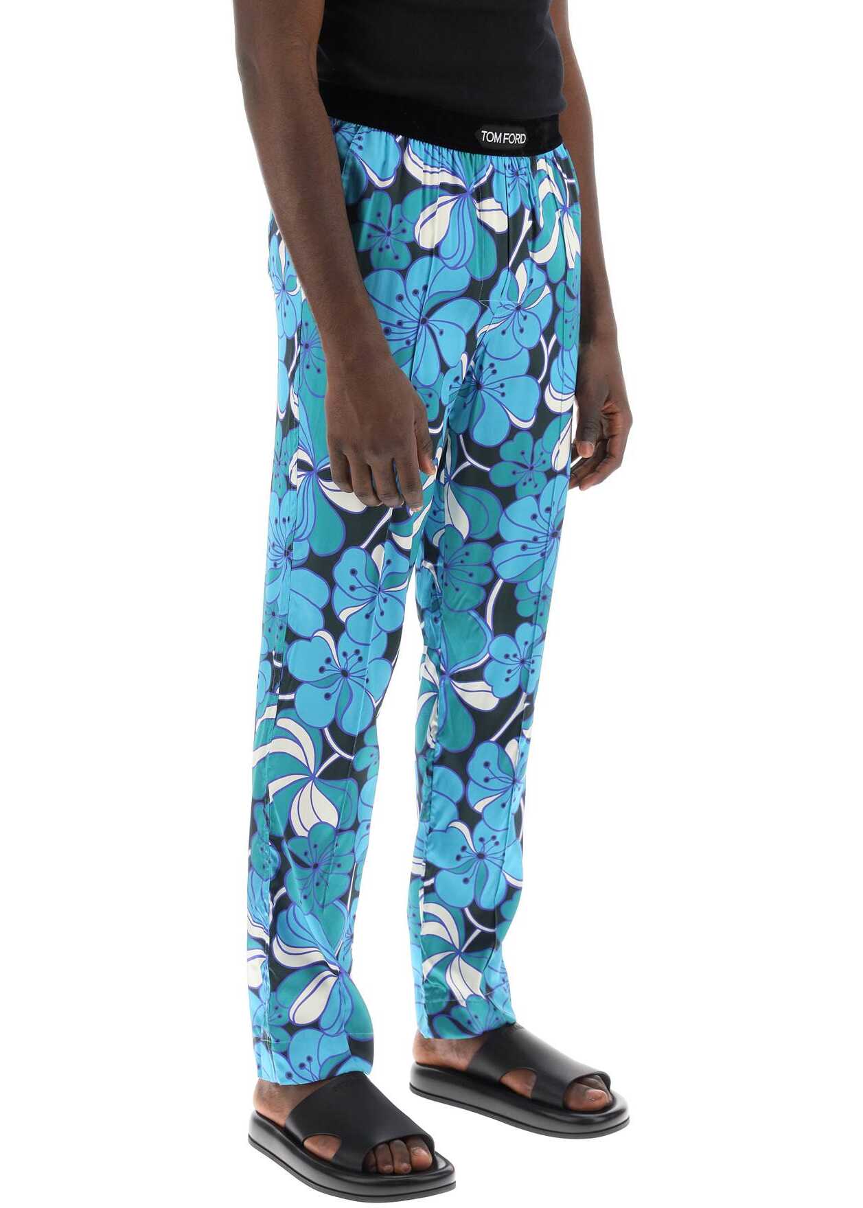 Tom Ford pajama pants crafted in stretch silk satin with floral pattern throughout. They feature logoed velvet elastic band on the waist, button fly, side slash pockets and back patch pockets. Relaxed fit with tapered cut and stitched crease. The model is 187 cm tall and wears size M.