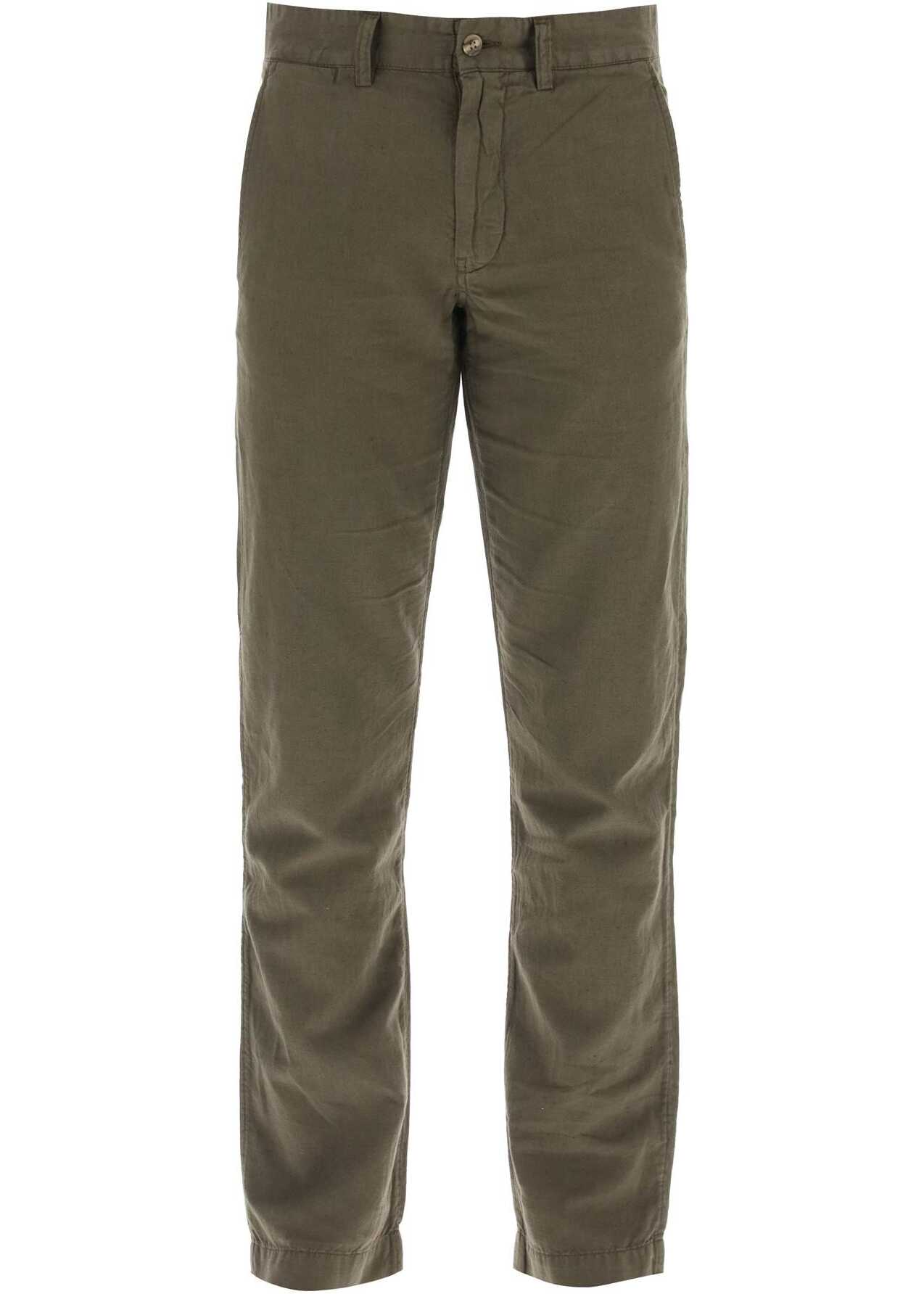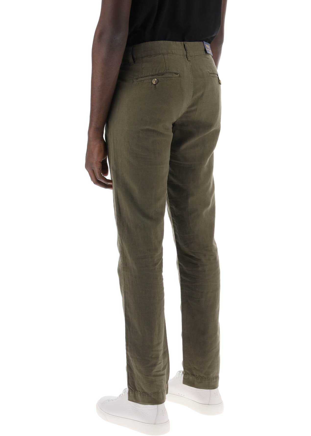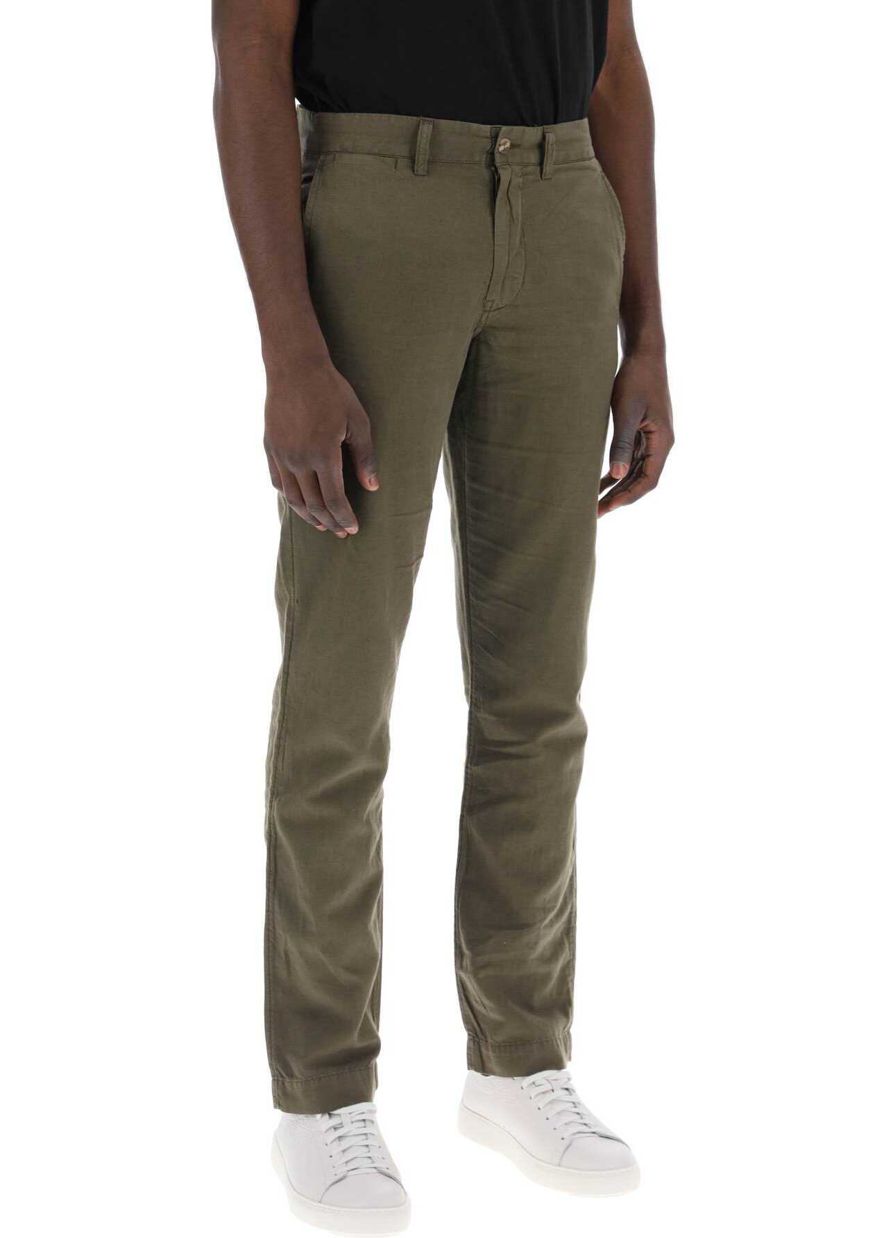 These Polo Ralph Lauren pants have a slim fit and straight cut, made from lightweight linen and cotton fabric. They feature a hidden zip and button closure, French side pockets, belt loops, and back welt pockets with buttons. The model is 187 cm tall and wears a size 31.