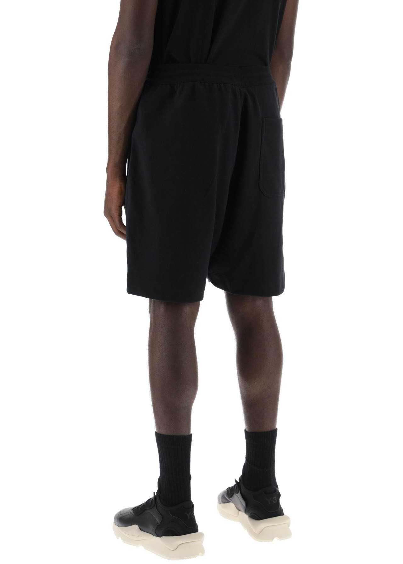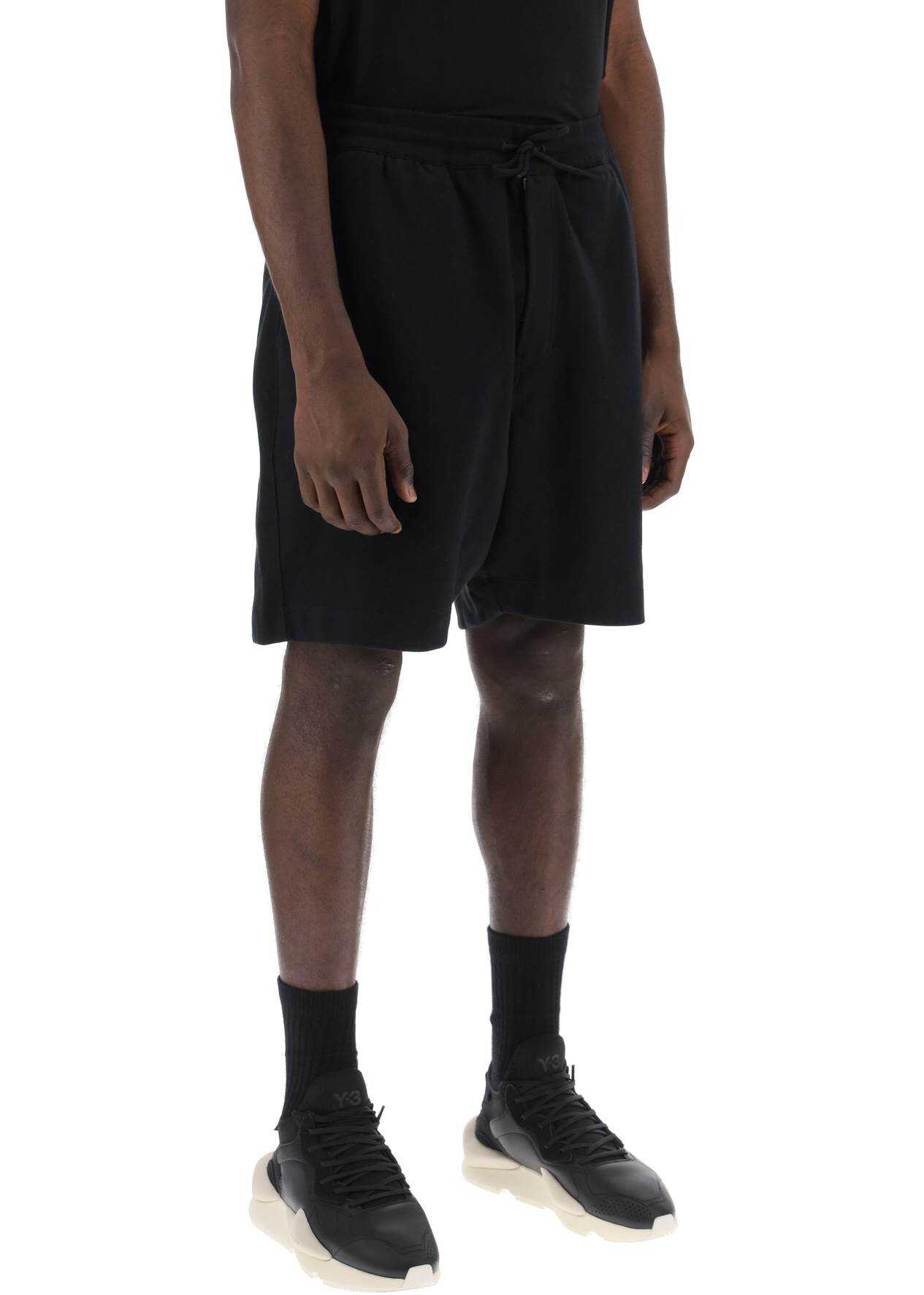 Y-3 Bermuda joggers made of soft cotton blend jersey with a loose fit. Adjustable waistband with ribbed drawstring, hidden zip closure, slanted side pockets and one patch pocket on the back. Finished with a tonal rubber logo detail on the left leg and a slit pocket under the waistband. The model is 187 cm tall and wears size L.