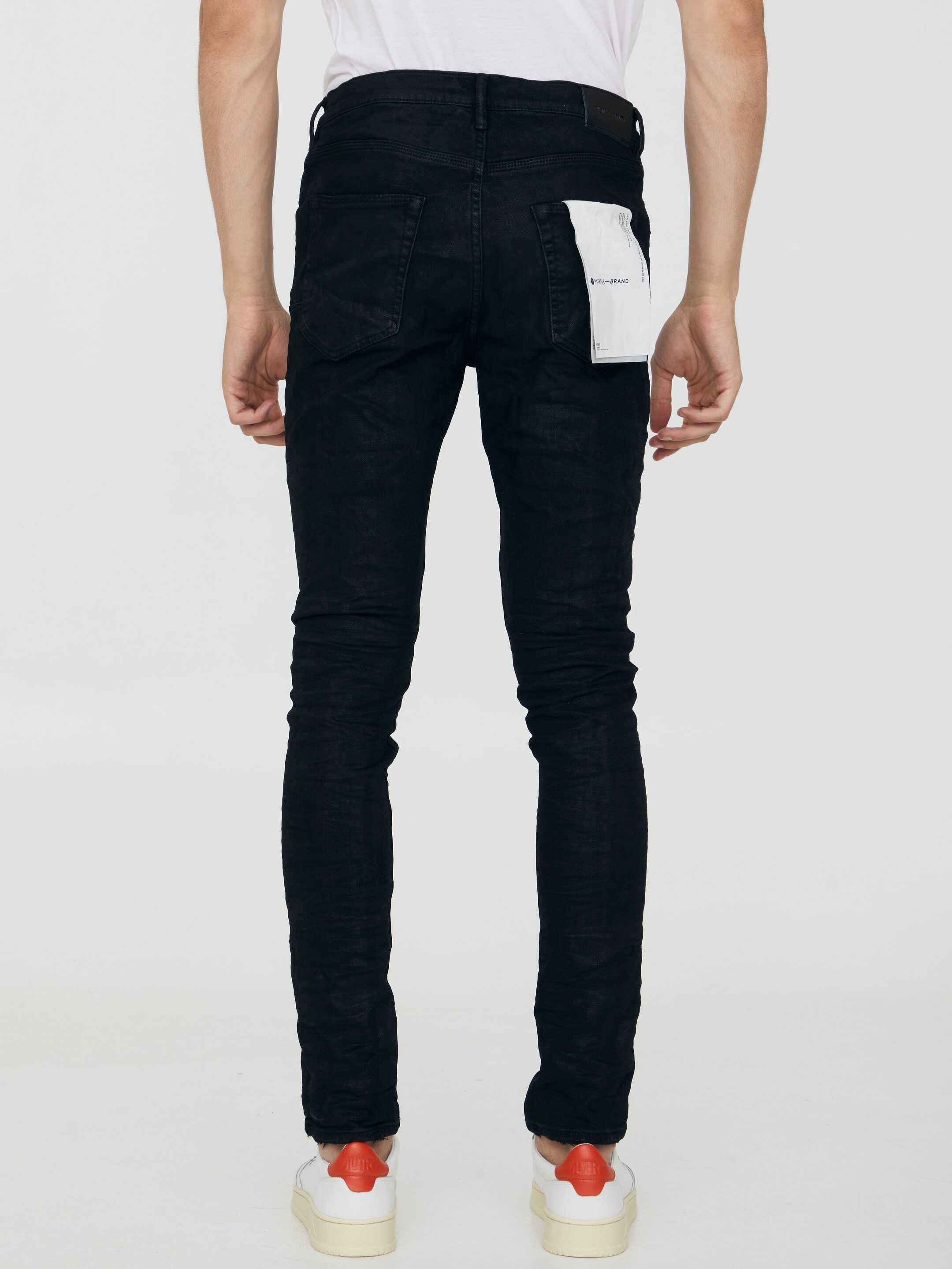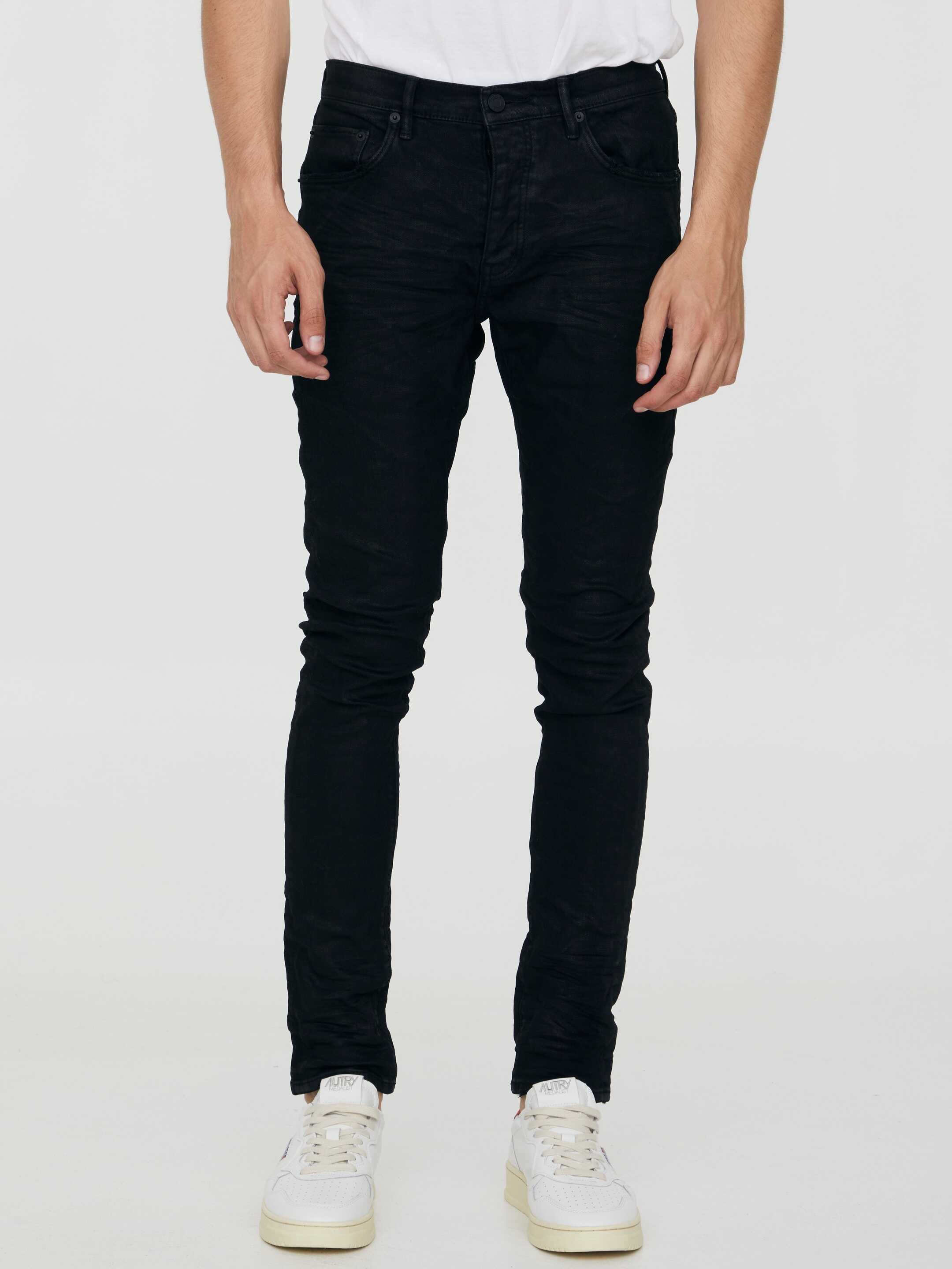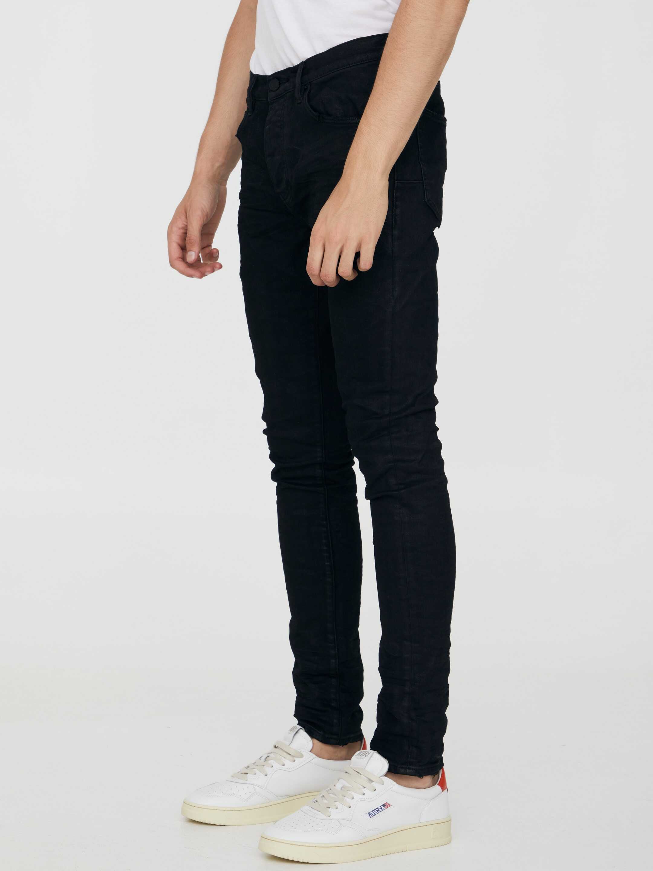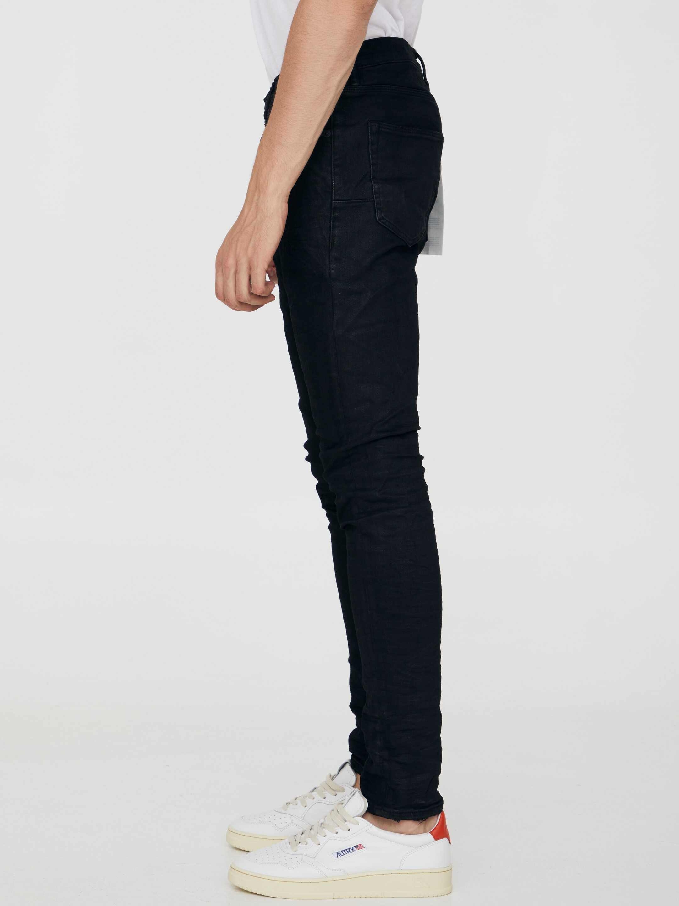 Black denim skinny jeans. It features button closure, five-pocket design and belt loops.
