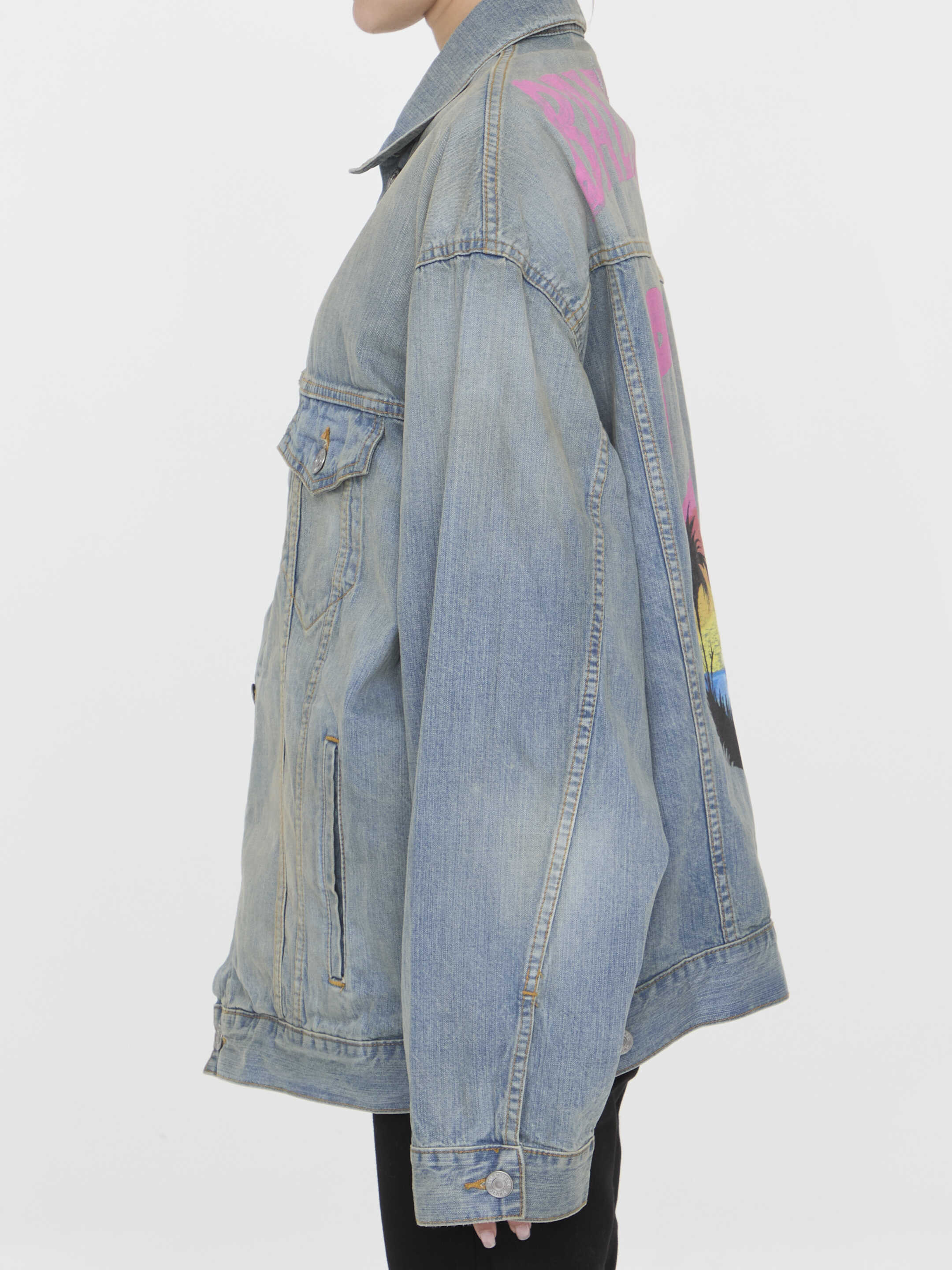 Washed-out Japanese denim jacket with Paris Tropical motif printed on the back. It features shirt collar, front button closure, two buttoned flap pockets on chest, two side welt pockets and buttoned cuffs. Large fit.