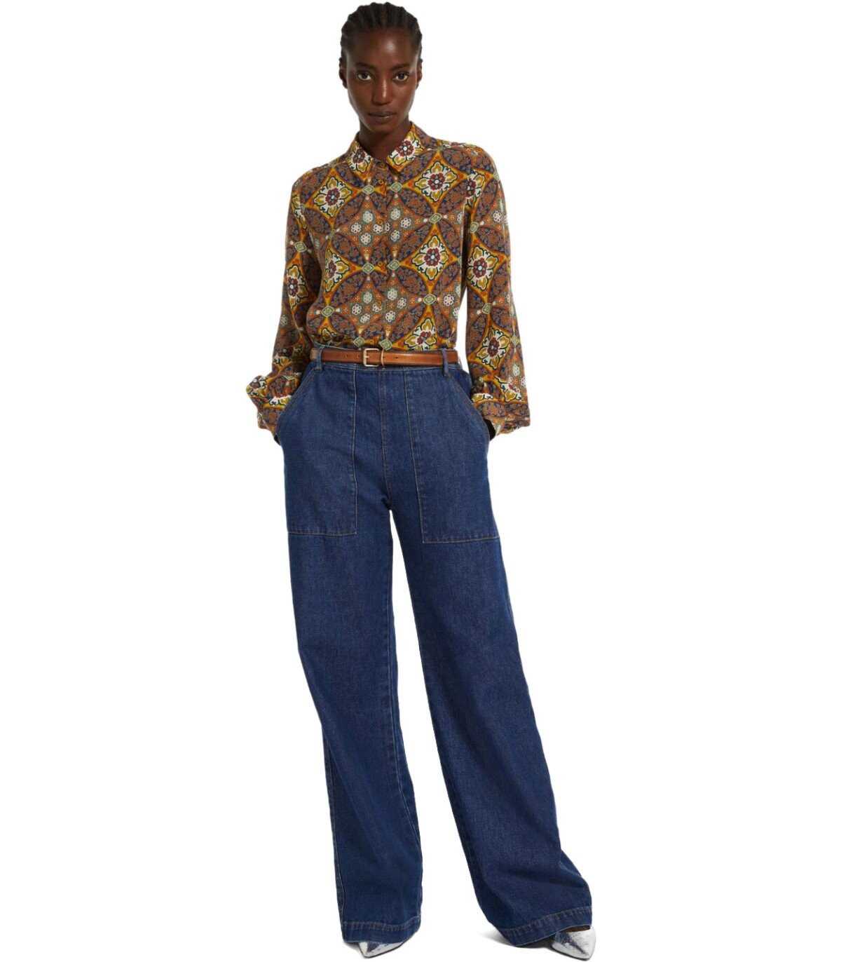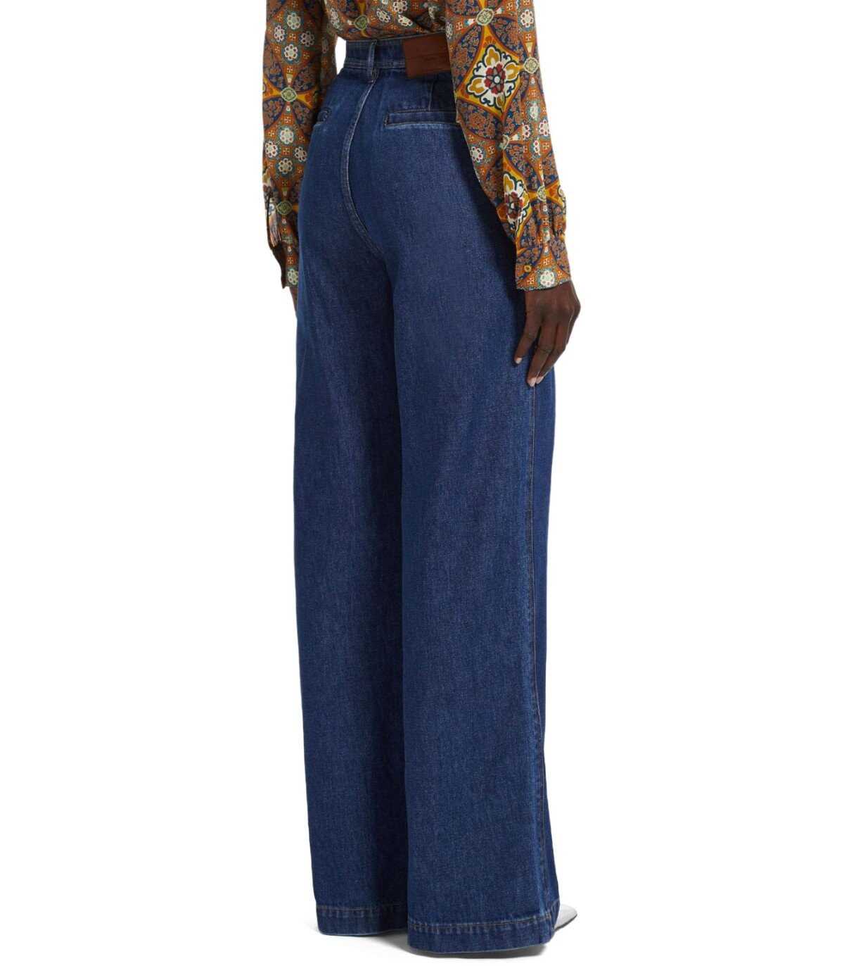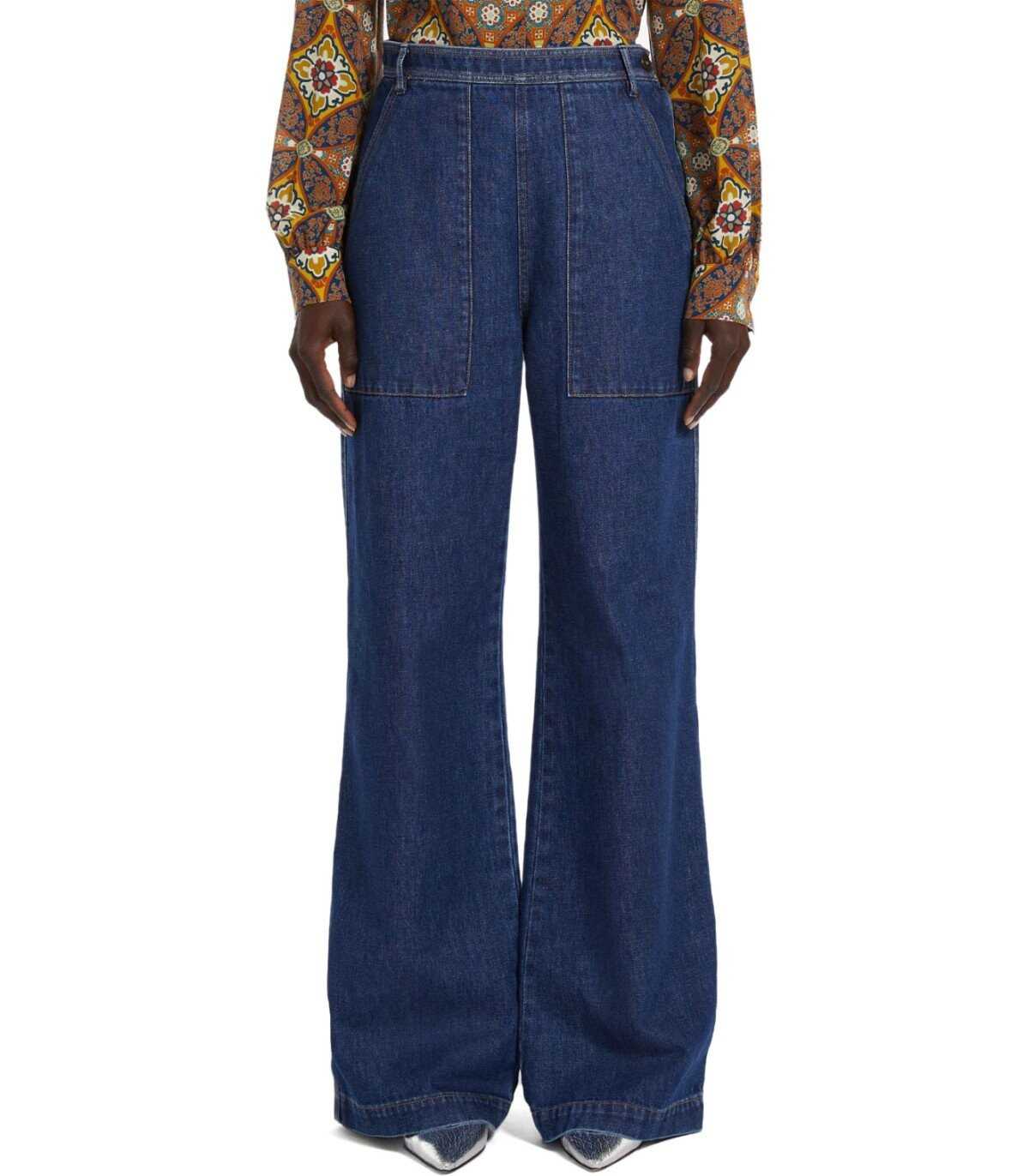 Max Mara Weekend Patroni jeans made of blue cotton denim, featuring contrasting stitching with large pockets on the front. Closure with zip and buttons on the side, belt loops. Wide leg.