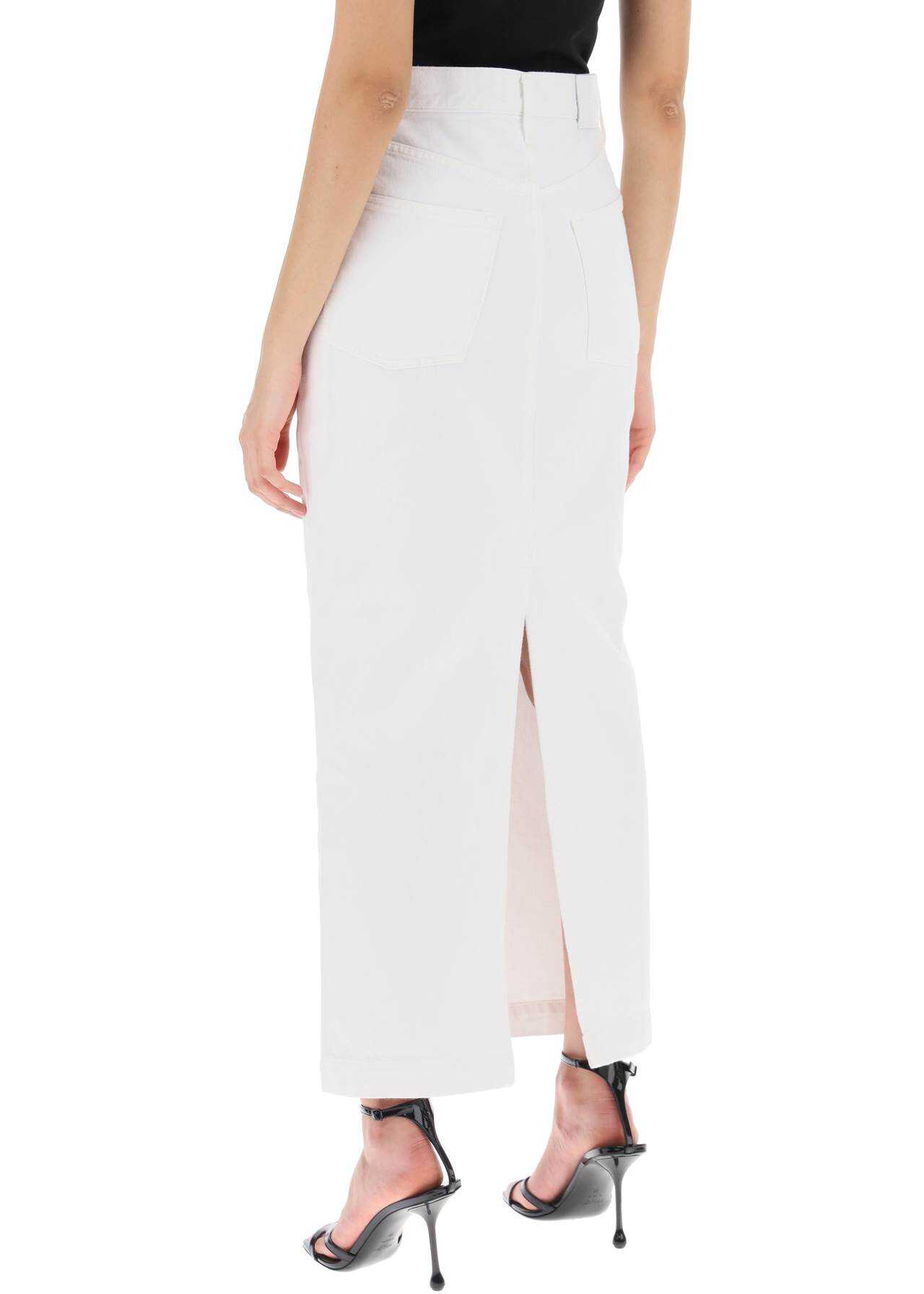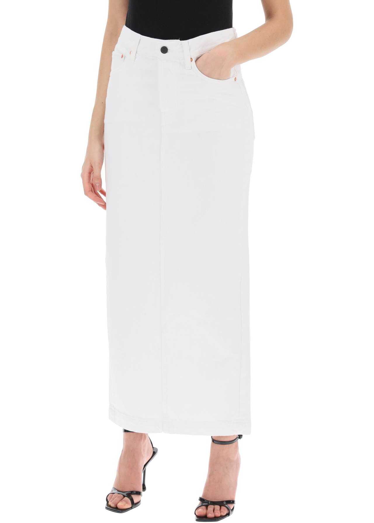This WARDROBE.NYC column skirt is made of pure cotton denim with a five-pocket design. It features a concealed zip and button closure, belt loops, and a branded tab on the back waistband. The model is 177 cm tall and wears a size 26.