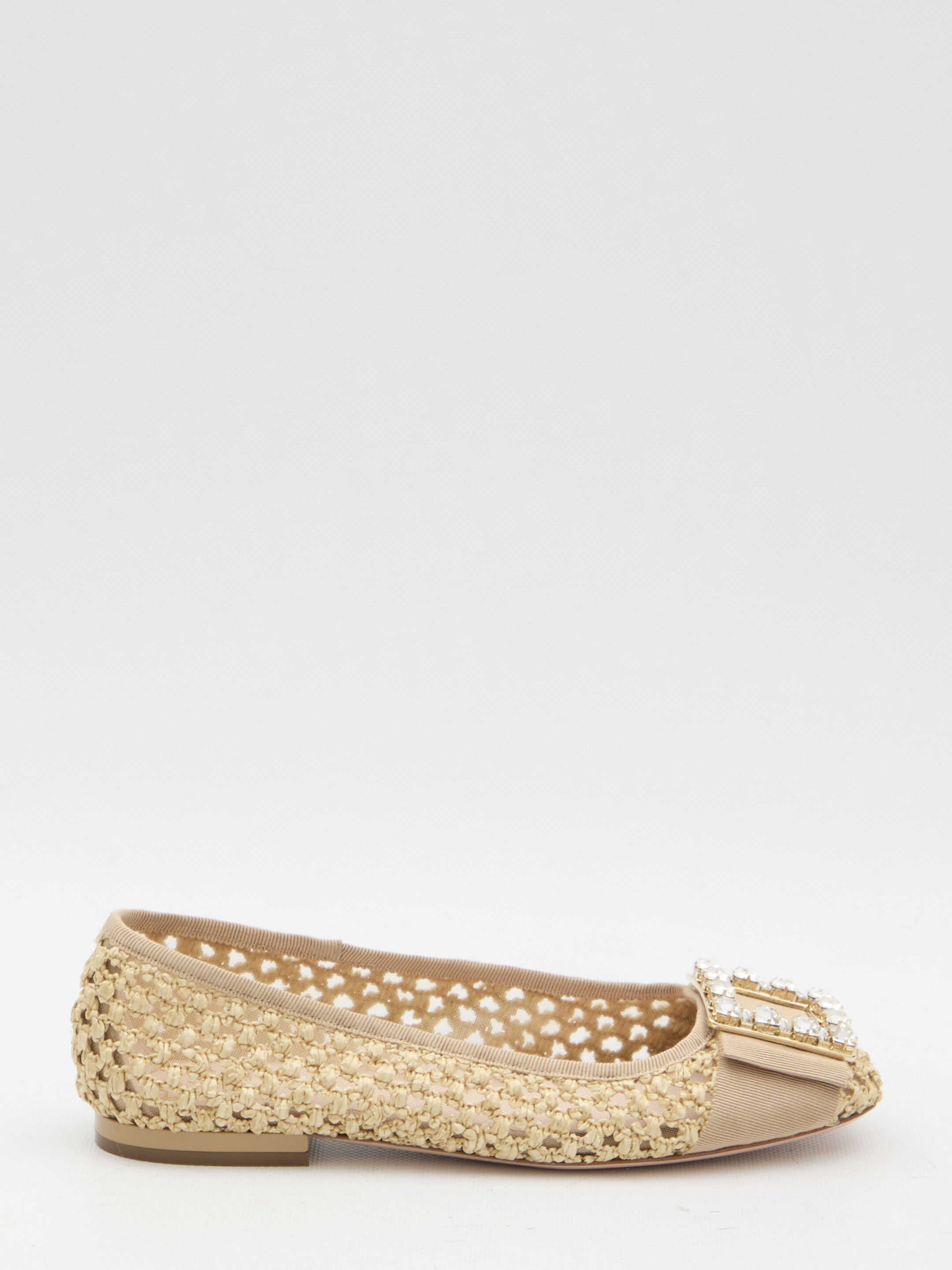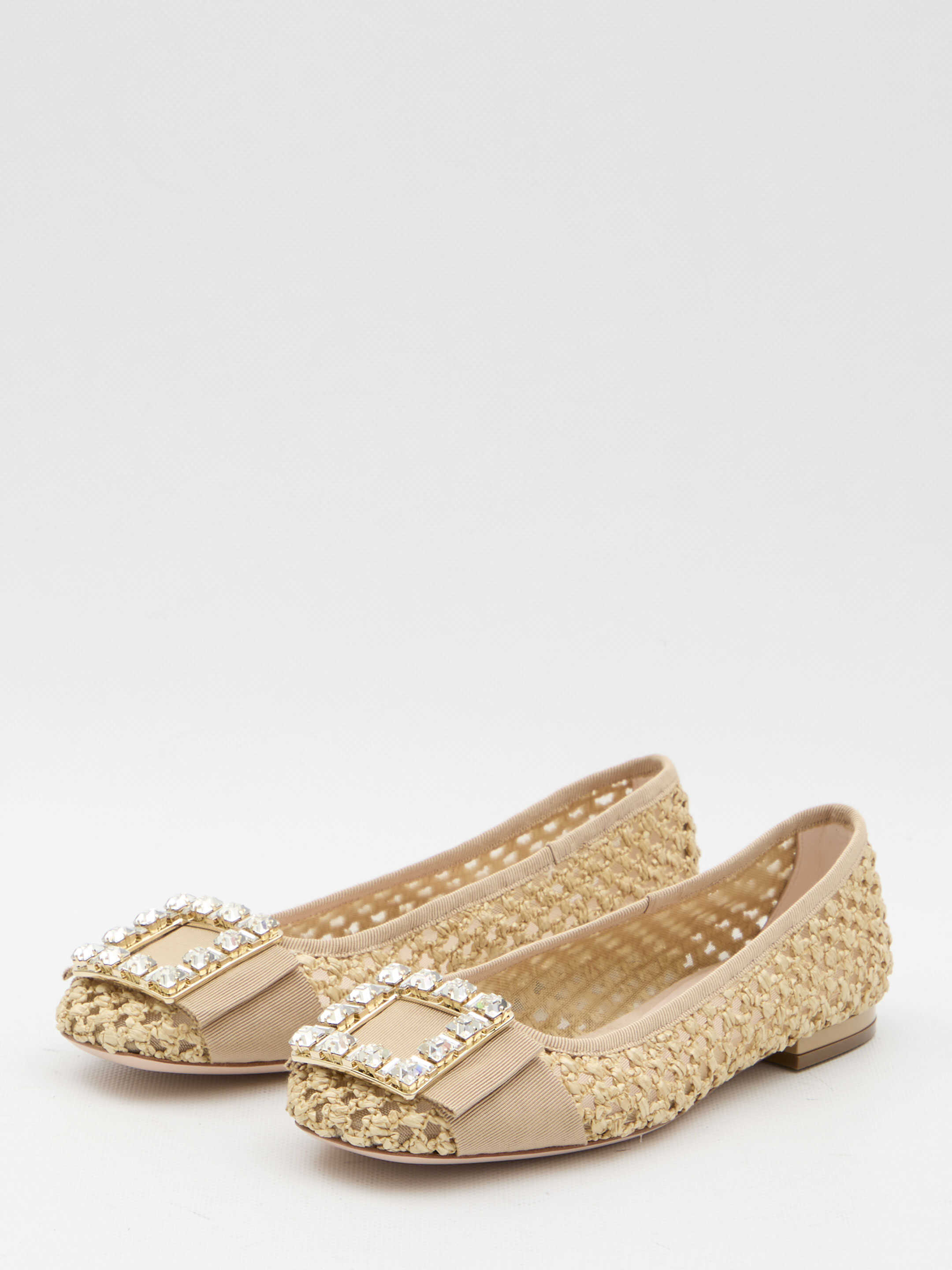 Tres Vivier ballerinas in sand-colored rafia with crystal buckle and fabric ribbon. Leather sole.