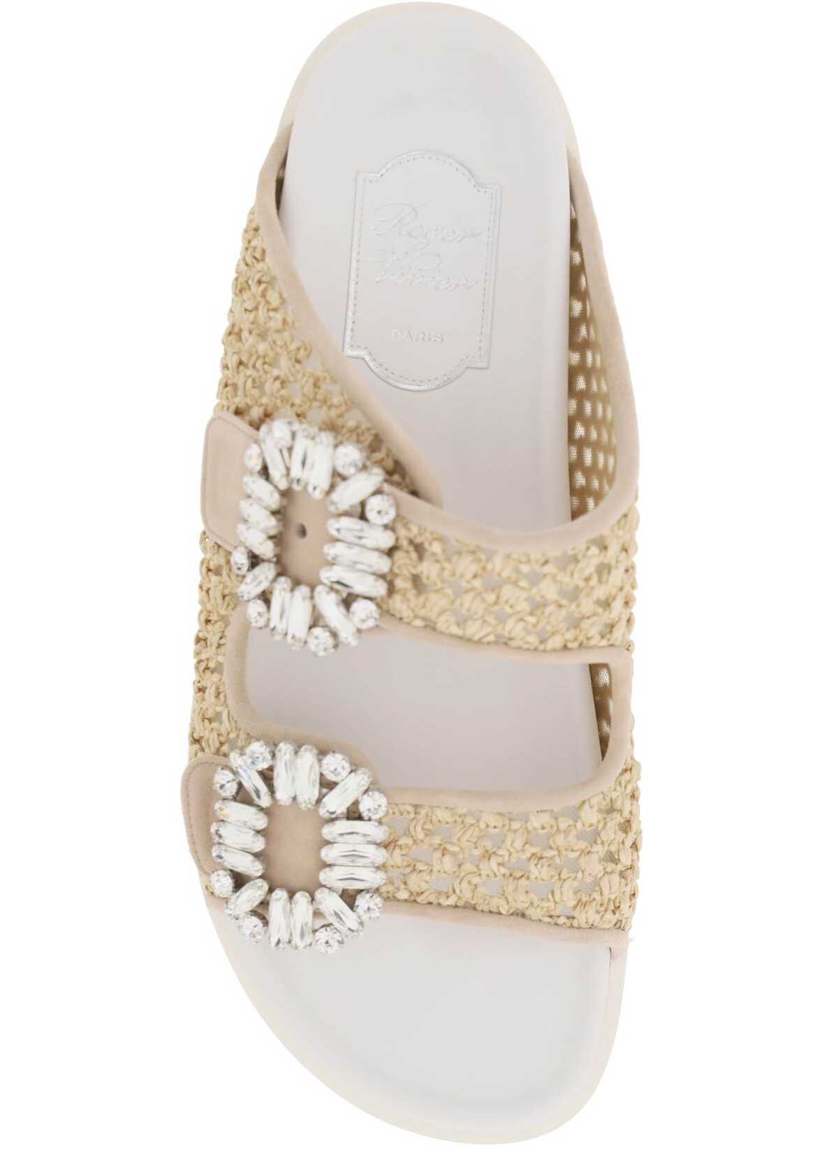 The Slidy Viv' slides by Roger Vivier are made of technical mesh and raffia, with suede leather trims and the iconic Strass Buckle on the straps, one of which is adjustable. They feature an unlined design, anatomical leather insole, and a serrated rubber sole.