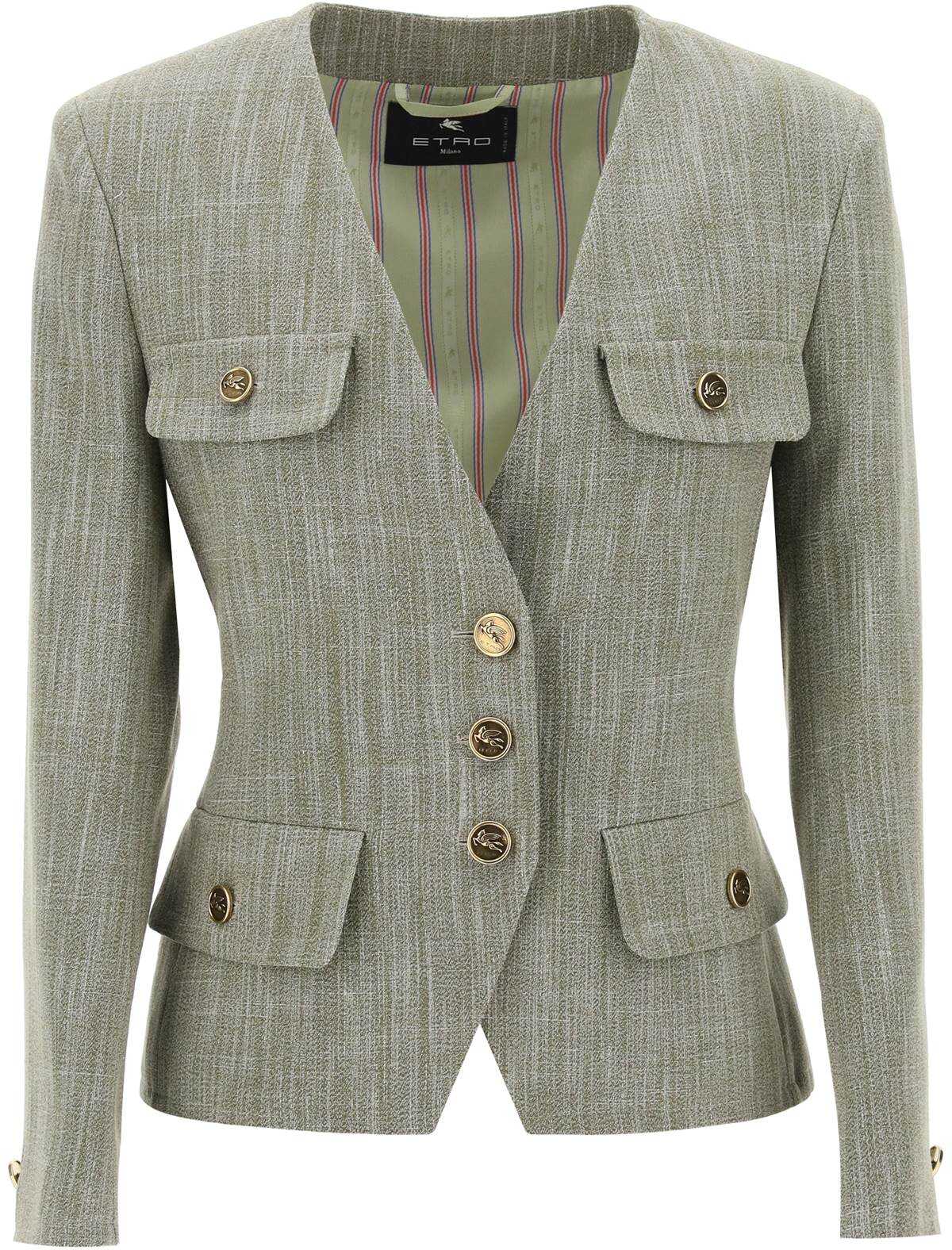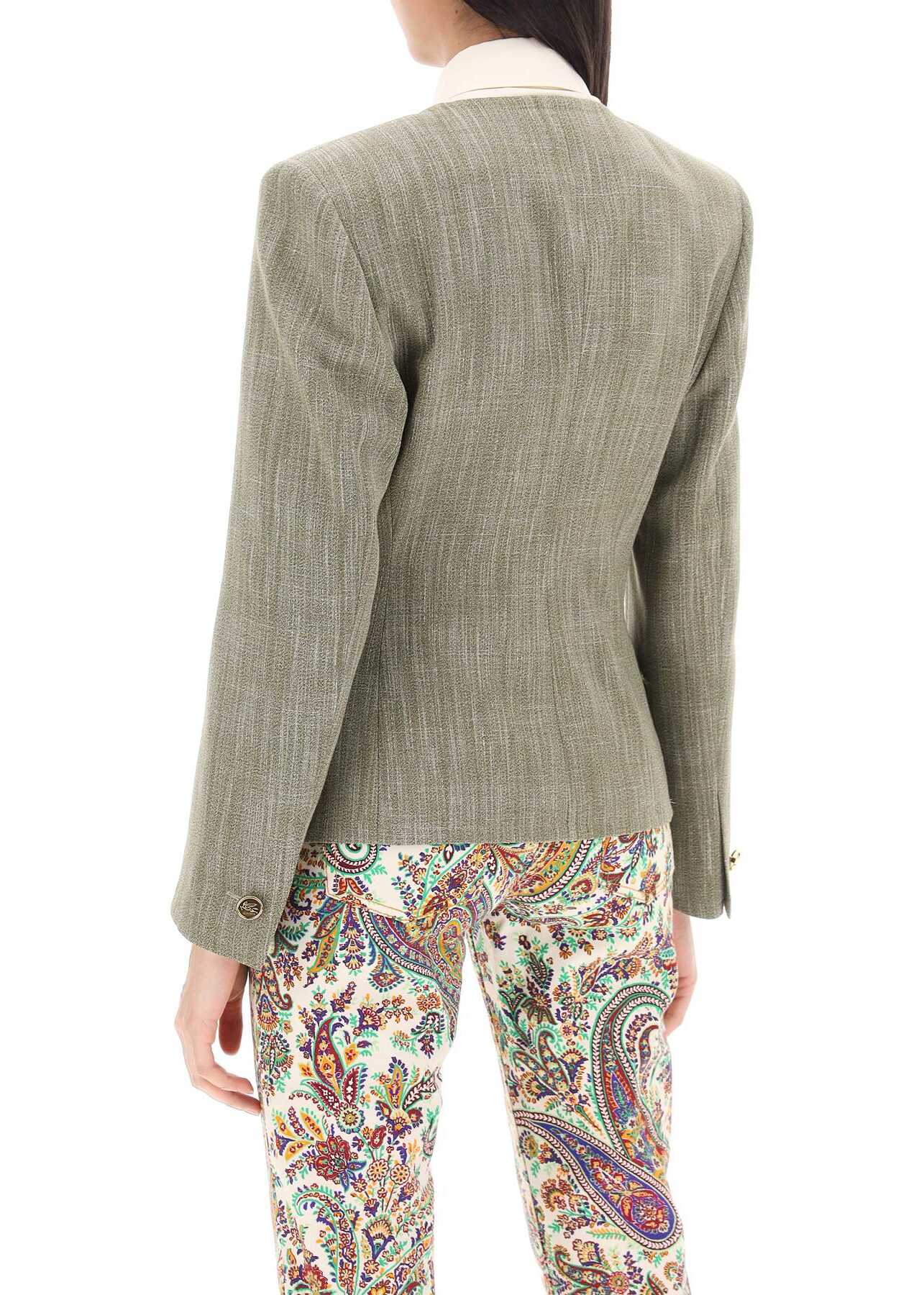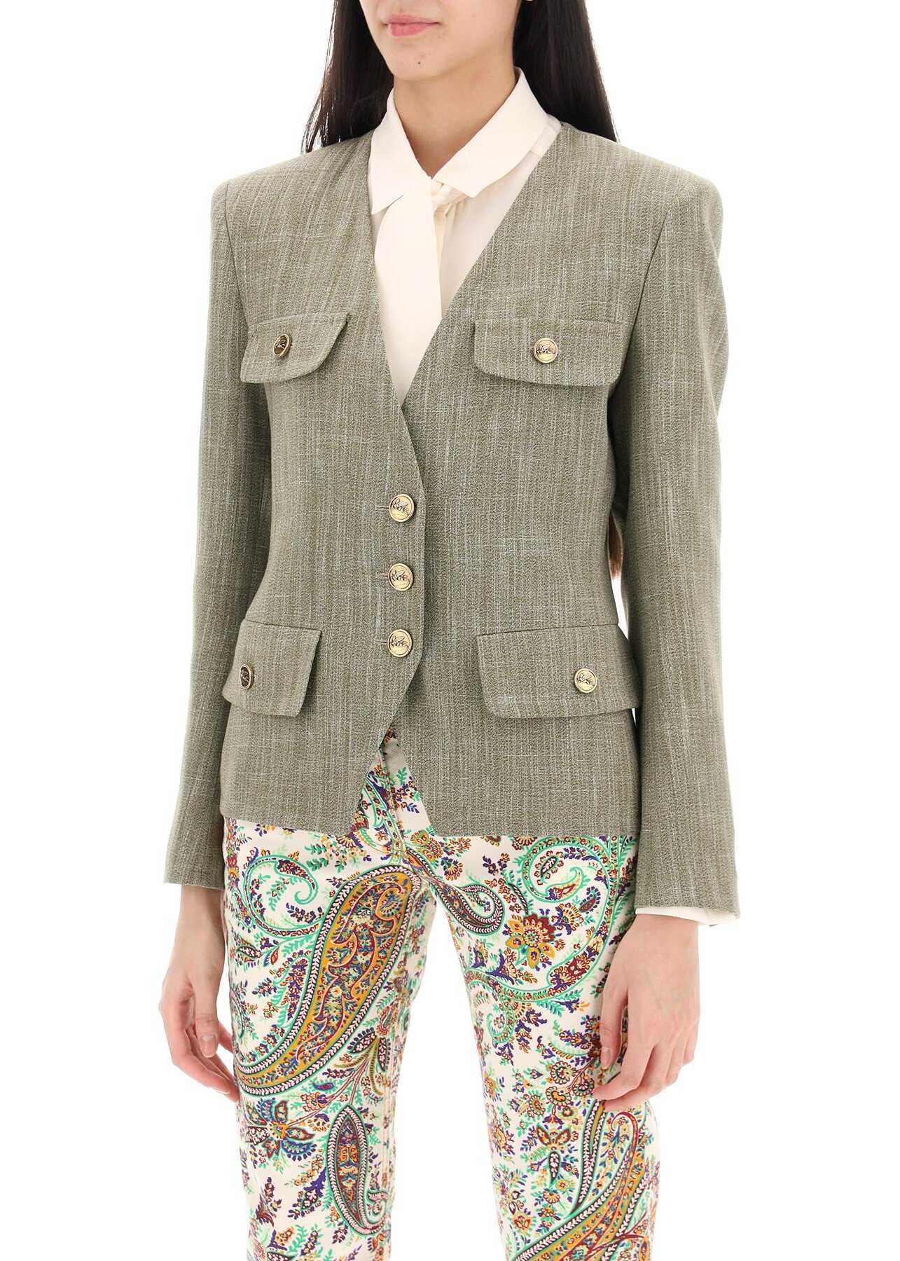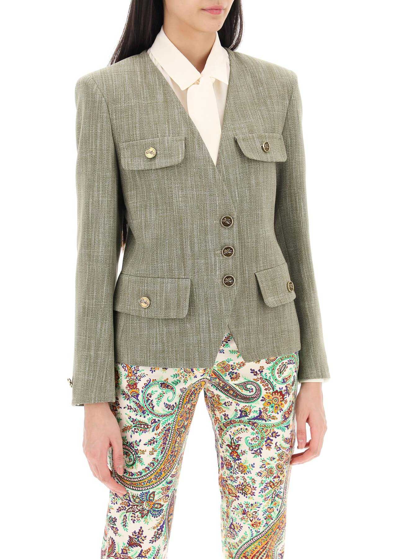 This single-breasted jacket by Etro is made of a viscose blend fabric with a fil-Ã -fil weave. It features a button closure, flap pockets, and Pegasus-shaped gold metal buttons on the cuffs. The V-neckline adds a touch of elegance. The interior is lined with striped logo fabric. The tailored cut includes padded and structured shoulders. The model is 177 cm tall and wears an Italian size 40.