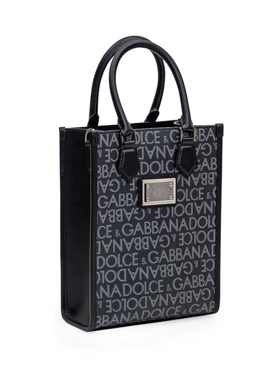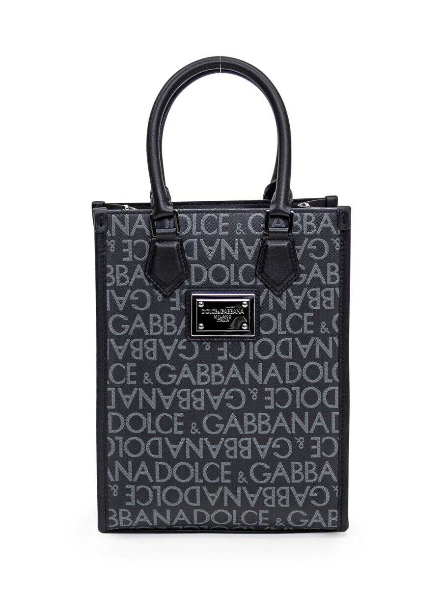 Black logoed shopping bag front and back. Two leather handles. Adjustable and removable shoulder strap. Inside zipper pocket. Button closure. Logo plaque on front. Width:20 Height:26 Depth:9