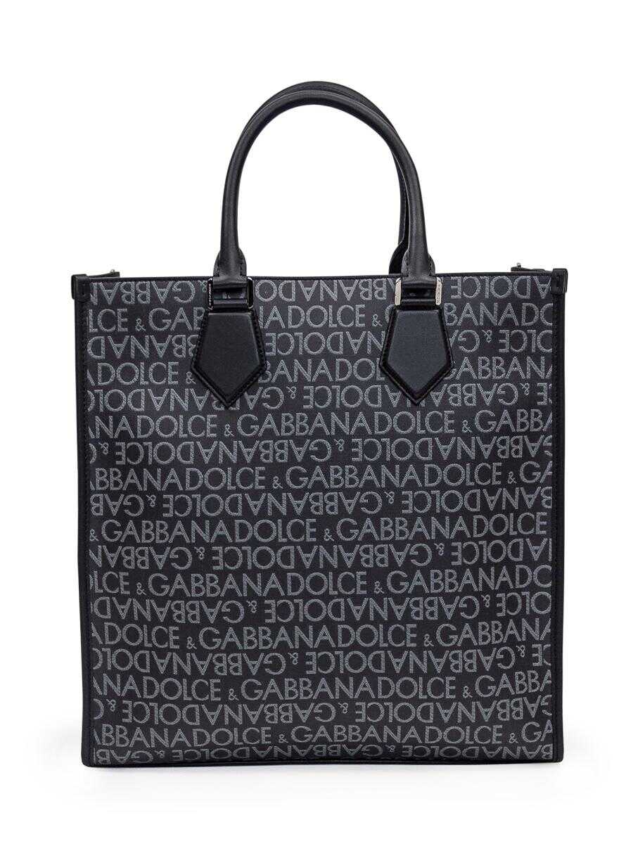 Black logoed shopping bag front and back. Two leather handles. Adjustable and removable shoulder strap. Inside zipper pocket. Button closure. Logo plaque on front. Width:37 Height:38 Depth:10