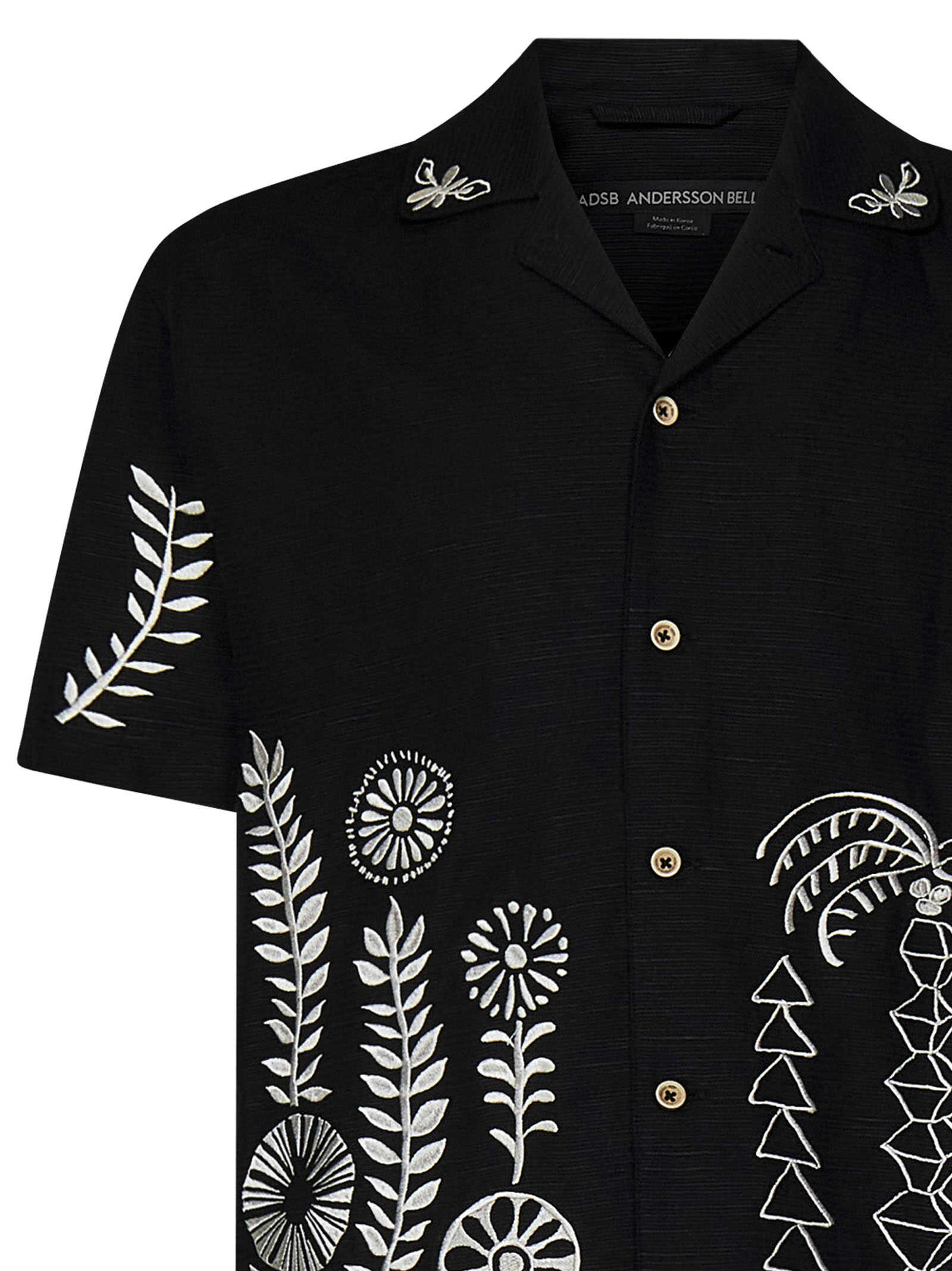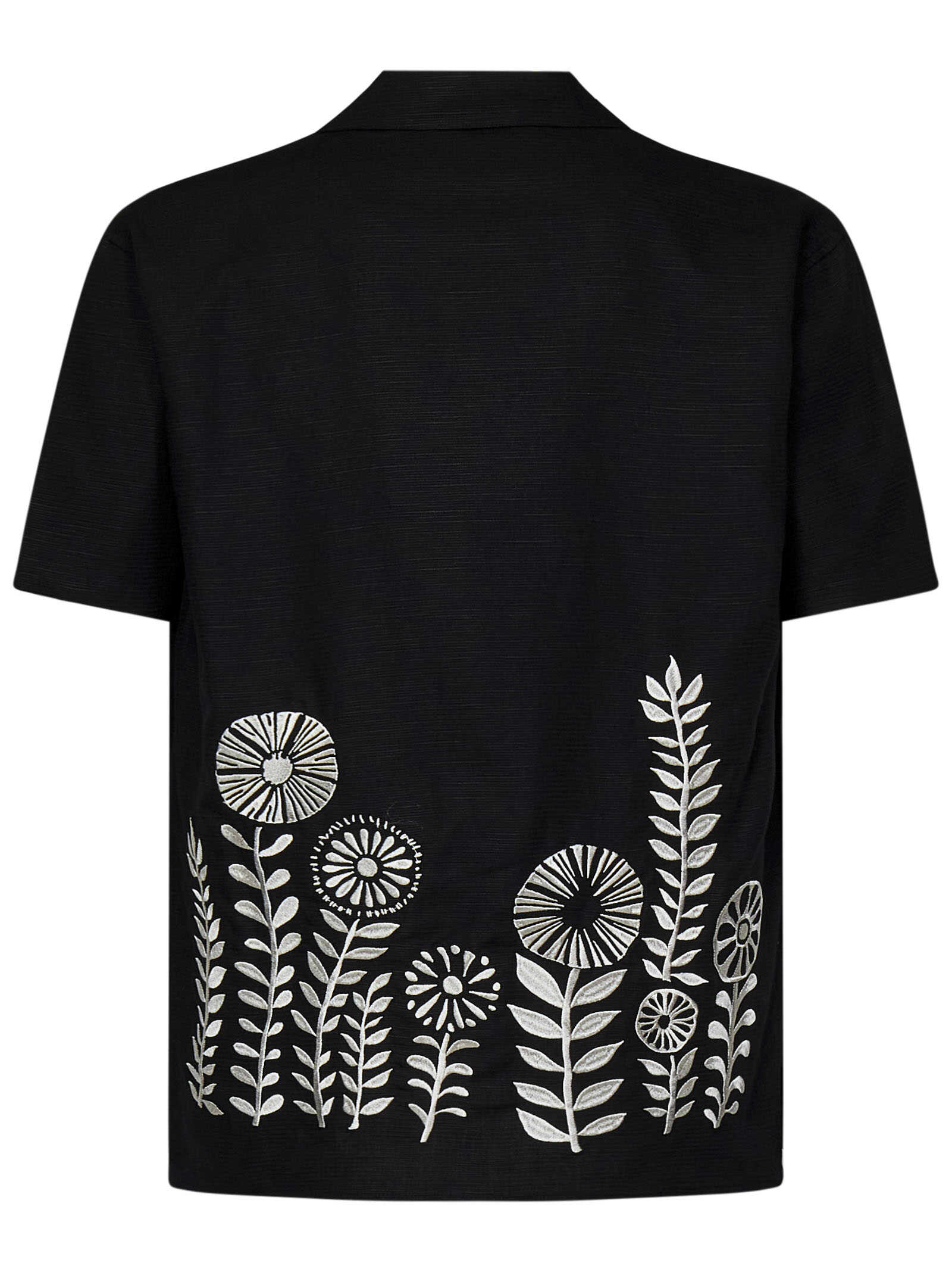 Black short-sleeved shirt in linen and cotton blend with all-over white embroidery.
