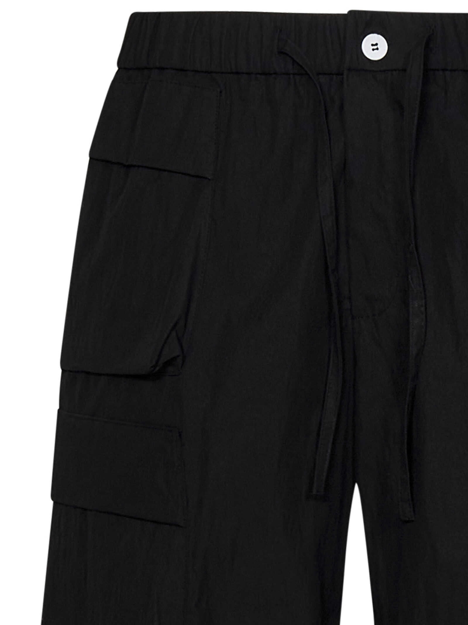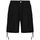 Black cotton cargo shorts with drawstring at the waist and hem.