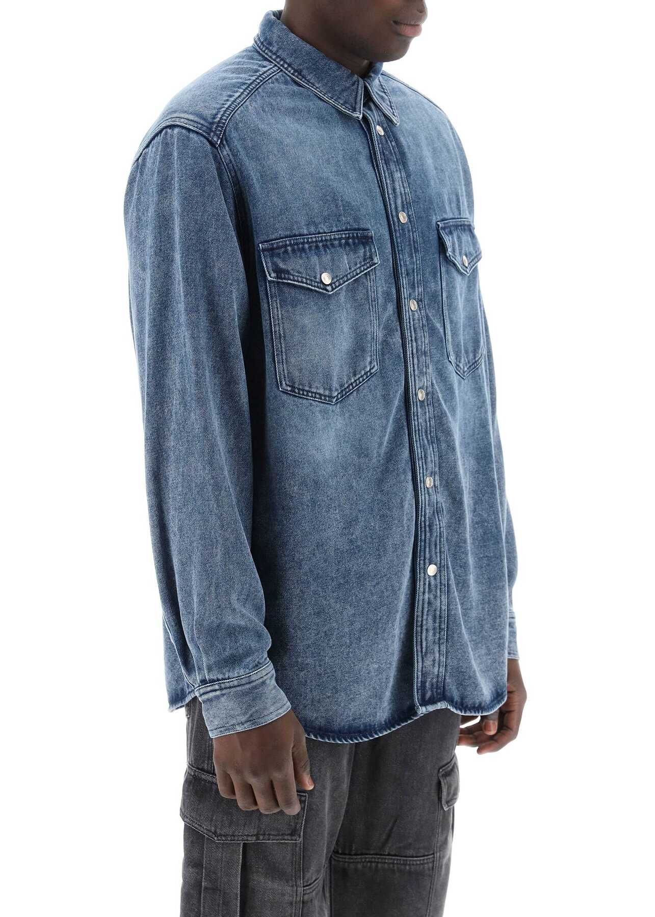 Overshirt di Marant realizzata in morbido denim di misto lyocell e cotone con lavaggio minerale. Presenta colletto classico, abbottonatura americana con automatici logati, tasche a toppa con pattina sul petto, polsini abbottonati e fondo sagomato. Fit regolare con taglio leggermente boxy. Il modello è alto 187 cm e indossa una taglia L.