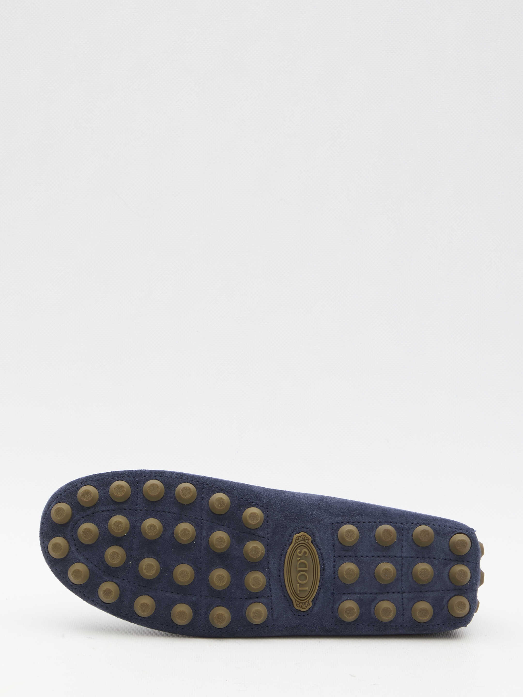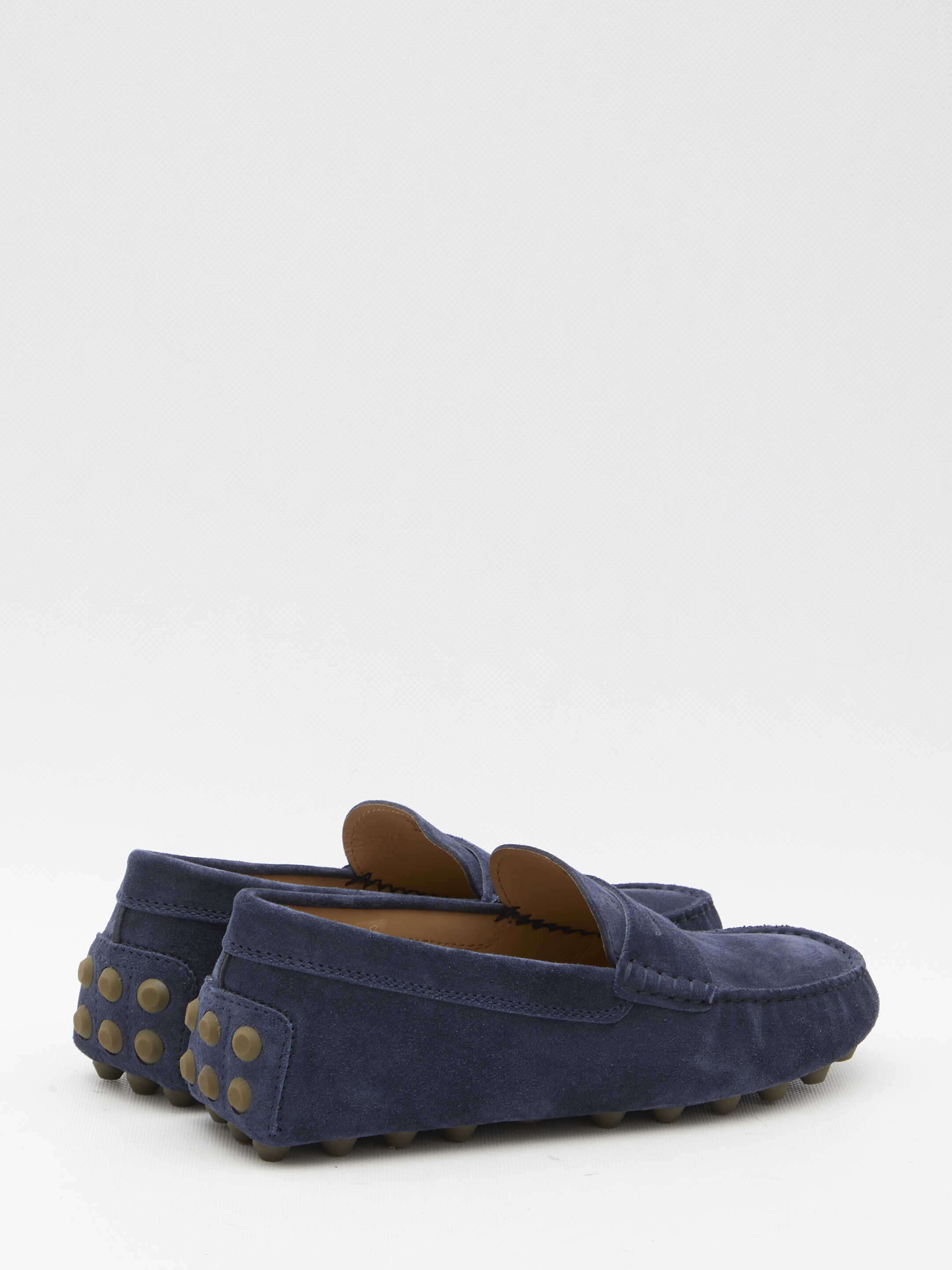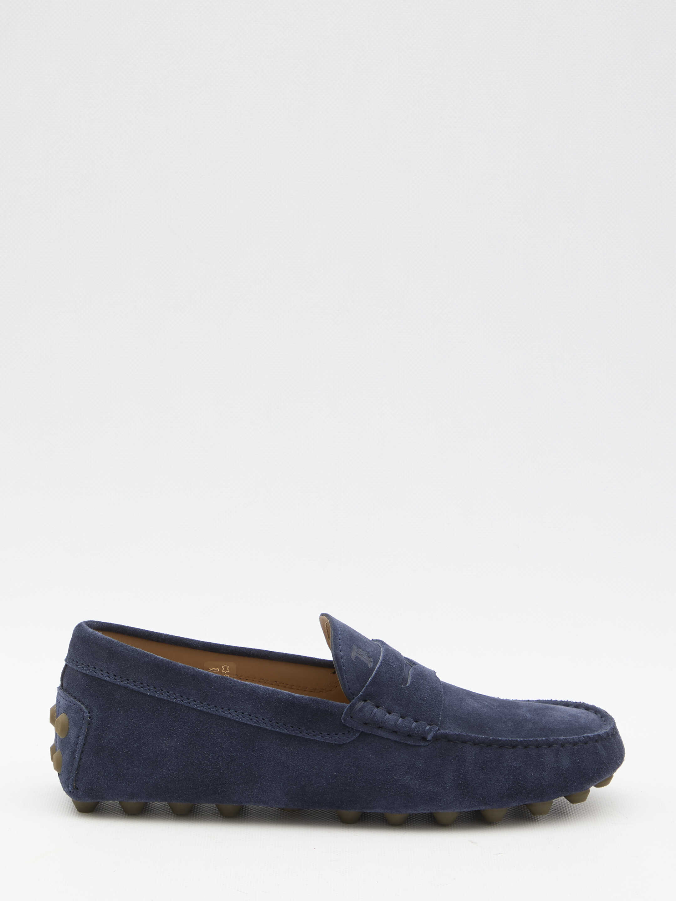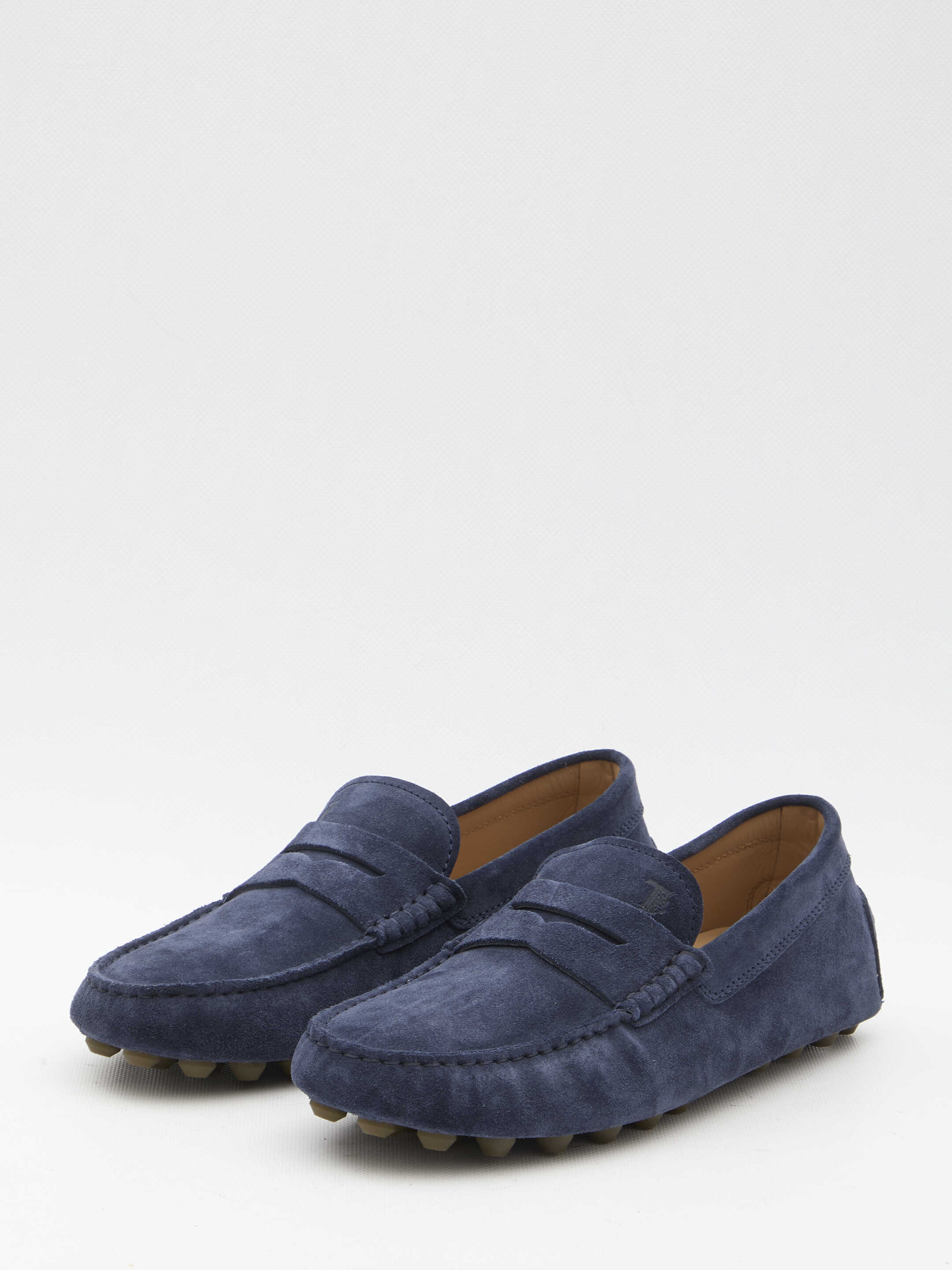 Macro 52K Gommino loafers in blue suede with embossed Tod's monogram on the upper and exposed handmade stitching. Rubber pebble detailing on the heel and iconic rubber pebble outsole.