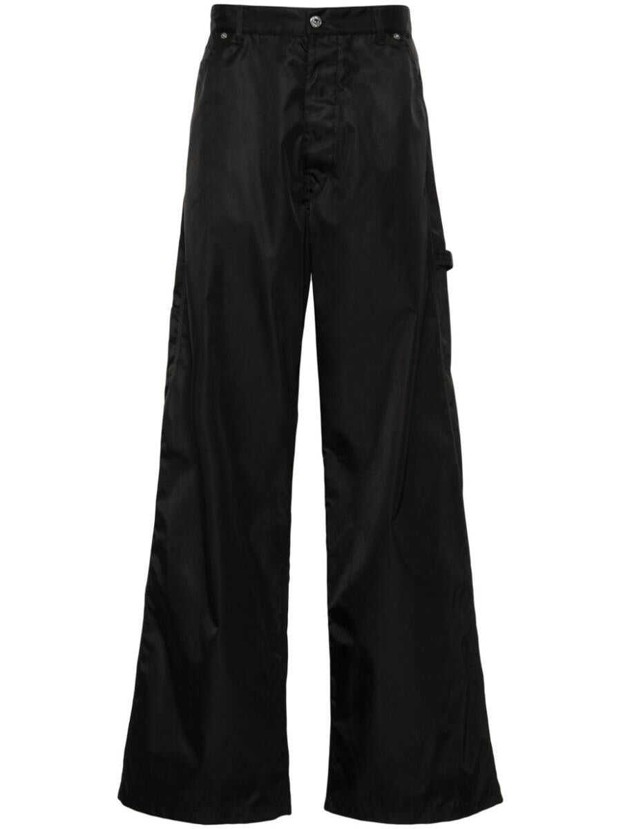 black recycled polyamide blend taffeta belt loops two diagonal pockets to the sides side patch pocket two rear patch pockets tool loop signature Arrows motif embroidered to the rear wide leg concealed fly and button fastening This item is made from at least 50% recycled or upcycled materials. For recycled synthetic clothing products, we highly recommend using a microfibre-catching washing bag to ensure that no microplastics that can pollute water are released in the process. Learn more about what makes a product Conscious on our Conscious Criteria page