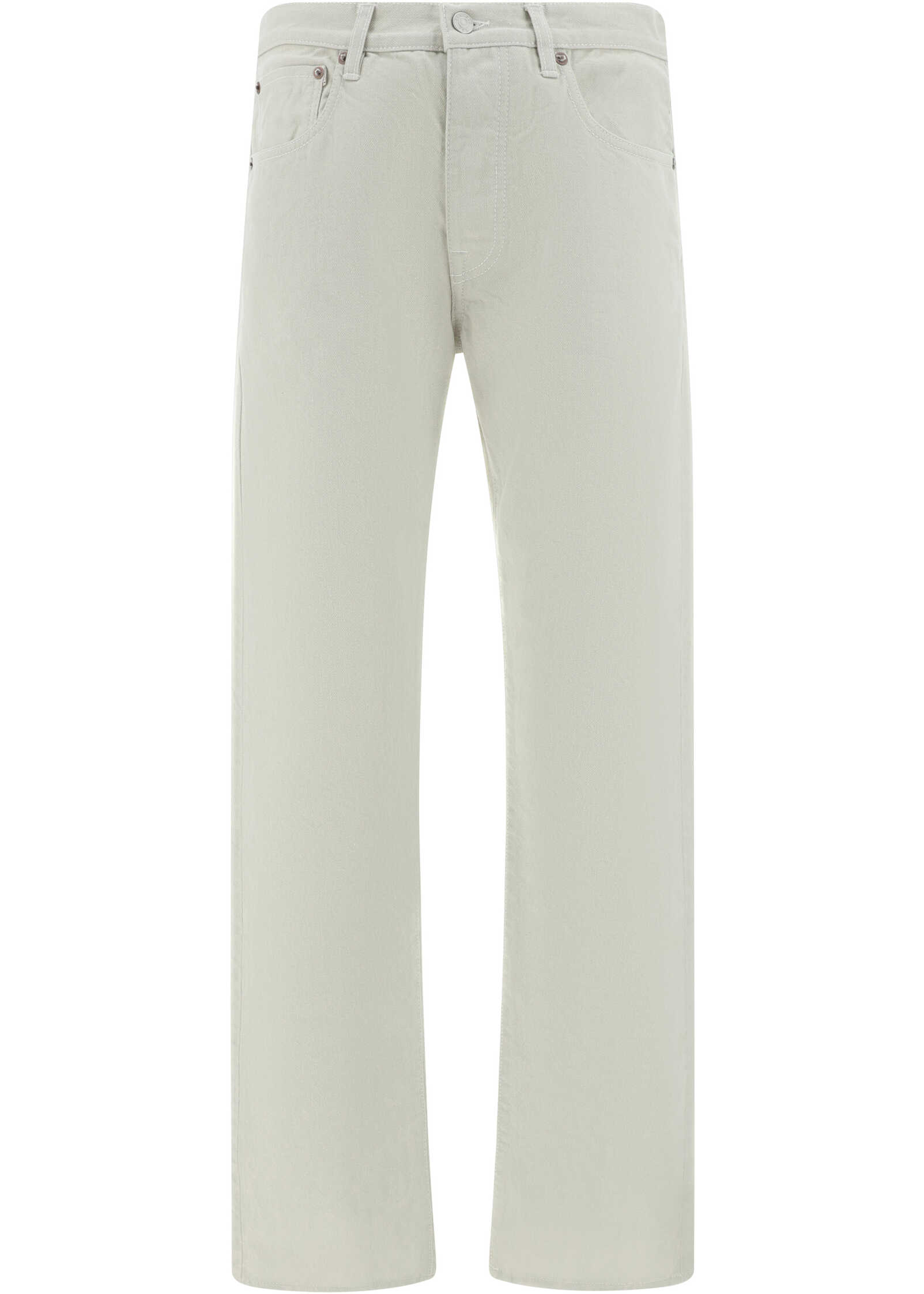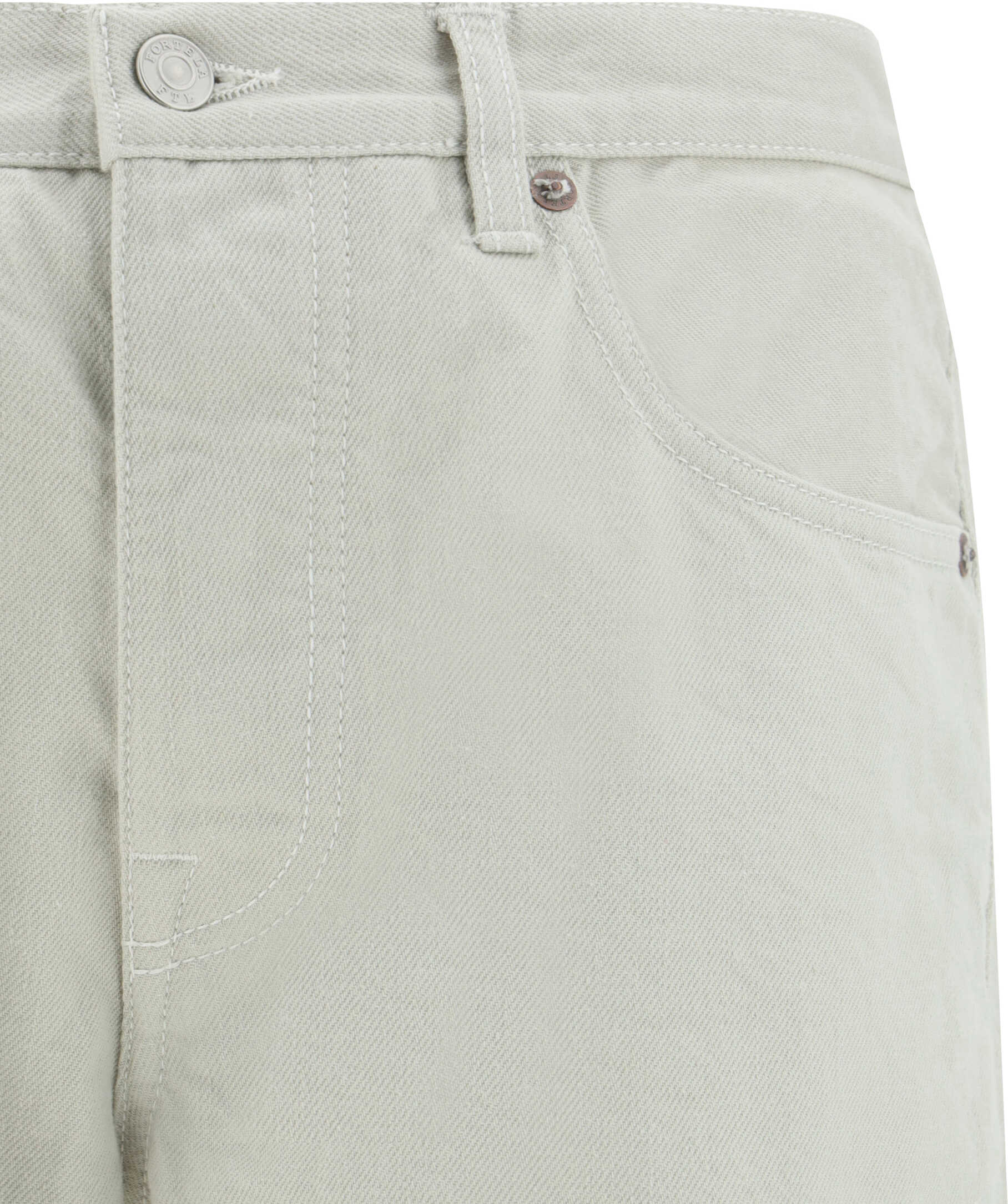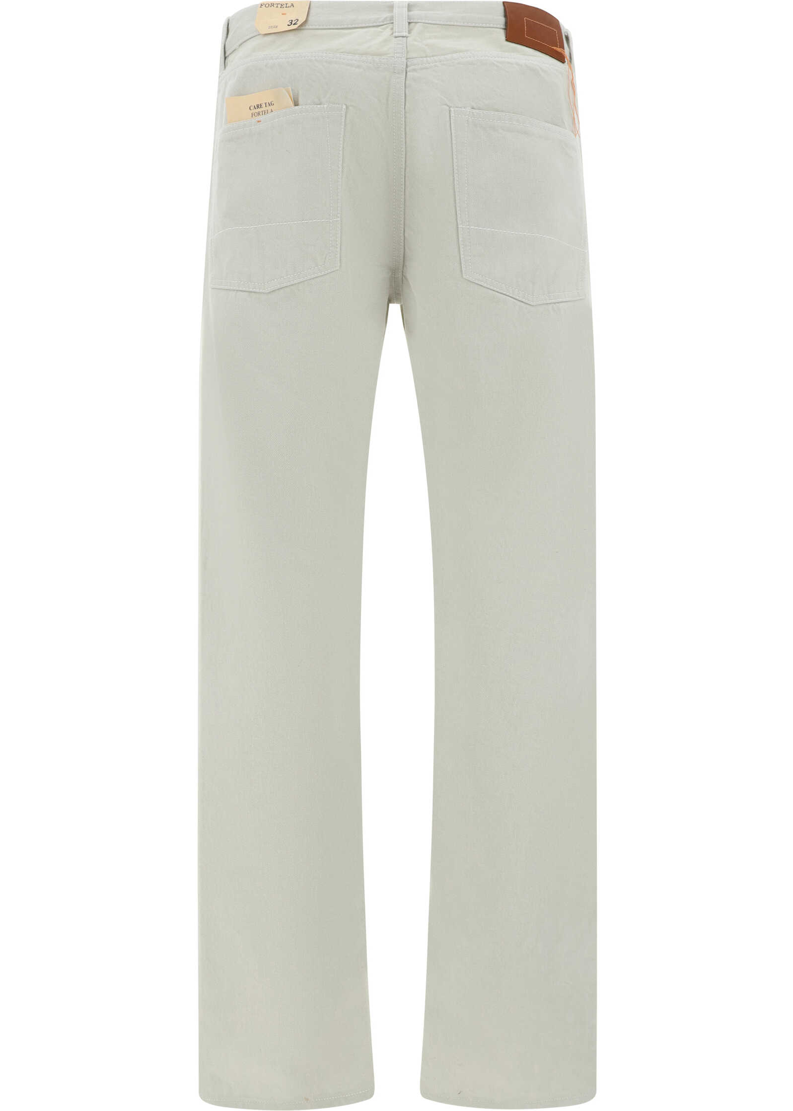 Cotton Pants by Fortela, five-pocket straight style, denim design, front button closure, belt loops waistband, iconic leather patch with signature brand pressure print applied at back, monochrome pattern, regular fit.