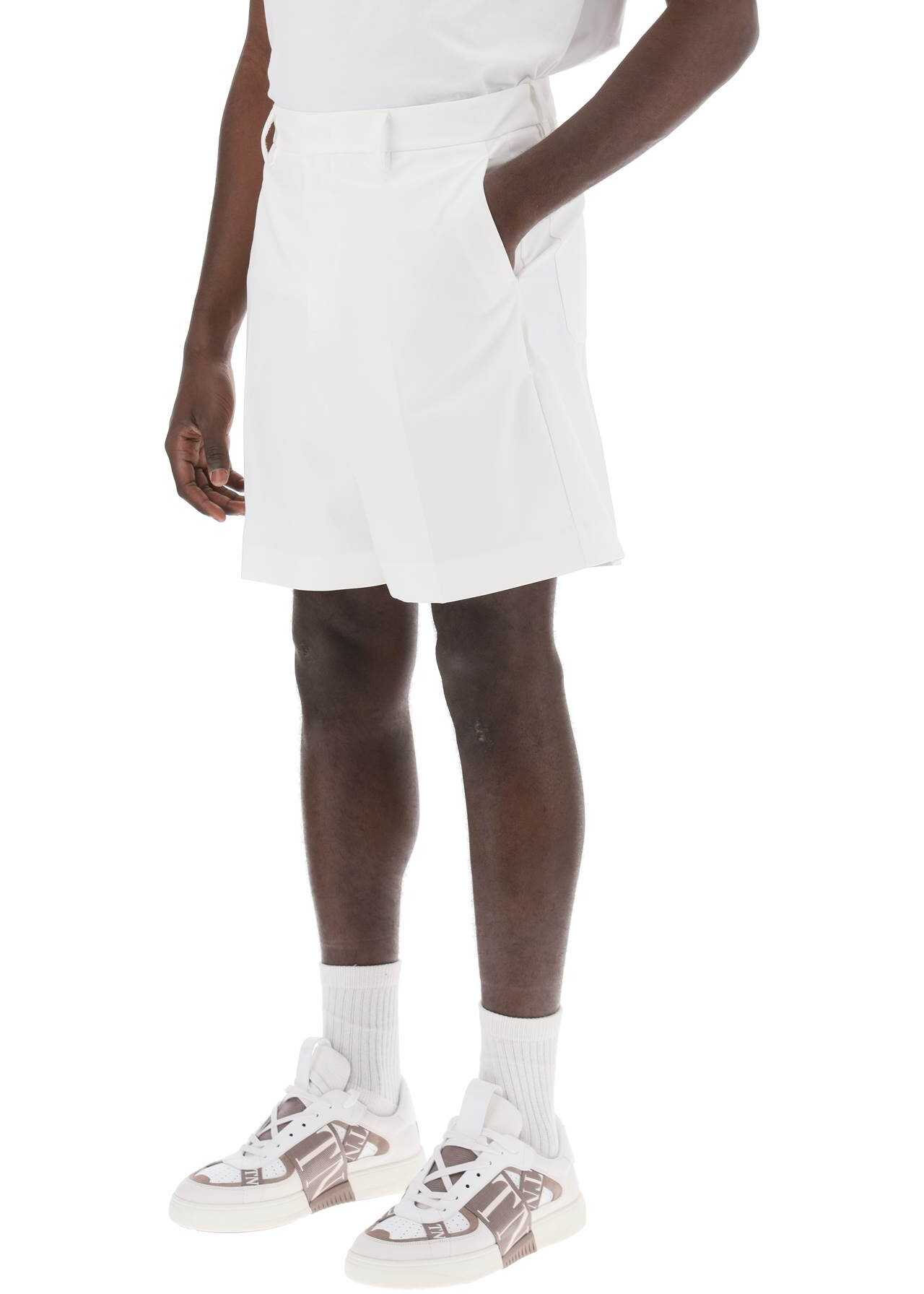 Valentino Bermuda shorts made of pure cotton poplin with pressed pleats on the front and back. They feature belt loops, a zip and concealed button closure, slanted side pockets, and two patch pockets on the back. Regular fit. The model is 187 cm tall and wears size IT 48.