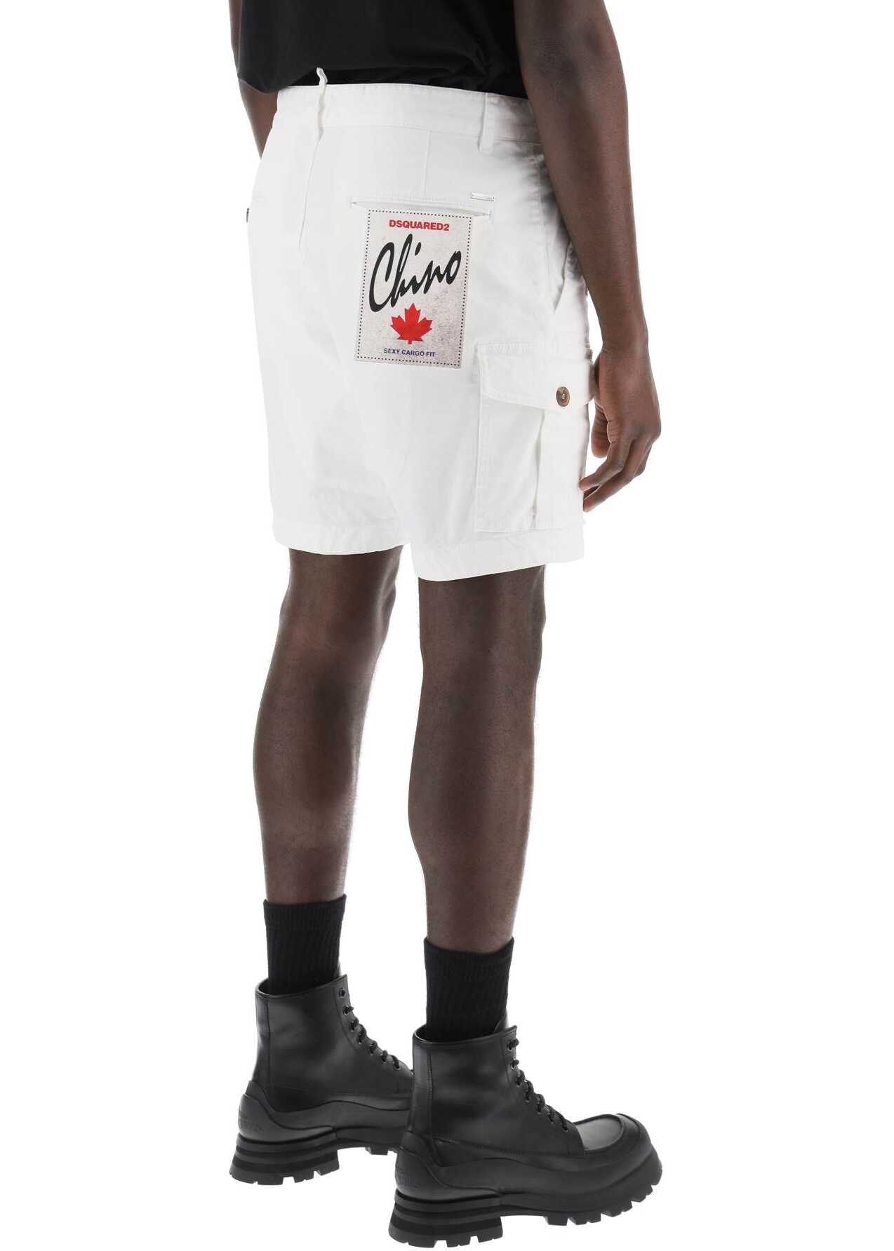 These Dsquared2 Bermuda shorts are made of stretch cotton twill, featuring a cargo-style design with flap pockets on the legs. They have hidden logo buttons for closure, French side pockets, belt loops, and back welt pockets with a button. The slim fit has a tapered Sexy Cargo cut. The model is 187 cm tall and wears an IT size 48.