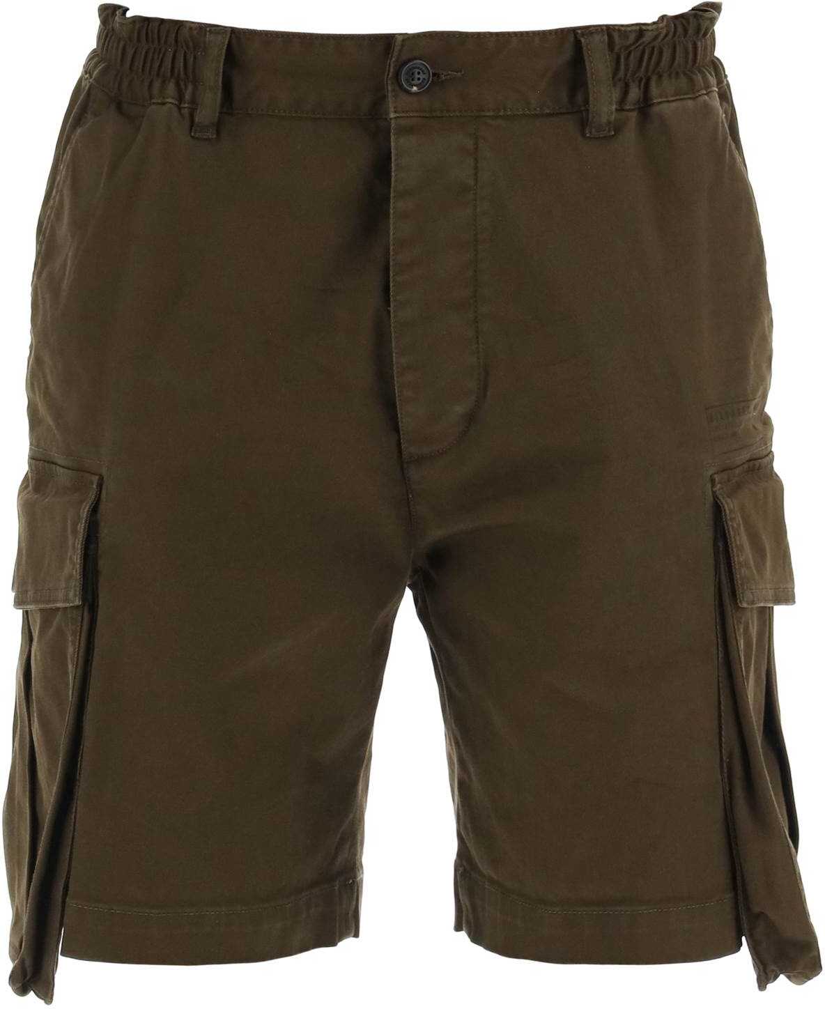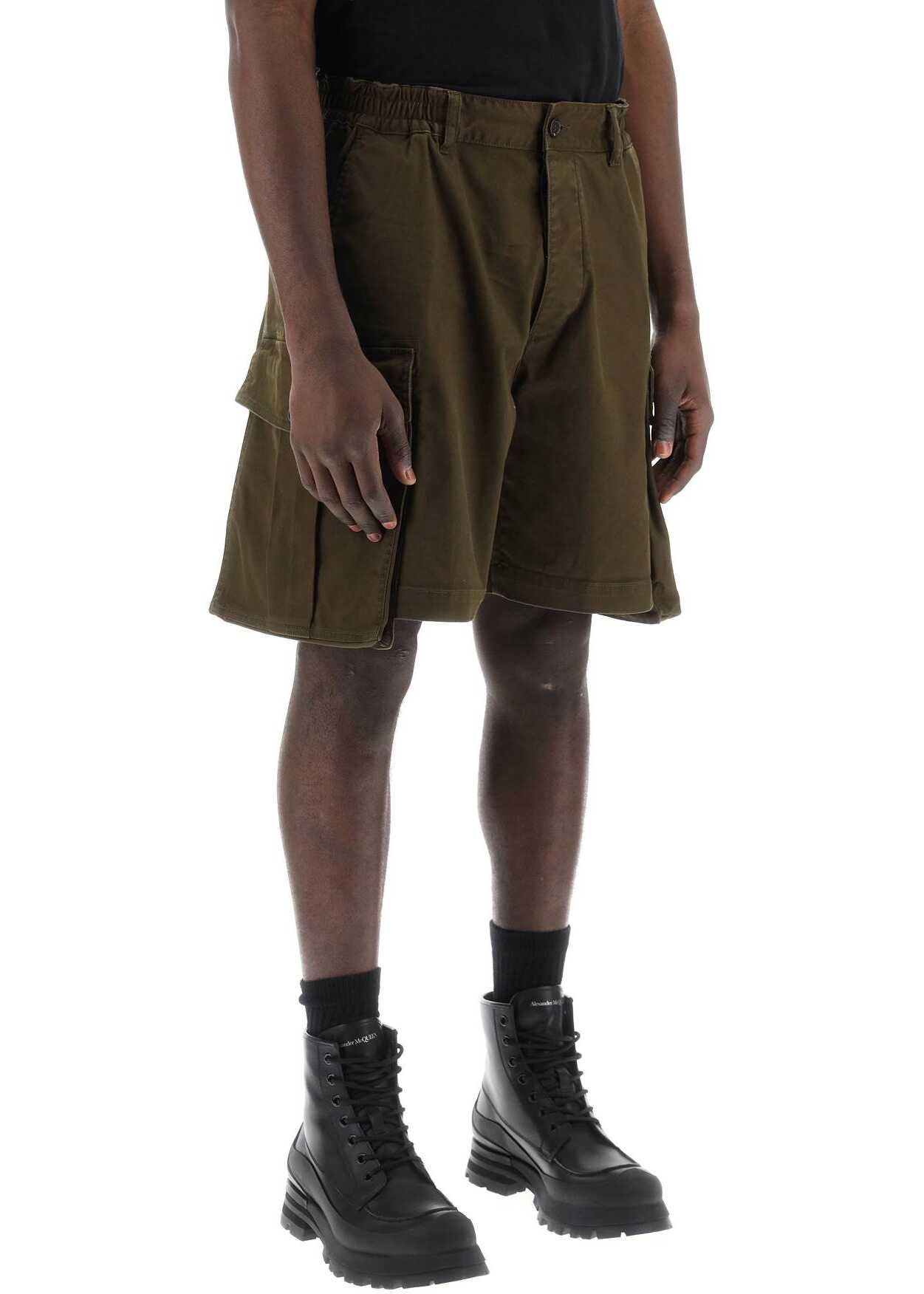 These Dsquared2 Bermuda shorts are made of stretch cotton twill, featuring a cargo-inspired design with flap pockets on the legs and finished with a small Urban 64 print on the front. They have a hidden button closure, a semi-elasticated waistband with belt loops, side French pockets, and back welt pockets with buttons. The fit is relaxed with a straight cut. The model is 187 cm tall and wears an IT size 48.