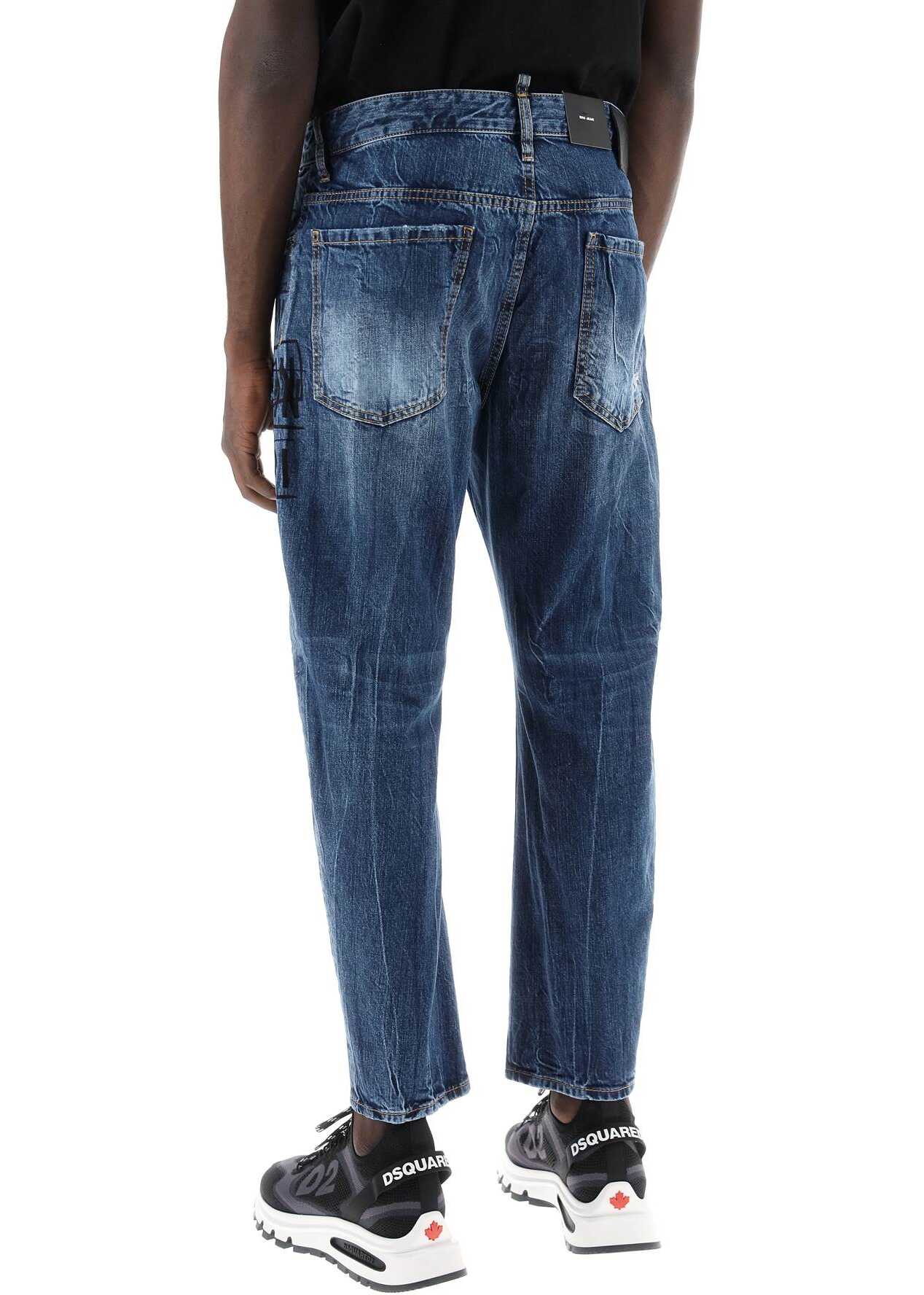 Dsquared2 Bro Jeans made of pure cotton denim, with Icon Dark Stamps wash featuring distressed details and lettering print on the thigh. Five-pocket model with regular fit and low crotch, it has hidden logo buttons closure, belt loops and a leather logo patch on the back waistband. The model is 187 cm tall and wears an IT size 48.