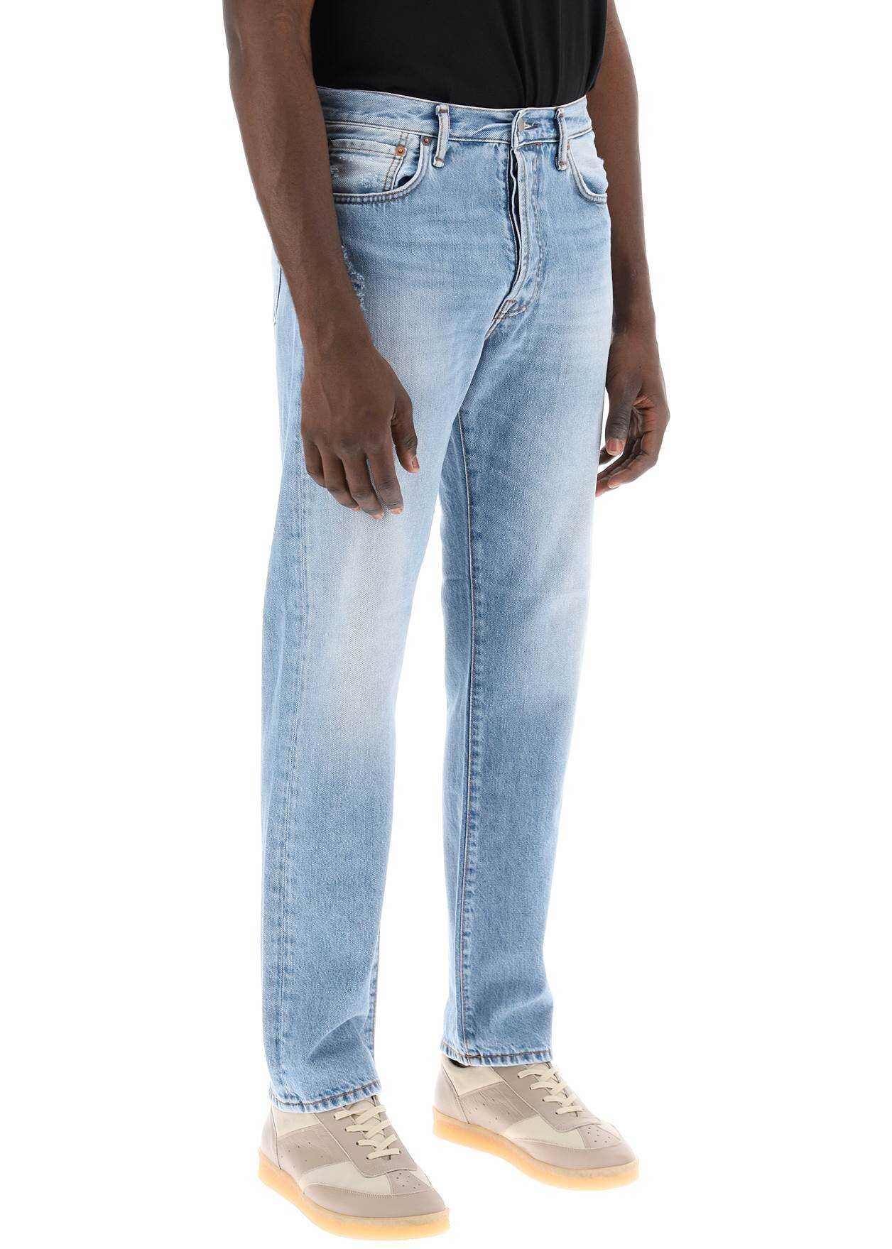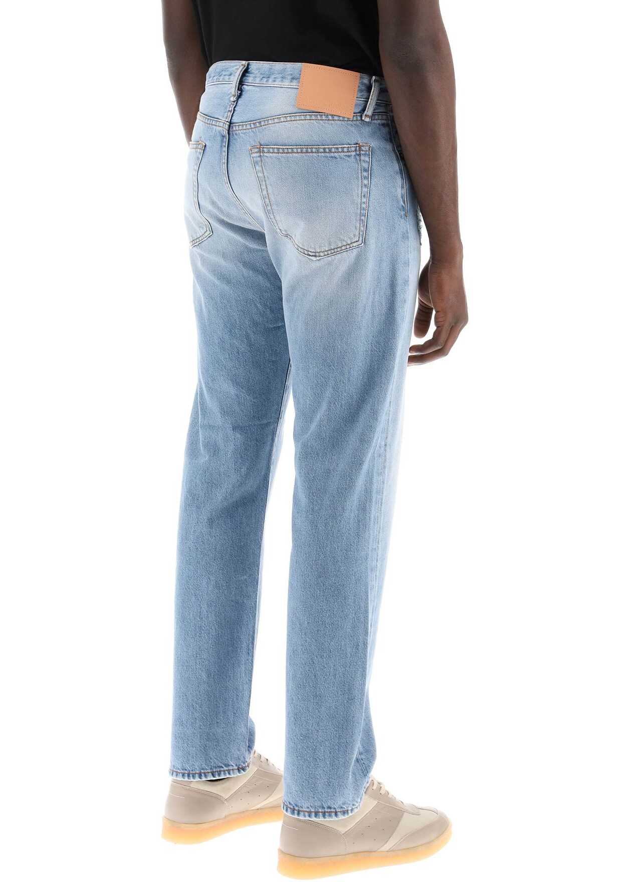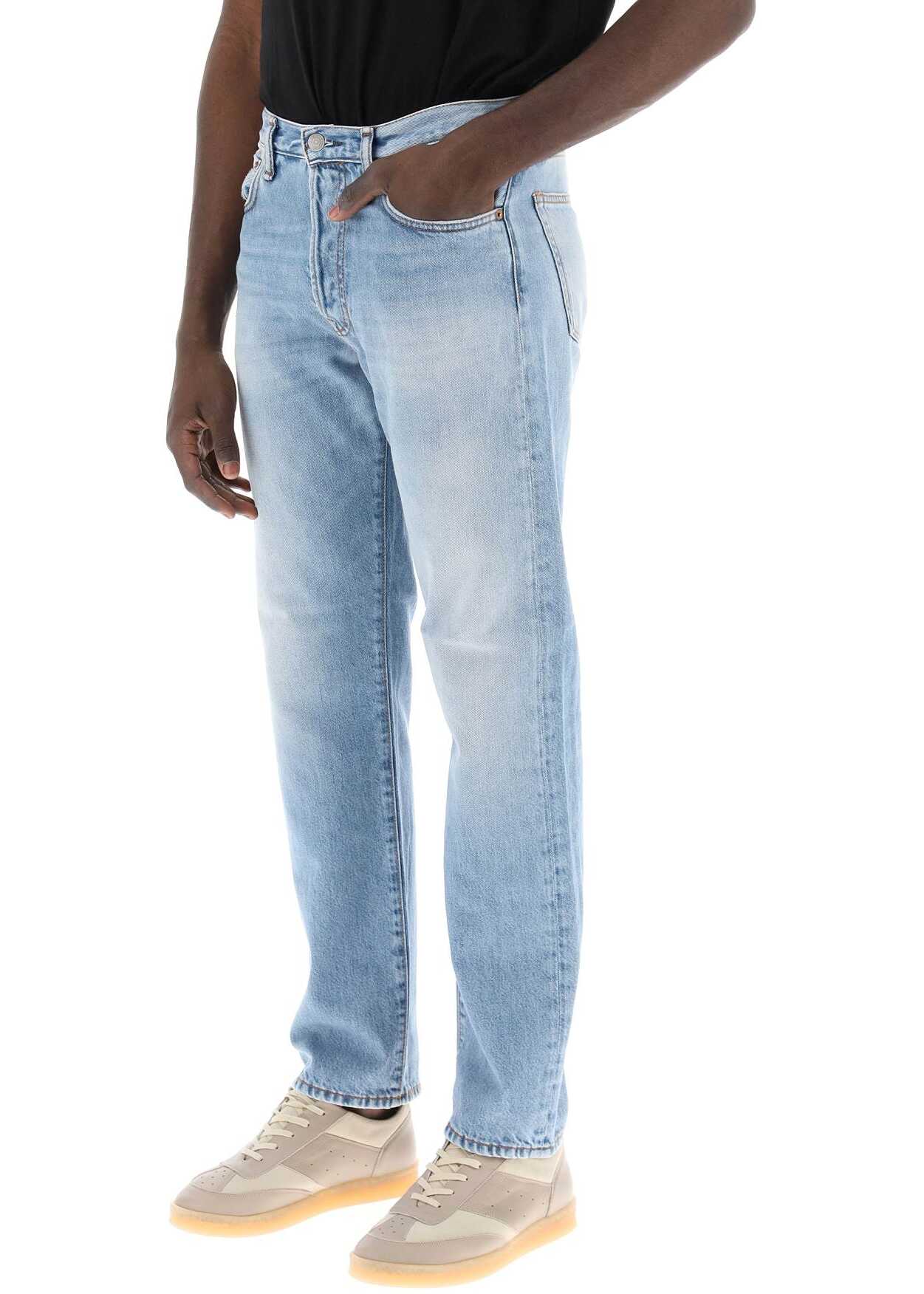 The 1996 Jeans by Acne Studios are made of organic cotton denim with a vintage light wash. Featuring a classic five-pocket design, these jeans have a straight and regular fit, with hidden logo buttons for closure, belt loops, and a leather logo patch on the back waistband. The model is 187 cm tall and wears a size 31.